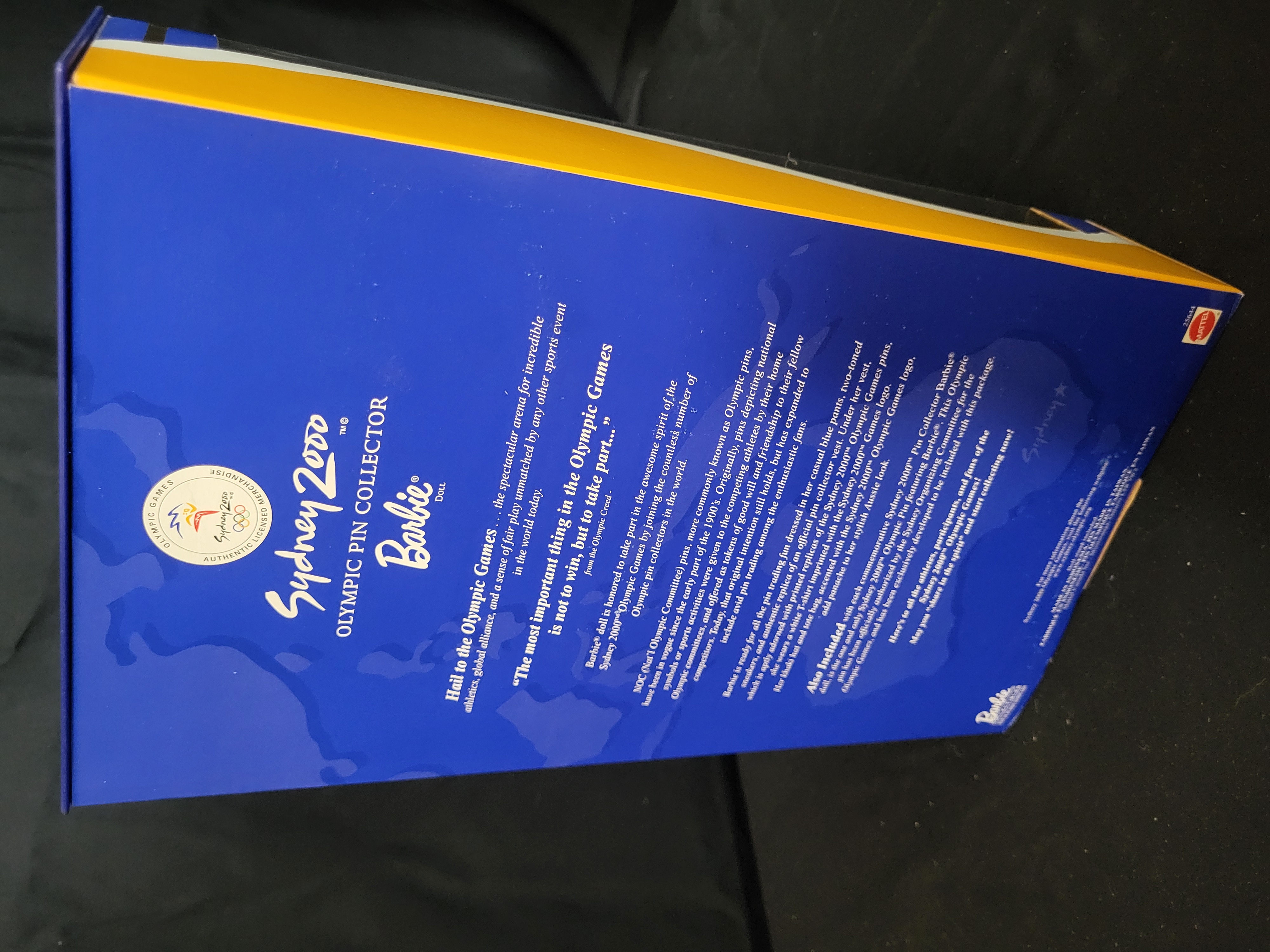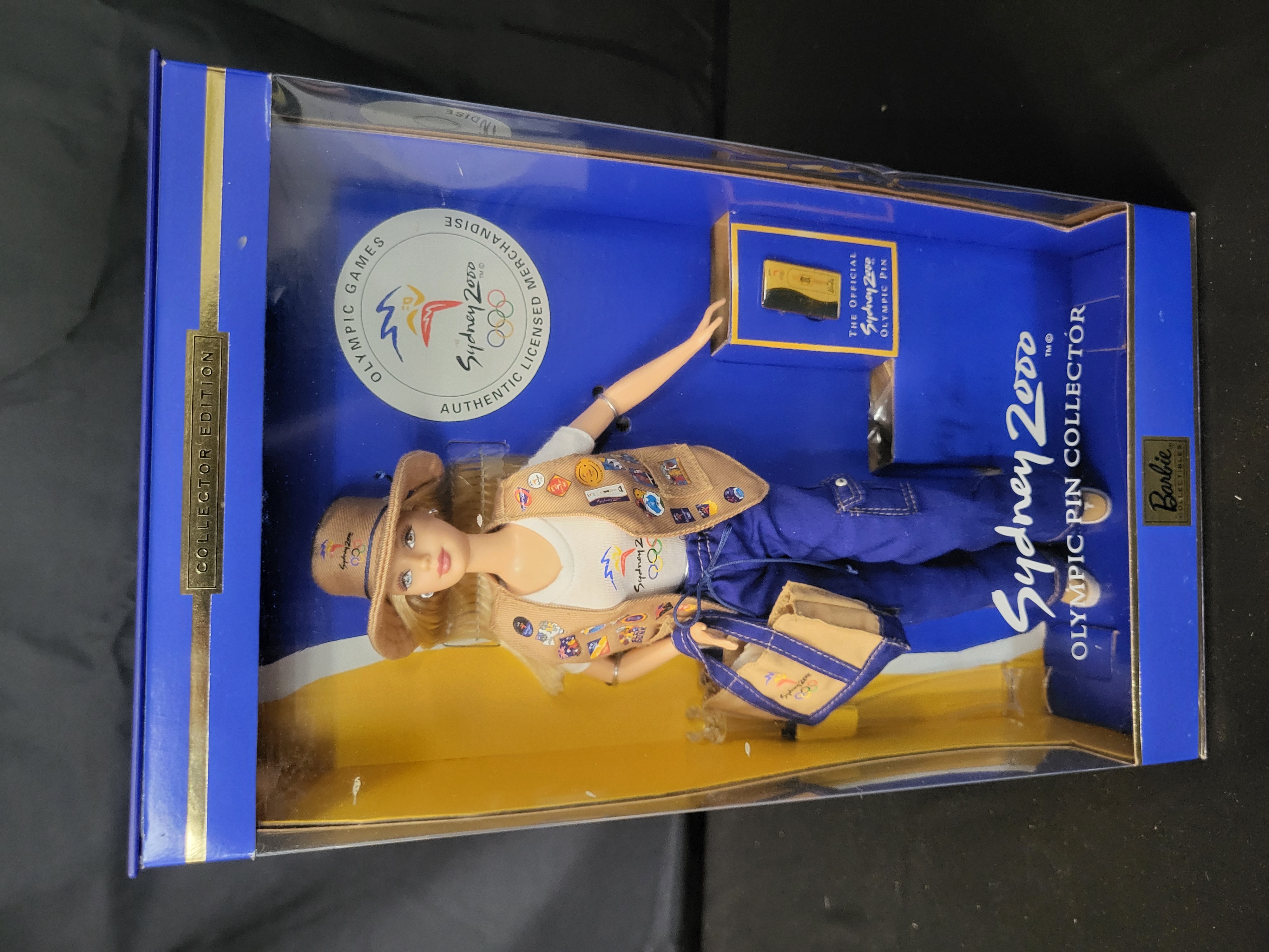 BID PER WHAT YOU SEE IN THE PHOTO, NOT THE AI GENERATED TITLES AND DESCRIPTIONS! A Mattel Sydney 2000 Olympic Pin Collector Barbie doll, model number 25644, released in 1999 as a Collector Edition. The doll is presented in its original factory packaging featuring official Sydney 2000 Olympic Games licensed merchandise branding. The figure is dressed in a white t-shirt with the Olympic logo, blue trousers, and a tan vest printed with various Olympic pins. Included accessories are a coordinating tan hat, a shoulder bag, and a separate boxed Official Sydney 2000 Olympic Pin. The packaging is constructed of a royal blue and yellow cardboard box with a clear plastic display window. The reverse of the box displays promotional text regarding the Olympic Games and the Olympic Creed.