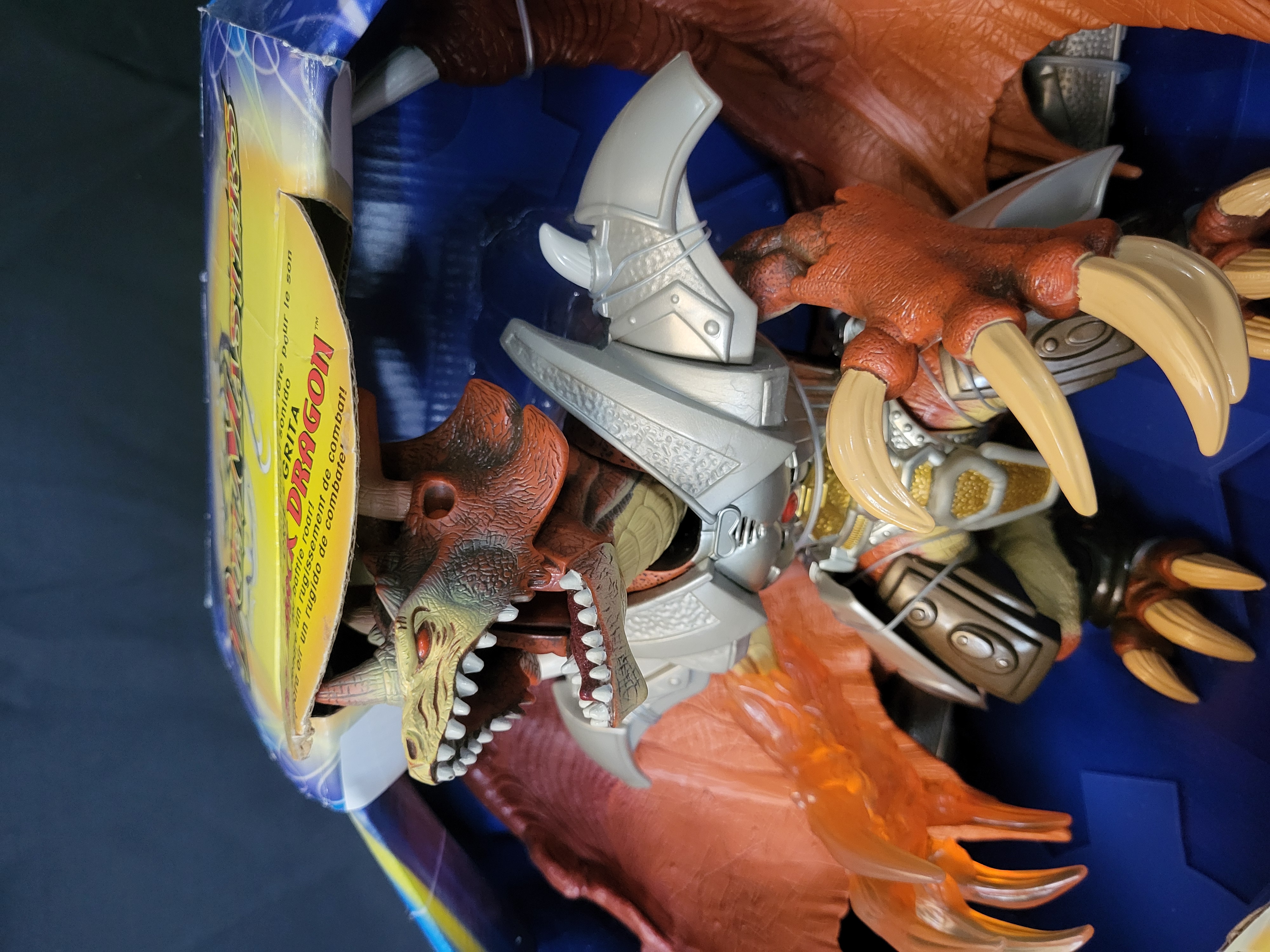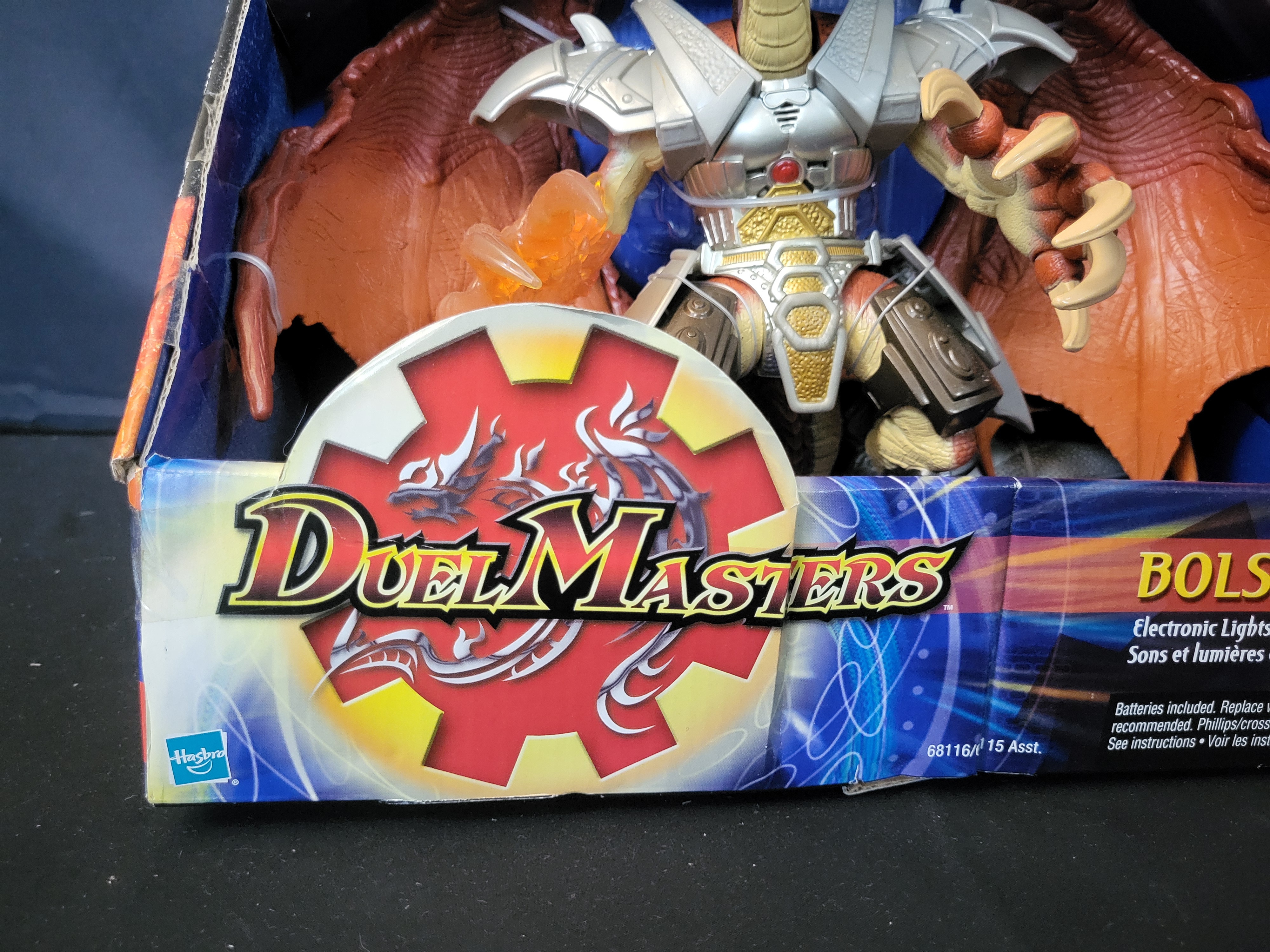 BID PER WHAT YOU SEE IN THE PHOTO, NOT THE AI GENERATED TITLES AND DESCRIPTIONS! A Hasbro Duel Masters Bolshack Dragon Deluxe Electronic Action Figure. This large-scale plastic figure features a draconic design with orange wings, silver- and gold-toned armor, and large talons. According to the packaging, the figure includes electronic lights and sounds, a firing flame projectile, folding wings, and poseable limbs. The item is housed in its original retail packaging bearing the Duel Masters, Hasbro, and Wizards of the Coast logos, with text presented in English, French, and Spanish. The figure remains secured within the internal cardboard mounting.