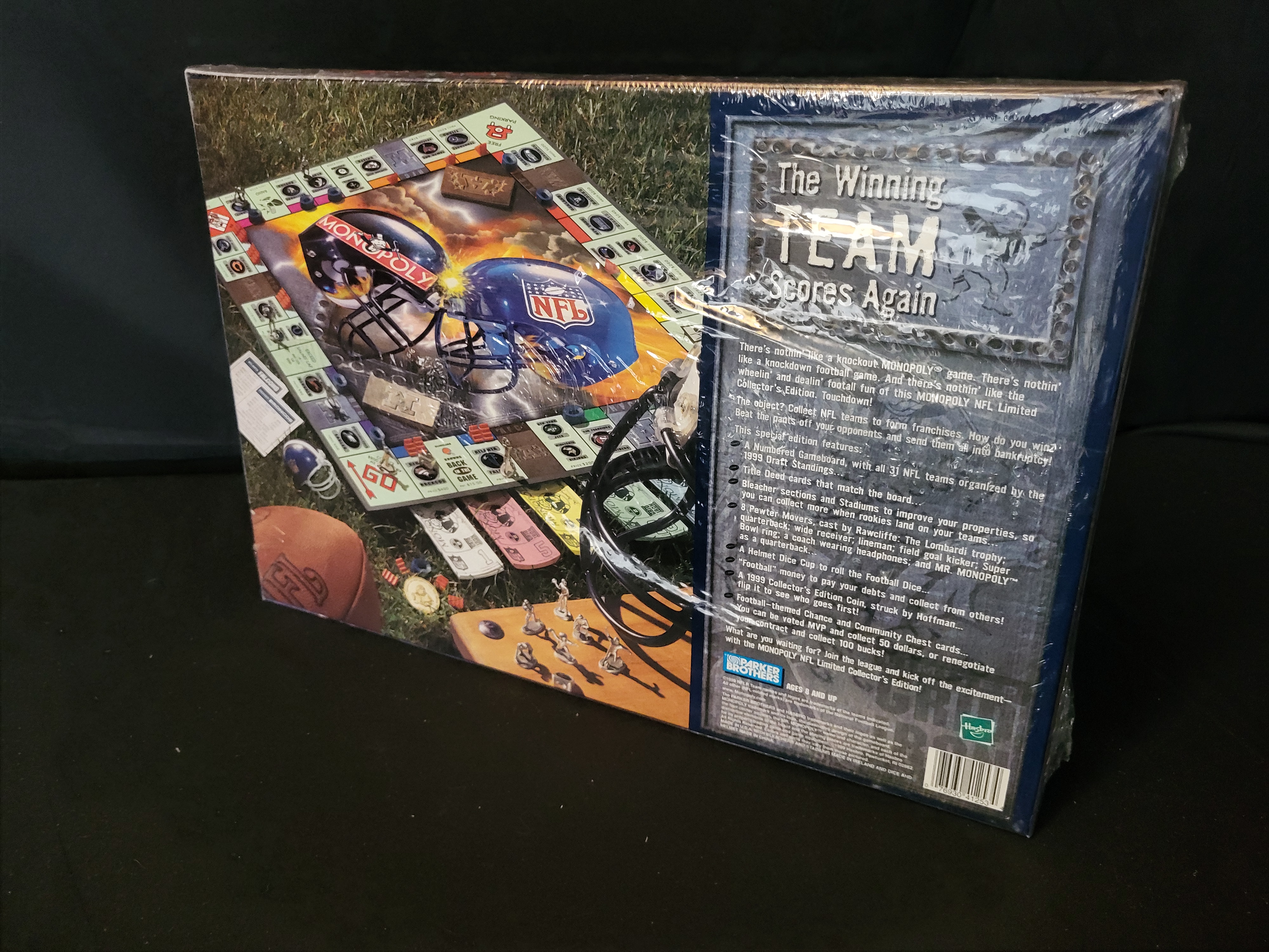 BID PER WHAT YOU SEE IN THE PHOTO, NOT THE AI GENERATED TITLES AND DESCRIPTIONS! A factory-sealed Monopoly Limited 1999 NFL Grid Iron Edition board game produced by Parker Brothers. The exterior box features a graphic design depicting riveted industrial metal plates, decorated with various NFL team logos and a central NFL shield. As detailed on the reverse of the packaging, the game components include a themed gameboard featuring 31 NFL teams organized by 1999 draft standings, eight collectible pewter tokens cast by Rawcliffe, a helmet-shaped dice cup, football-themed dice, and a 1999 collector edition coin struck by Hoffman. The set also contains custom football-themed currency, property cards, and themed Chance and Community Chest cards. The item remains in its original manufacturer shrink wrap.