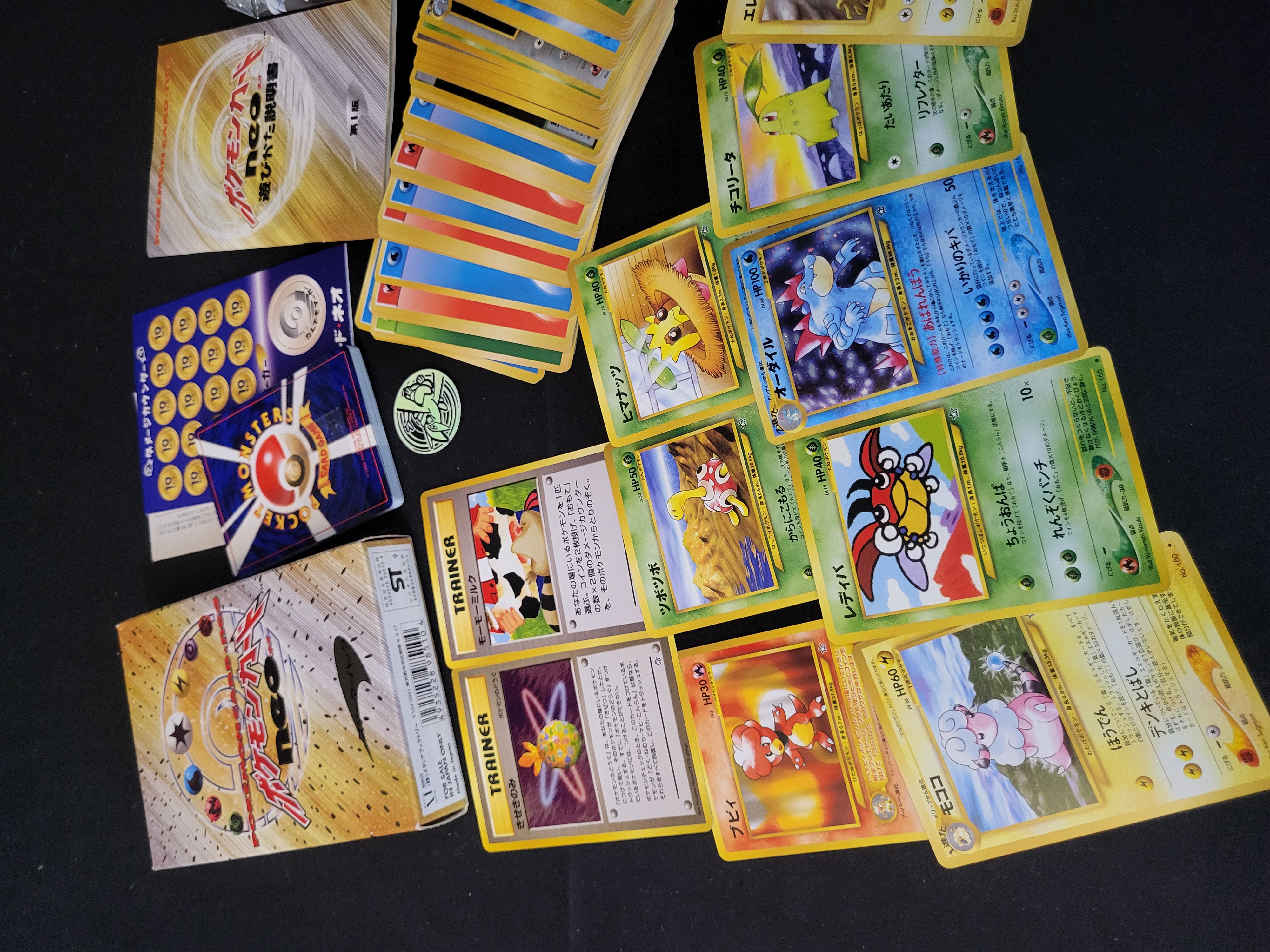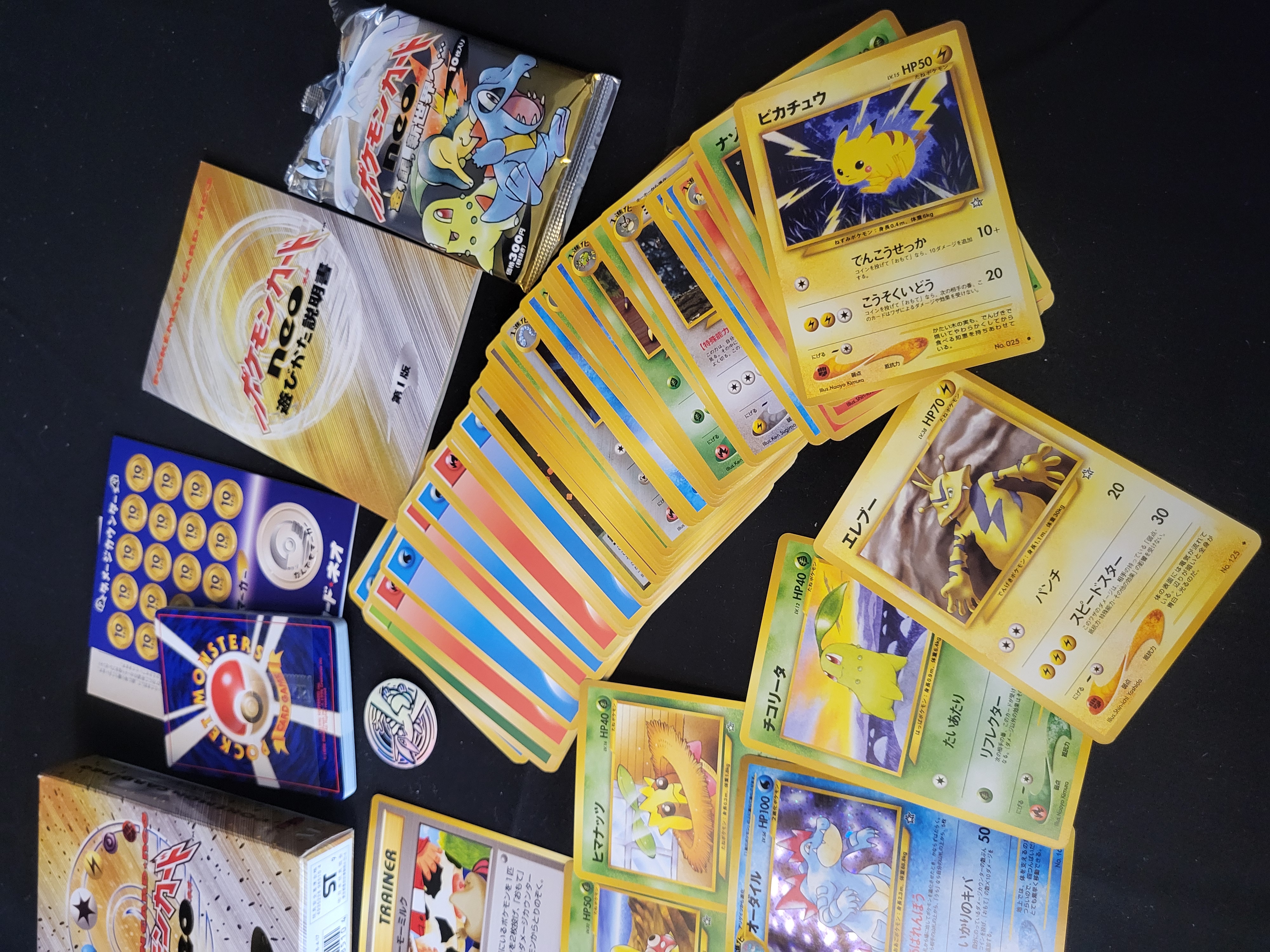 BID PER WHAT YOU SEE IN THE PHOTO, NOT THE AI GENERATED TITLES AND DESCRIPTIONS! This lot features a Japanese Pokemon Card Neo Genesis Starter Pack, released circa 2000. The collection includes the original illustrated cardboard box marked with the series logo and starter pack designation. Internal components consist of an instruction manual, a cardstock sheet of damage counters, and a holographic Lugia game coin. Also included is an unopened booster pack from the Gold, Silver, New World (Neo Genesis) series. The lot is accompanied by an assortment of individual trading cards, including characters such as Pikachu, Feraligatr, Electabuzz, and Chikorita, along with additional stacks of game and energy cards. The cards feature the original Japanese card backs and various holographic and non-holographic finishes.