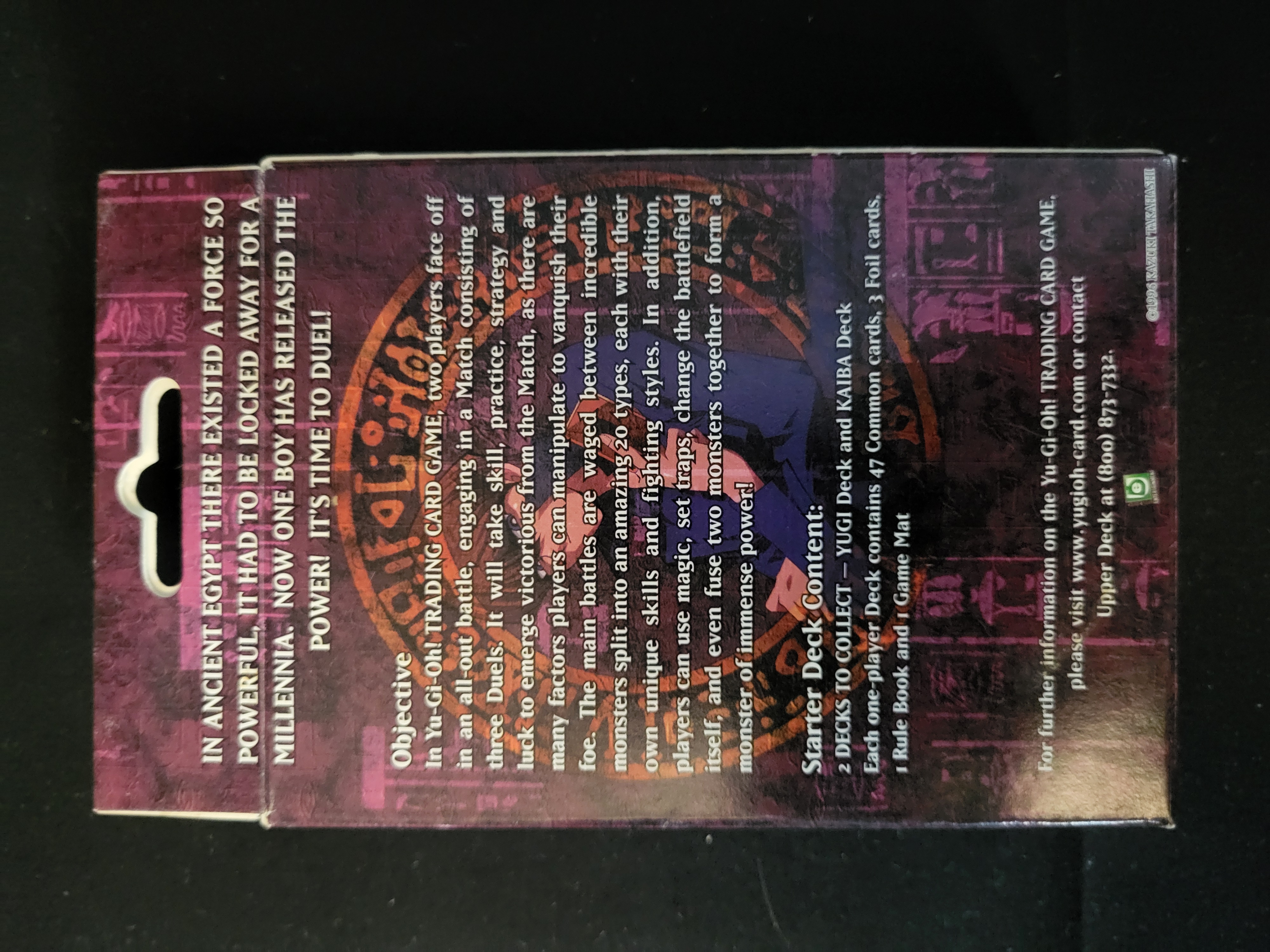 BID PER WHAT YOU SEE IN THE PHOTO, NOT THE AI GENERATED TITLES AND DESCRIPTIONS! A Yu-Gi-Oh! Trading Card Game Starter Deck Kaiba manufactured by Upper Deck Entertainment. The cardstock packaging features character artwork of Seto Kaiba on the front panel with a die-cut window revealing a holographic foil card. The reverse side lists the set contents as 47 common cards, 3 foil cards, a rule book, and a game mat. Printed markings include the Yu-Gi-Oh! series logo, a 1996 Kazuki Takahashi copyright, and Upper Deck corporate information. The card visible in the window is Hane-Hane (SDK-046).