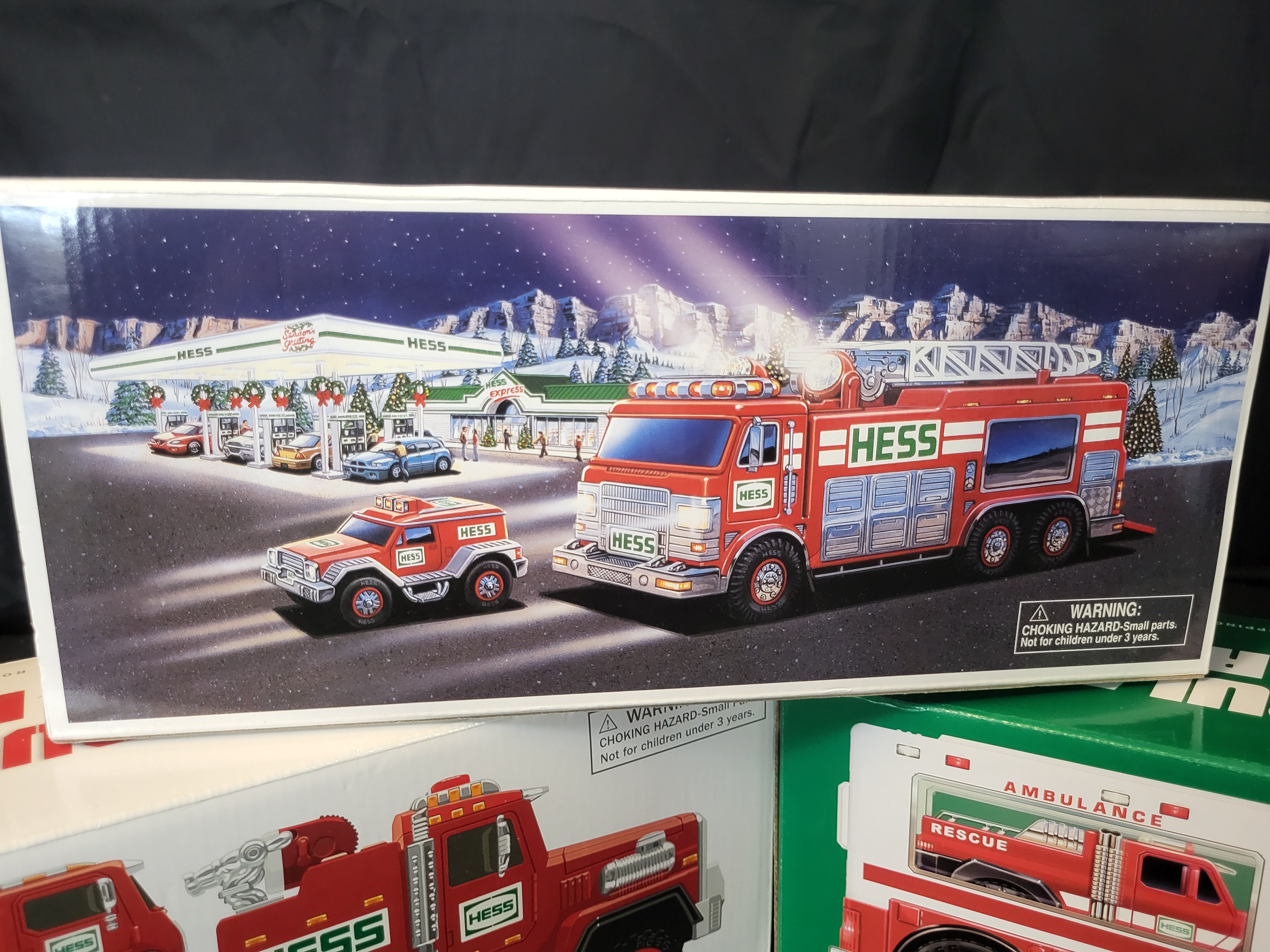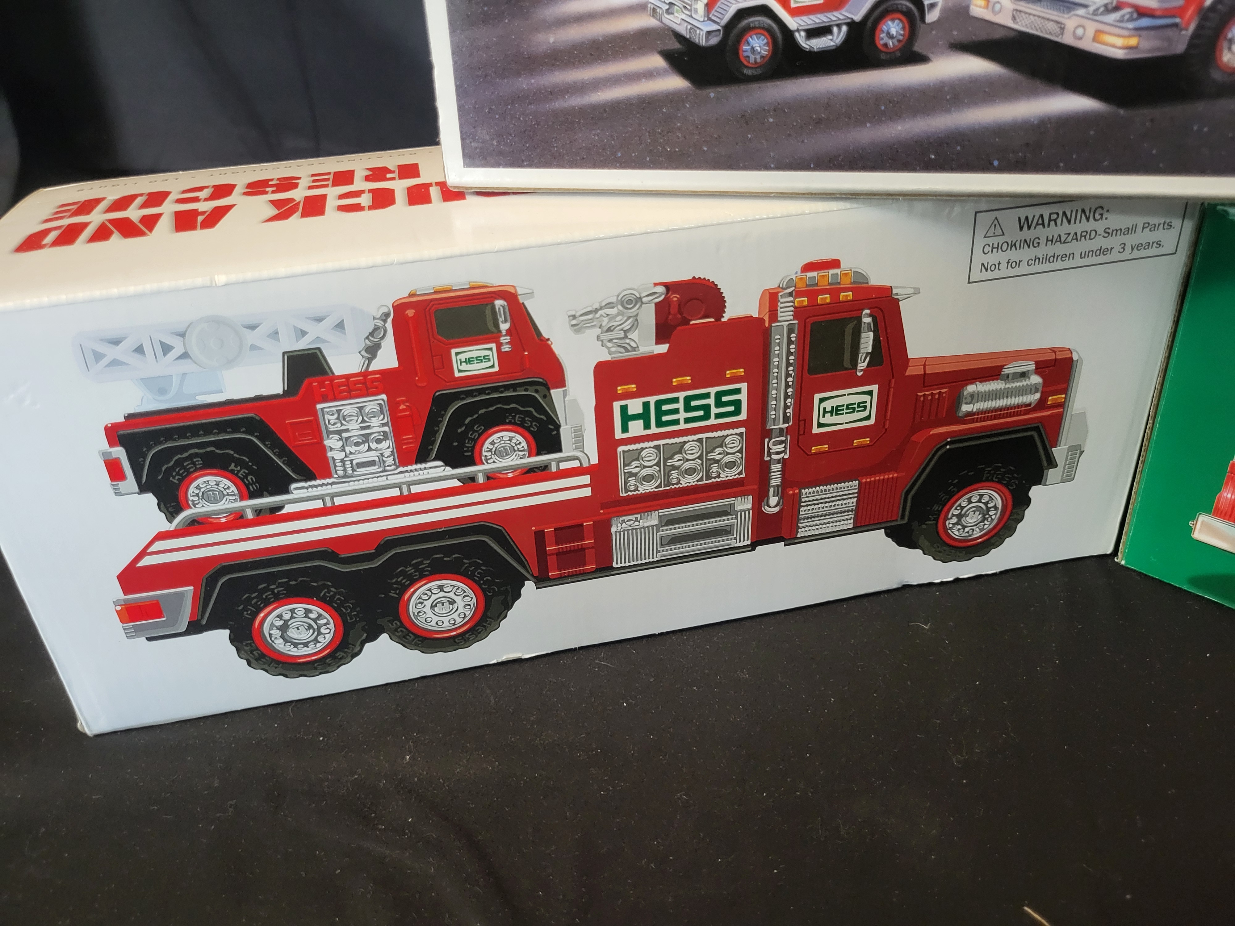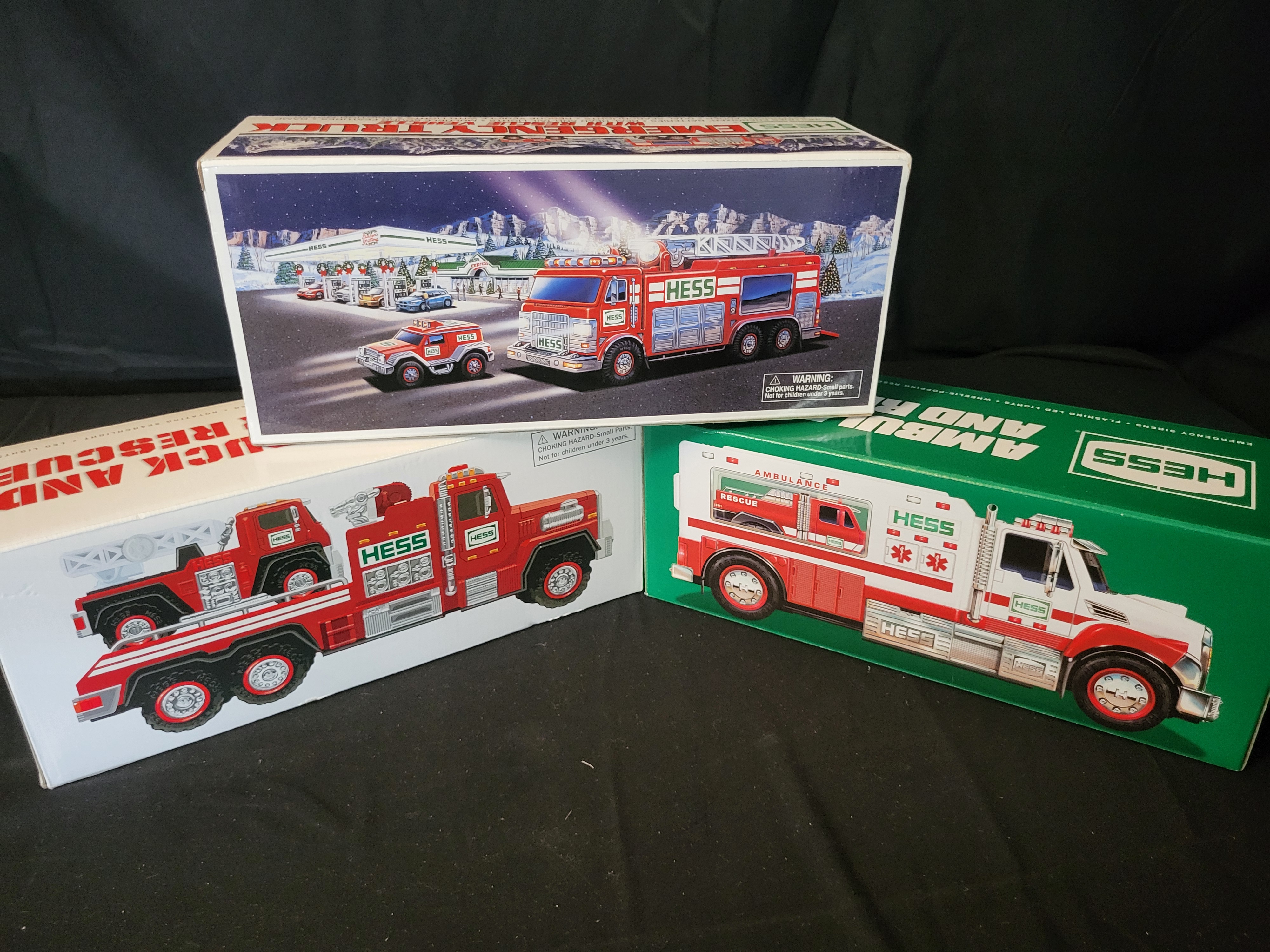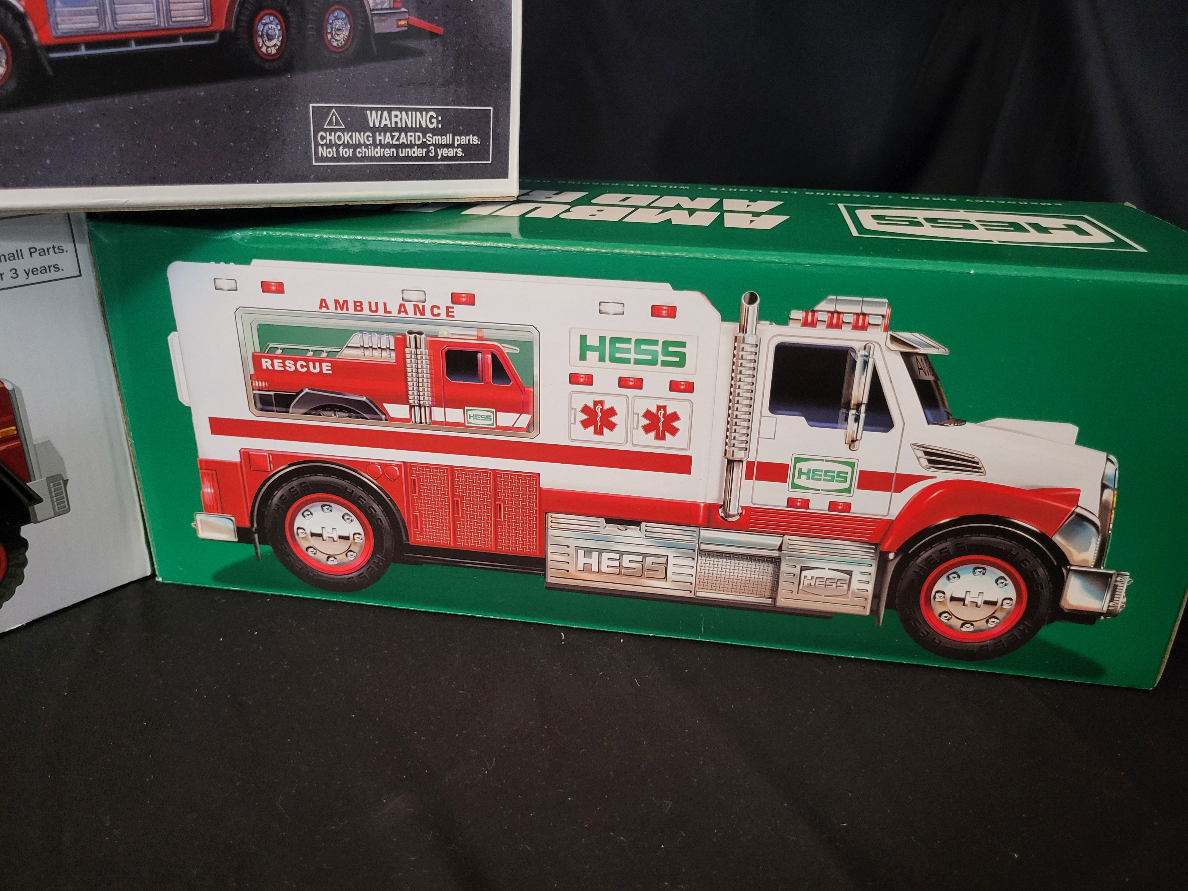 BID PER WHAT YOU SEE IN THE PHOTO, NOT THE AI GENERATED TITLES AND DESCRIPTIONS! A trio of Hess brand toy vehicle sets in their original illustrated cardboard packaging. This collection features emergency-themed vehicles including a 2005 Emergency Truck with Rescue Vehicle, a Flatbed Truck and Rescue, and an Ambulance and Rescue. Each set consists of a primary transport vehicle and a smaller secondary rescue unit. The vehicles are constructed of molded plastic with red, white, and green color schemes, featuring prominent Hess logos and functional detailing such as ladders, emergency lights, and chrome-colored accents. The boxes display detailed graphics of the vehicles in various settings, including a Hess gas station scene.