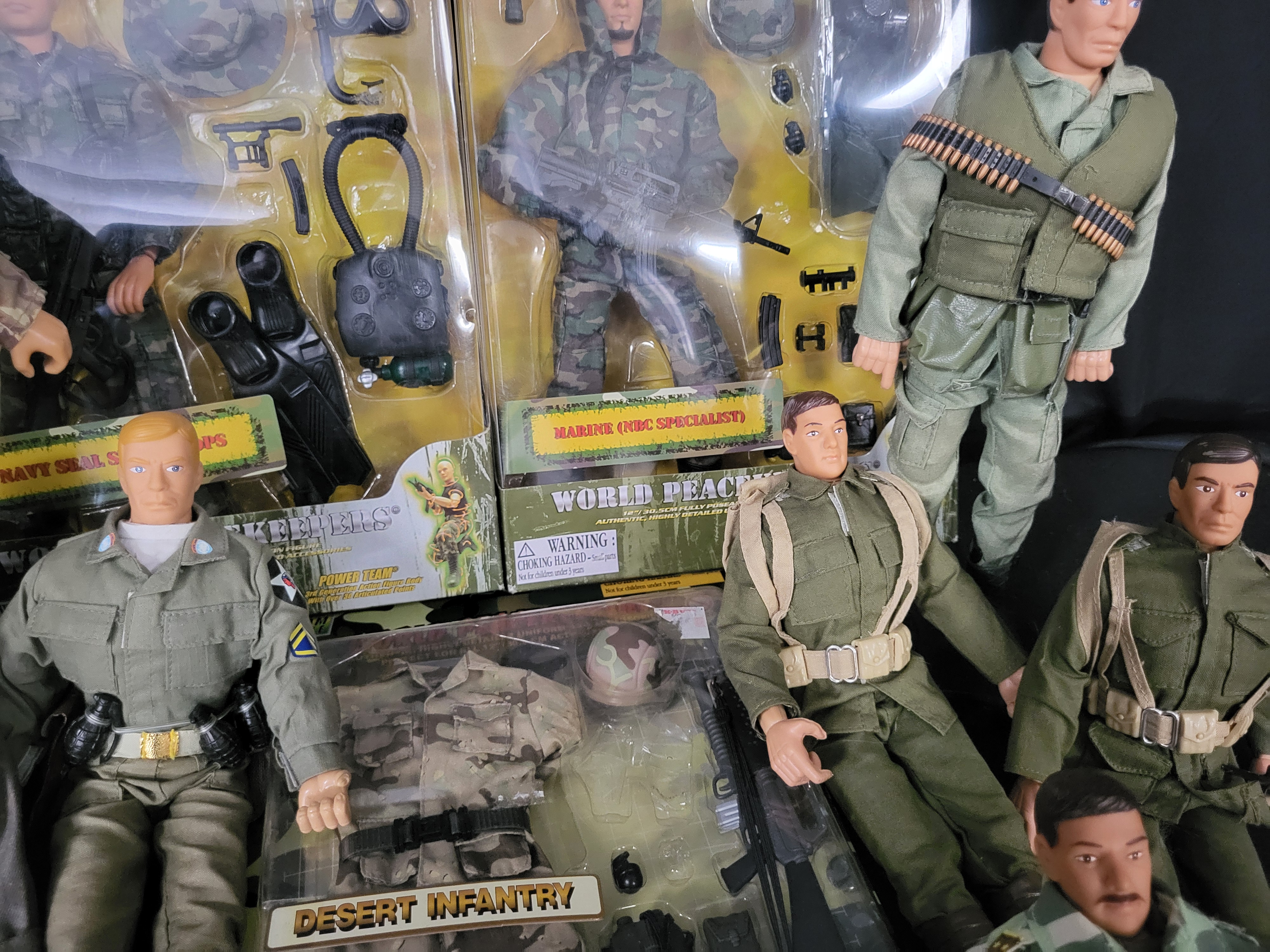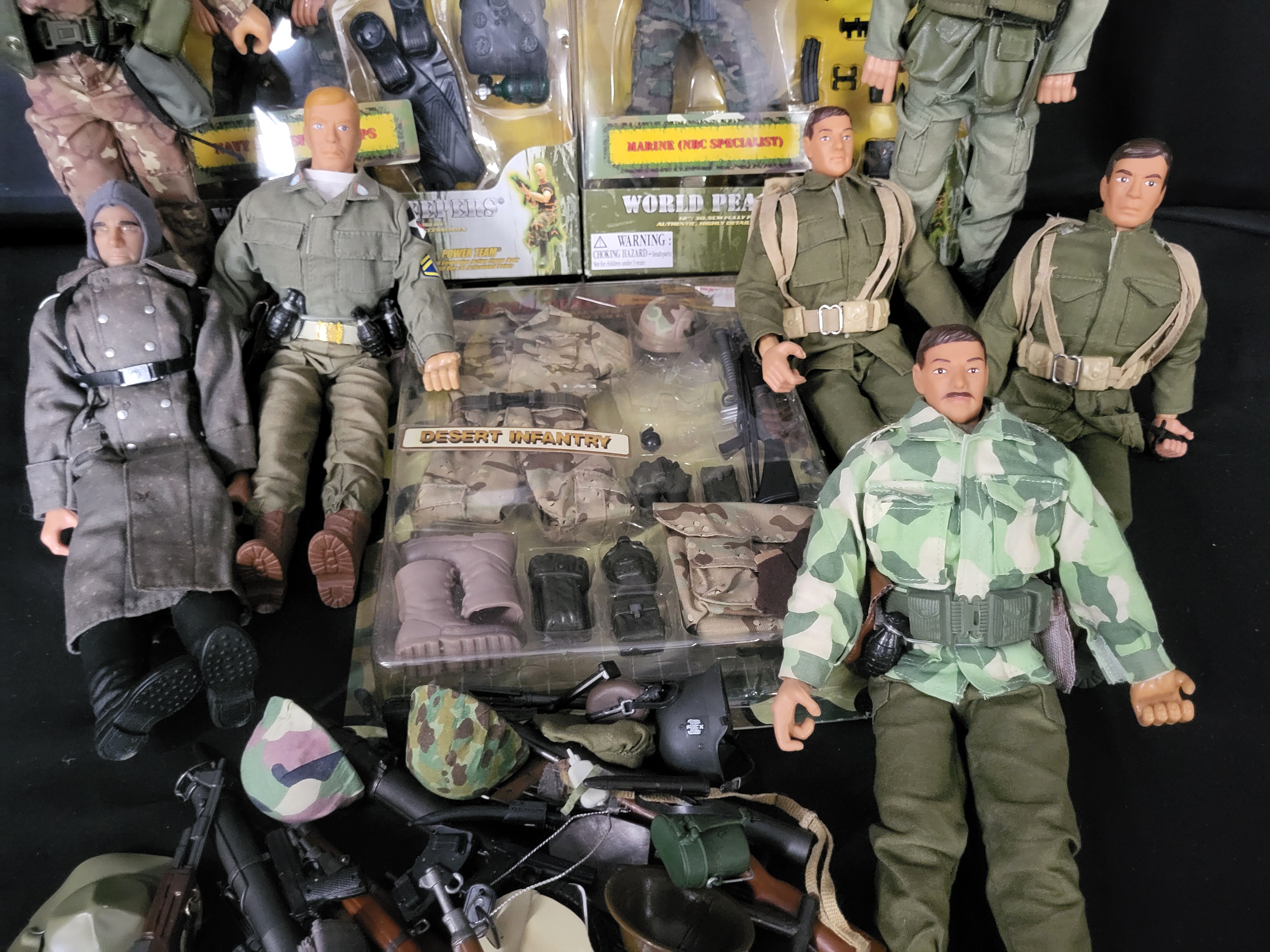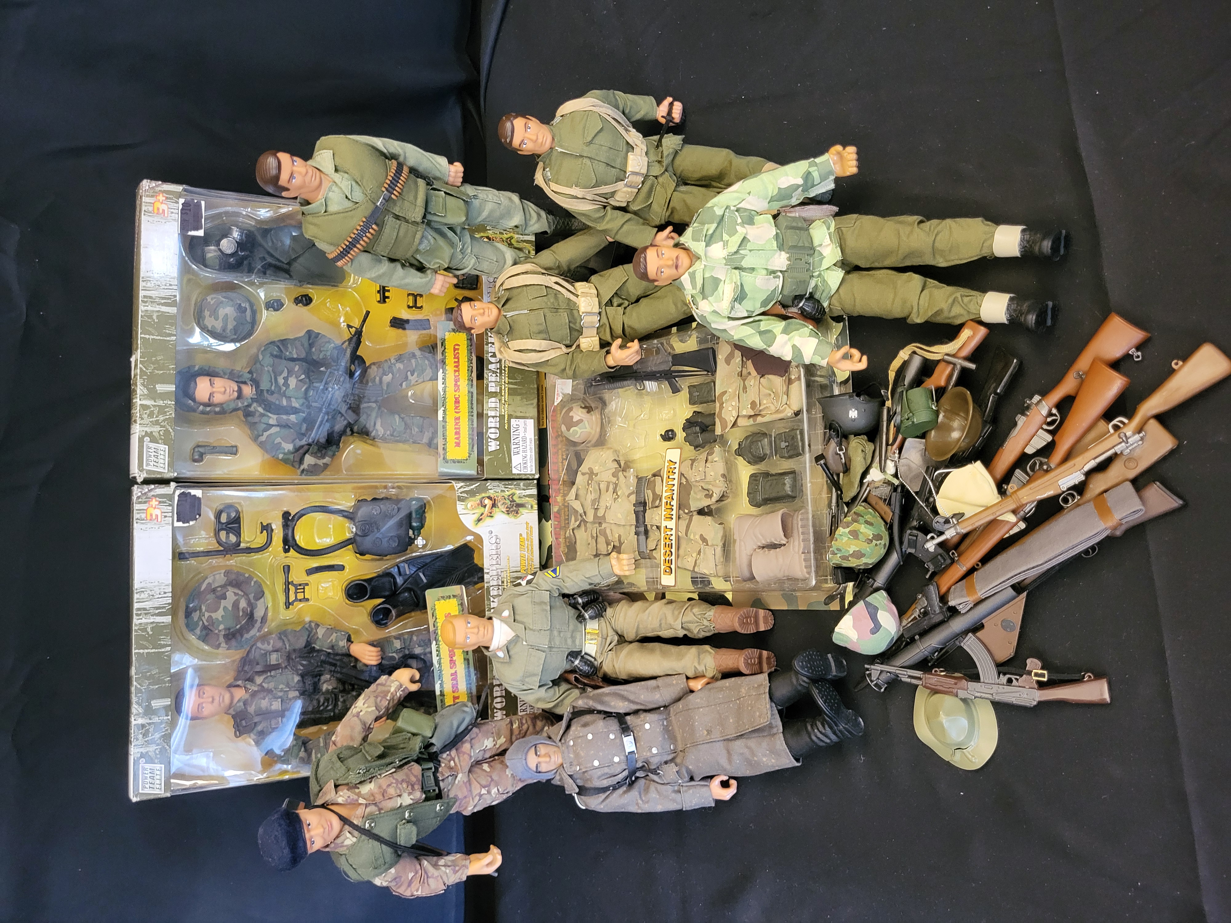 BID PER WHAT YOU SEE IN THE PHOTO, NOT THE AI GENERATED TITLES AND DESCRIPTIONS! A collection of 1:6 scale military-themed action figures and accessories primarily from the Power Team Elite and World Peacekeepers lines. The group features several articulated figures dressed in diverse textile uniforms, including camouflaged tactical gear, olive drab fatigues, and a grey greatcoat. Three items are contained within their original retail packaging: a Navy SEAL Special Ops figure, a Marine NBC Specialist figure, and a Desert Infantry accessory set. The figures are constructed of molded plastic with multiple points of articulation. The lot includes a diverse assortment of loose accessories such as miniature rifles, helmets, hats, and various field equipment.