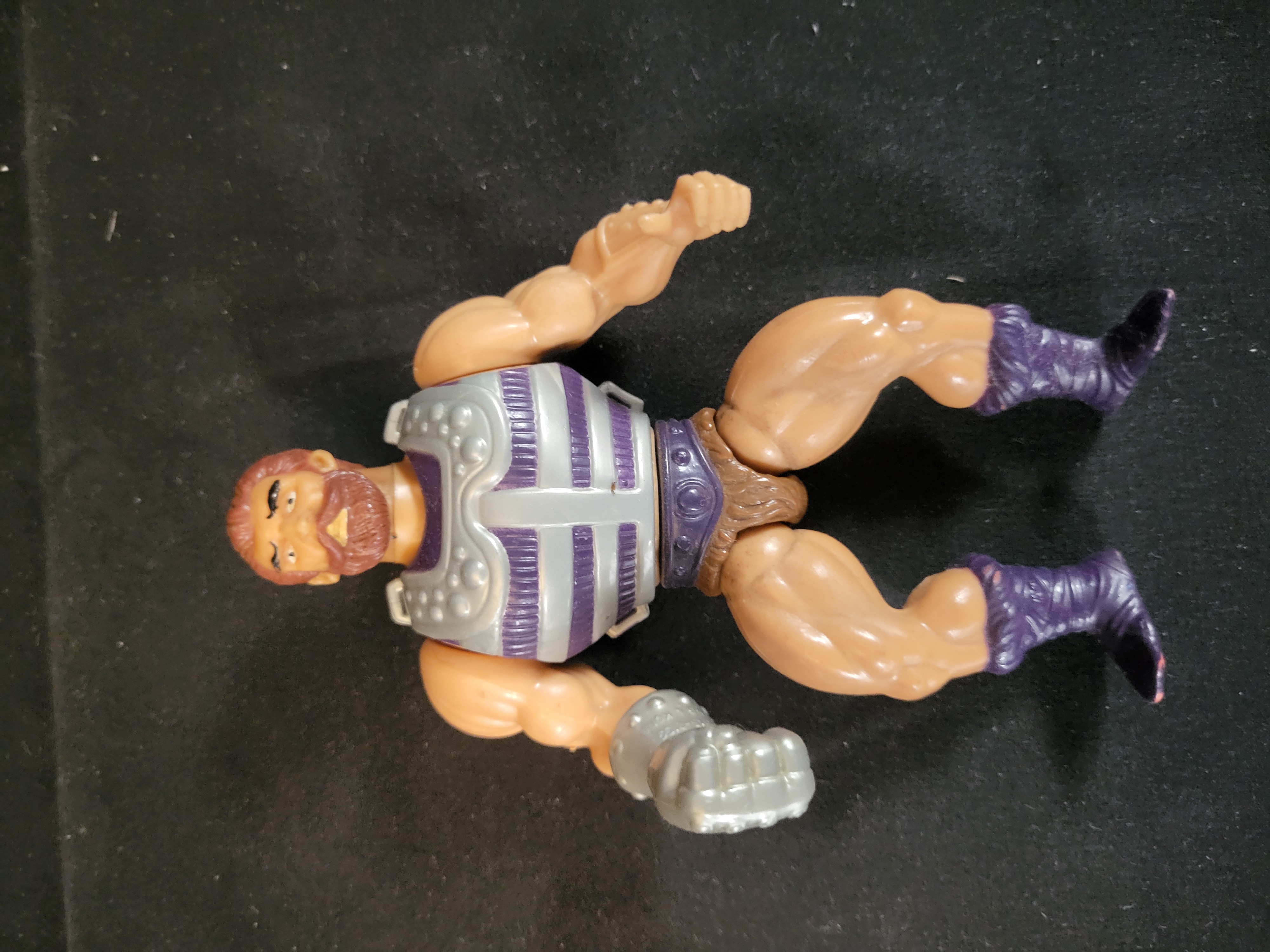 BID PER WHAT YOU SEE IN THE PHOTO, NOT THE AI GENERATED TITLES AND DESCRIPTIONS! A vintage molded plastic action figure of the character Fisto from the Masters of the Universe line, manufactured by Mattel. The figure features an oversized silver-toned gauntlet on the right hand and a removable silver and purple striped breastplate. The character is detailed with sculpted red hair and a beard, a brown textured loincloth, and purple boots. The reverse of the removable chest armor is marked with the copyright inscription © Mattel, Inc. 1983. This lot includes the figure and armor only.