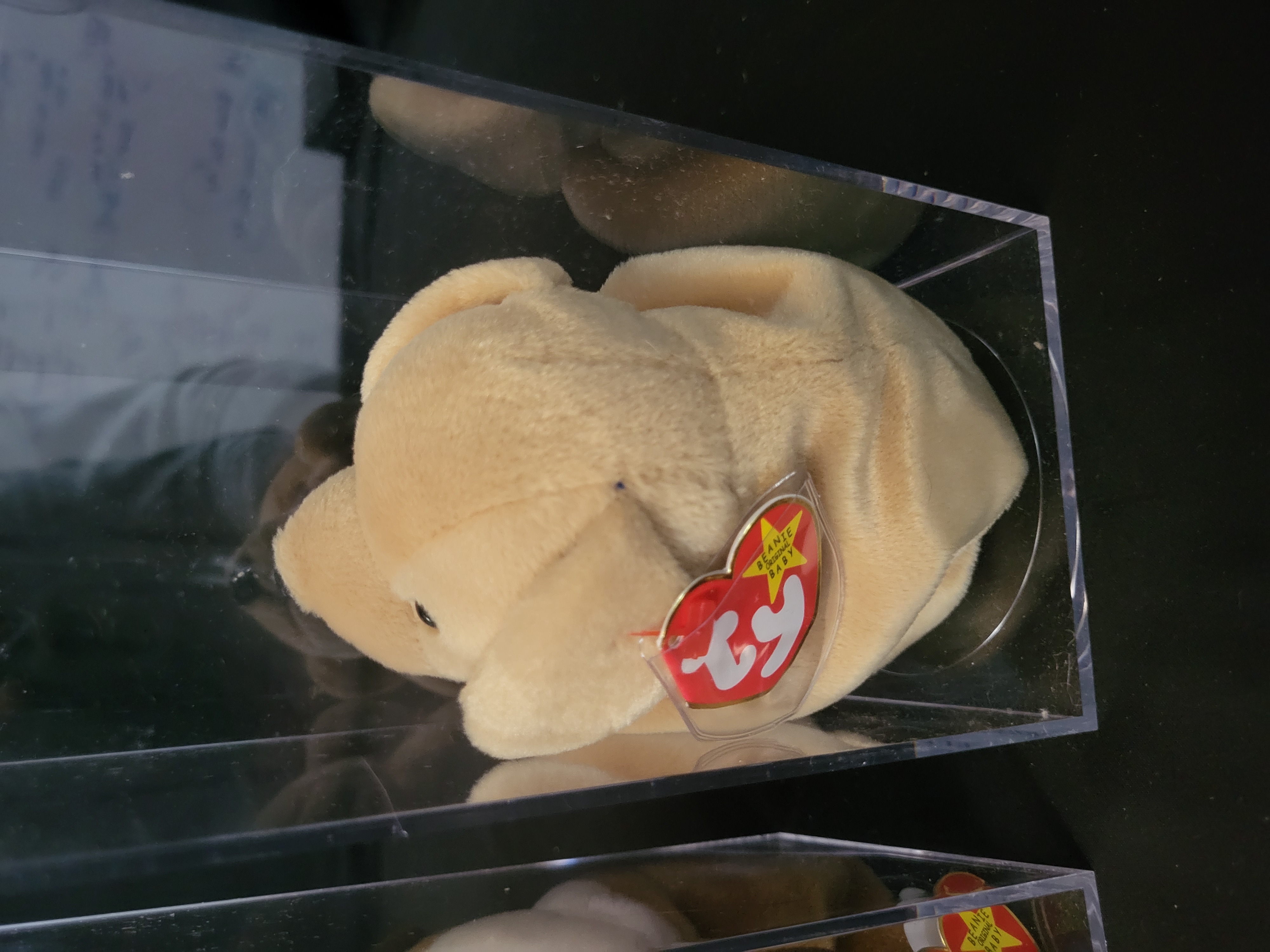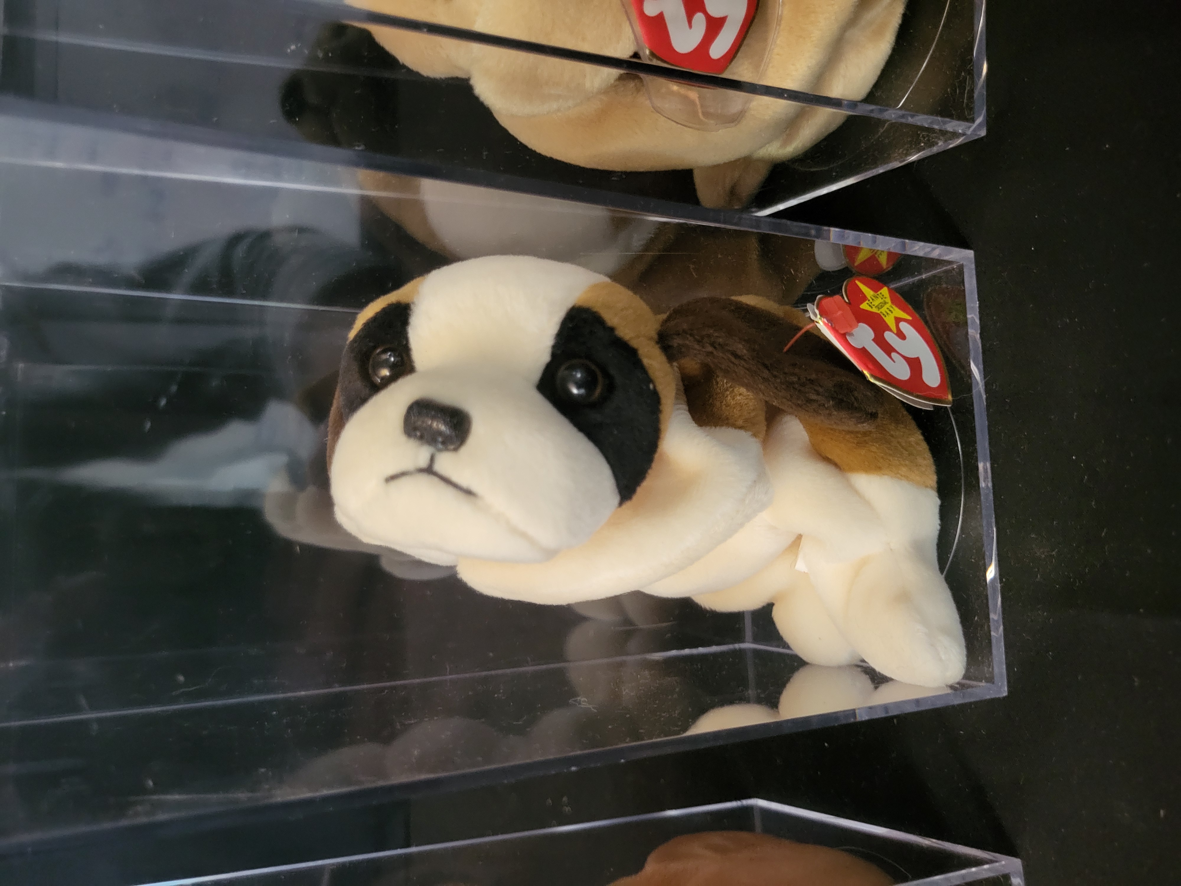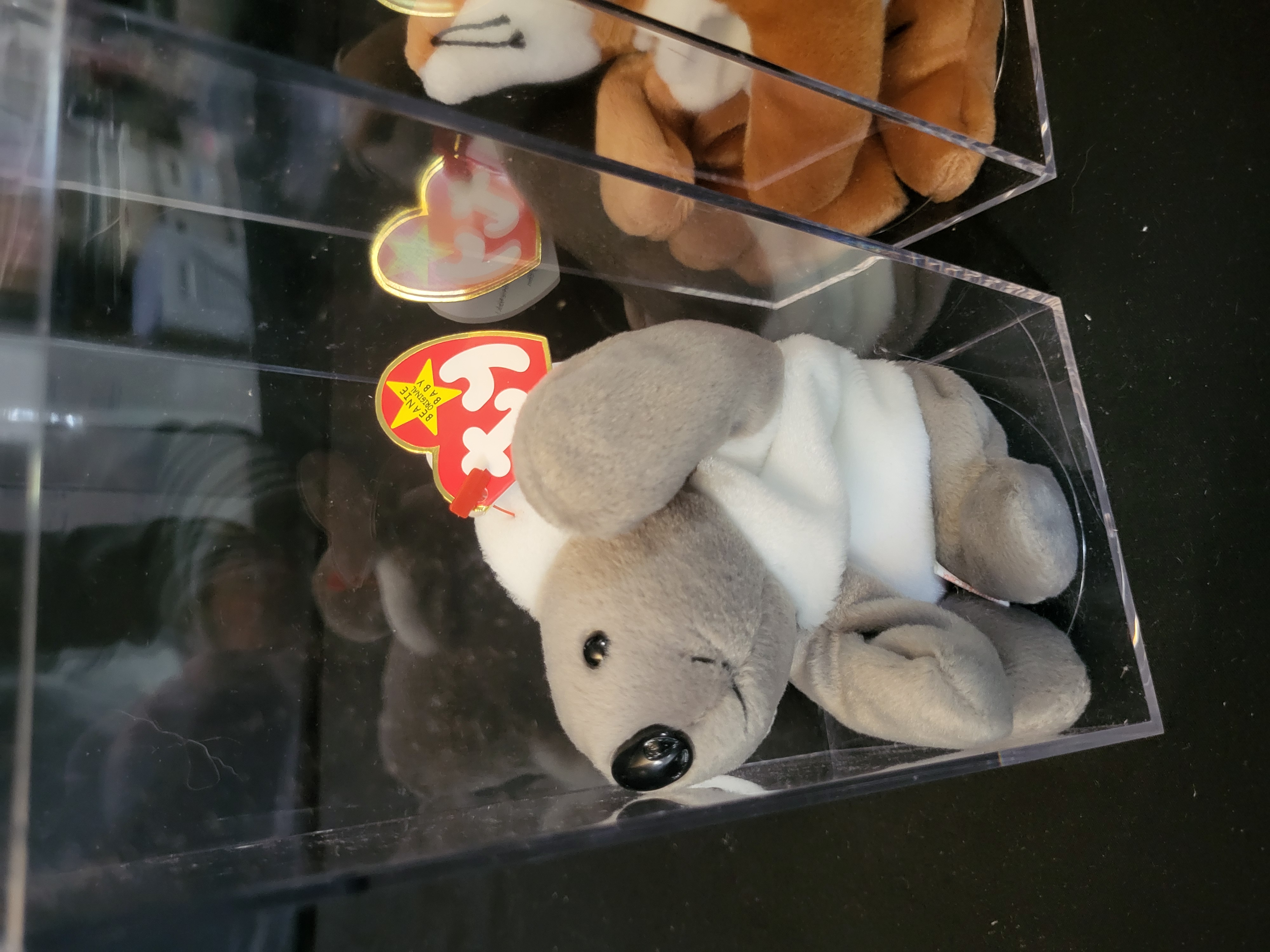 BID PER WHAT YOU SEE IN THE PHOTO, NOT THE AI GENERATED TITLES AND DESCRIPTIONS! A collection of Ty Beanie Babies, each presented in an individual clear acrylic rectangular display case. The group features several plush animal designs, including a grey and white koala, a reddish-brown and white fox identified as Sly, a tricolor dog with black patches around the eyes, and a solid tan-colored dog. Each item retains its original red heart-shaped Ty swing tag with the text BEANIE ORIGINAL BABY, and most tags are further protected by clear plastic covers. The plush toys are constructed from soft synthetic fabric with plastic beaded eyes and noses.