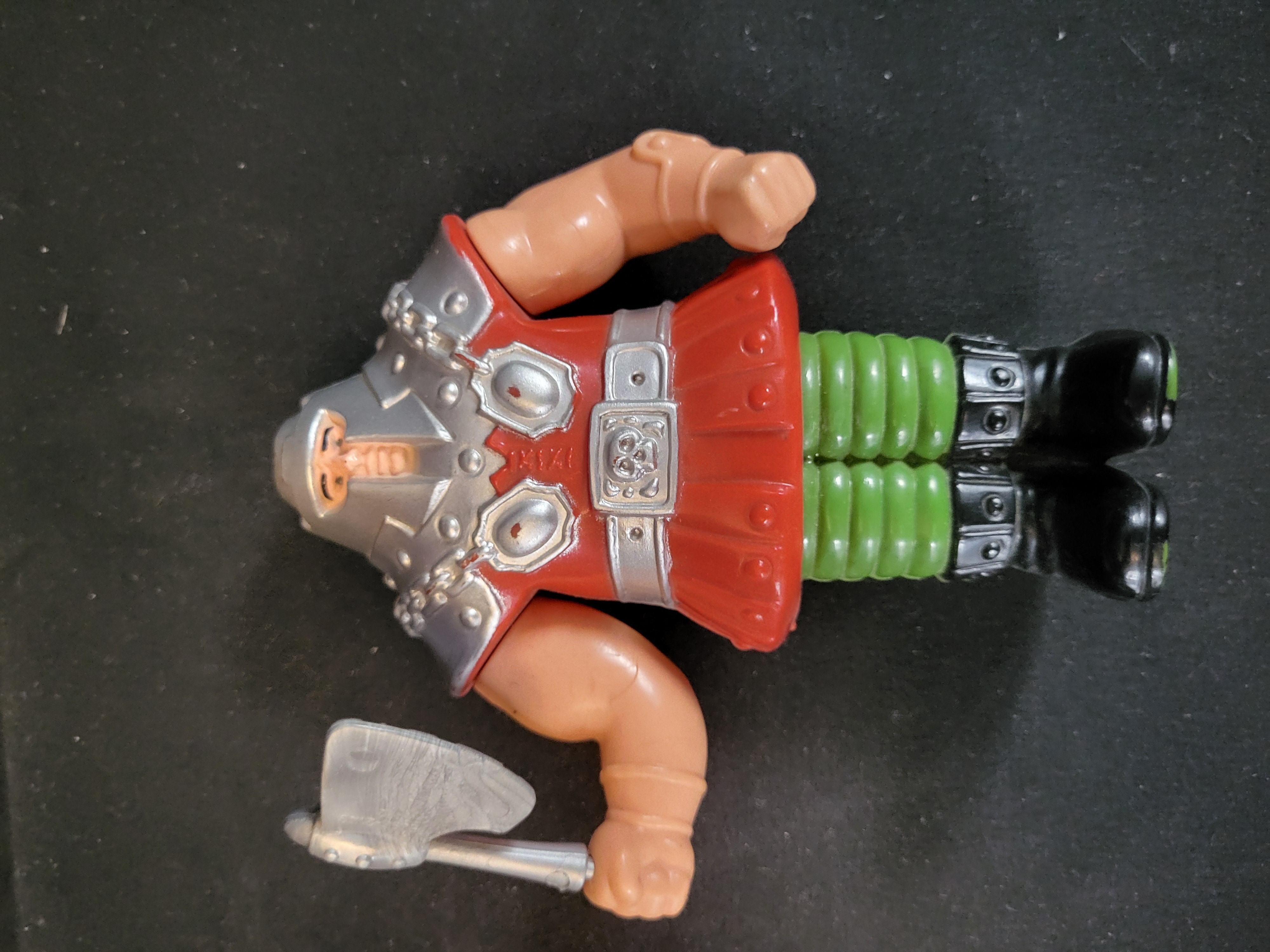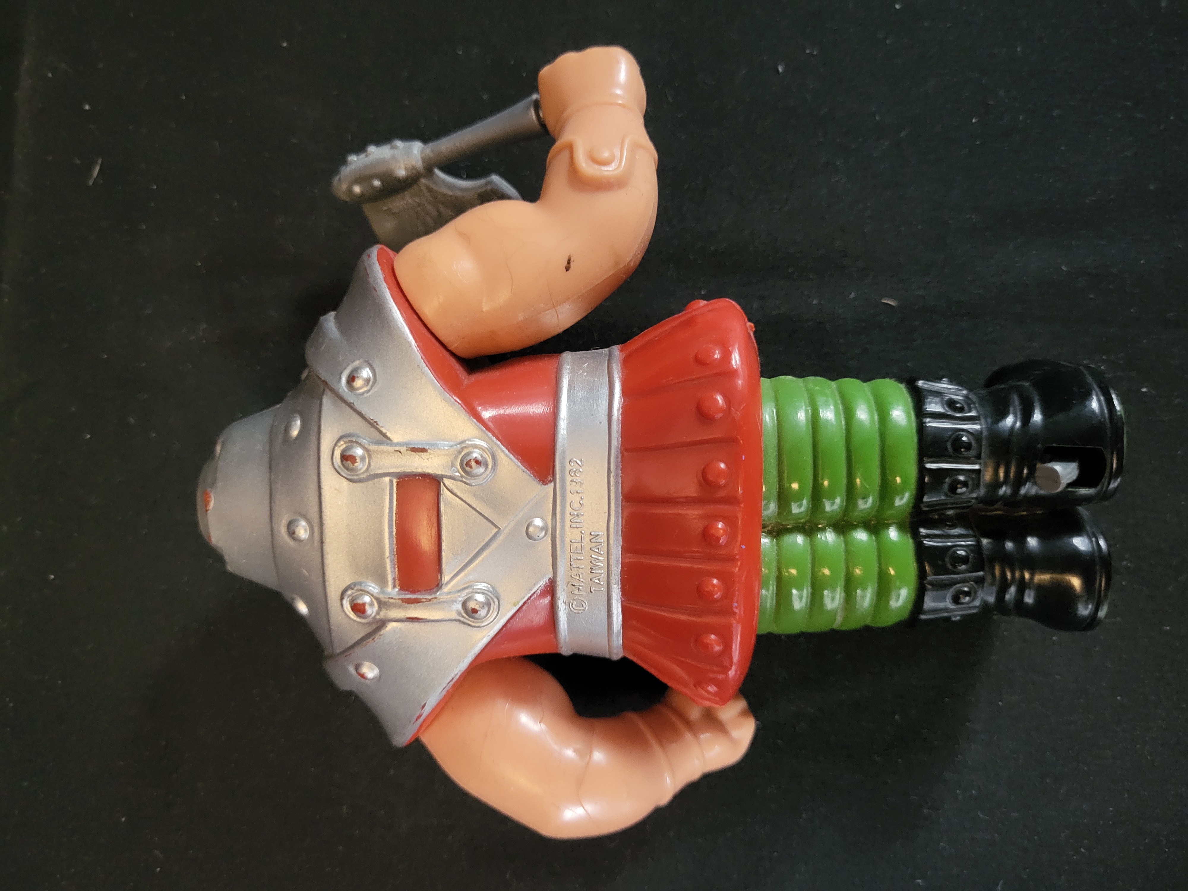 BID PER WHAT YOU SEE IN THE PHOTO, NOT THE AI GENERATED TITLES AND DESCRIPTIONS! This vintage action figure represents the character Ram Man from the Mattel Masters of the Universe toy line. The figure is constructed of molded plastic with a squat, bulky form designed to house a spring-loaded ramming mechanism in the legs. The character is depicted wearing a silver-colored helmet and chest armor over a red tunic, with ribbed green legs and black boots. A silver-colored plastic battle axe accessory is included and held in the right hand. The reverse of the figure is embossed with the text © MATTEL, INC. 1982 TAIWAN. A small red Mattel logo is visible on the center of the chest armor.