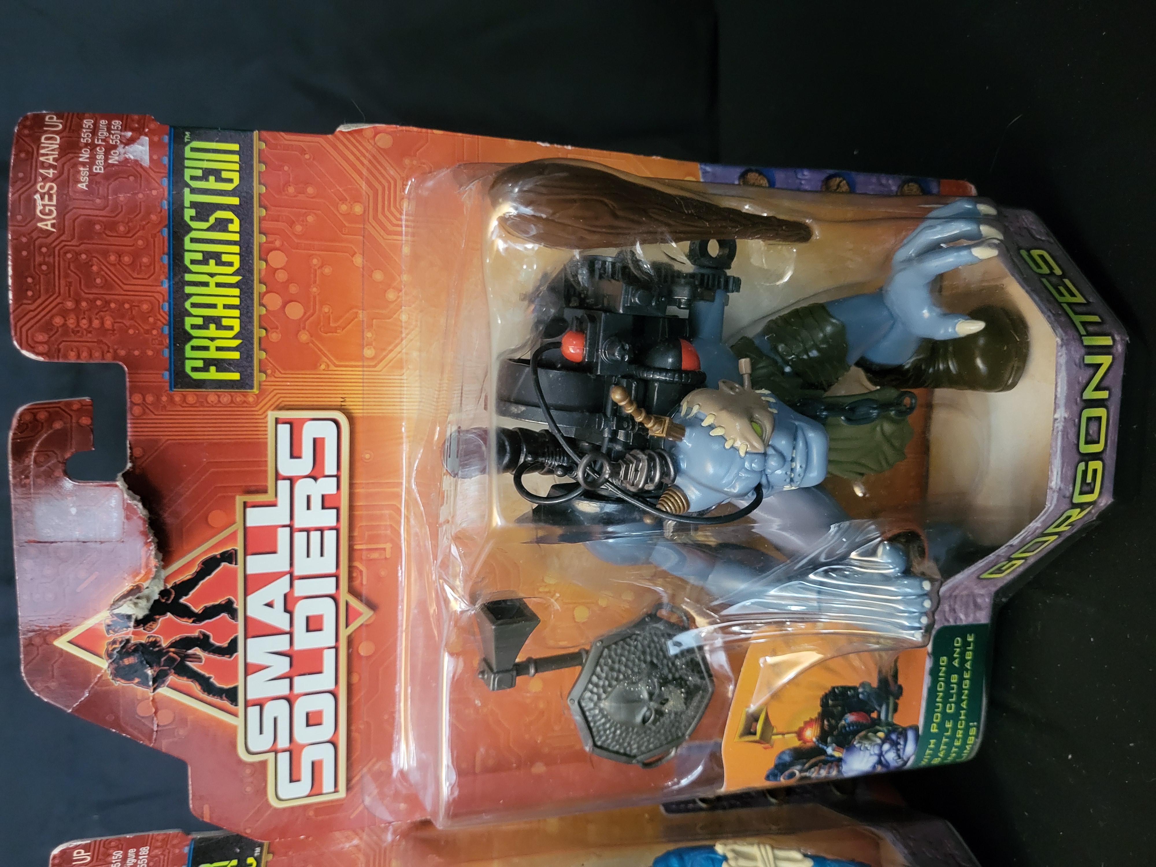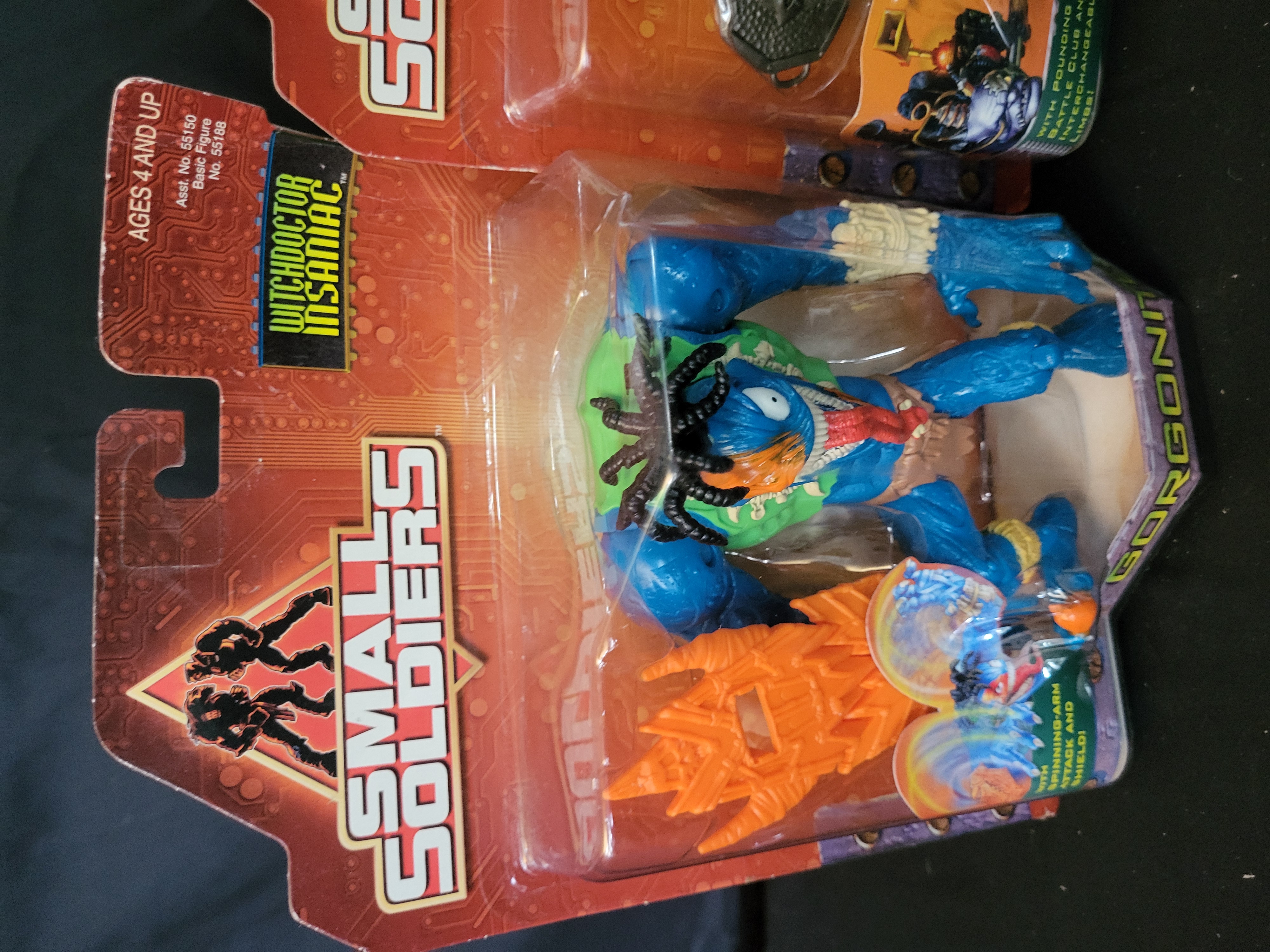 BID PER WHAT YOU SEE IN THE PHOTO, NOT THE AI GENERATED TITLES AND DESCRIPTIONS! Two 1998 Hasbro Small Soldiers Gorgonites action figures in original blister pack packaging. This lot includes the characters Witchdoctor Insaniac and Freakenstein, both part of the Asst. No. 55150 Basic Figures series. The Witchdoctor Insaniac figure is a multi-limbed blue creature featuring a spinning-arm attack and shield accessory. The Freakenstein figure includes a pounding battle club and interchangeable limbs. Both figures are housed in their original factory-sealed plastic blisters on illustrated cardboard backing cards. The packaging includes the Small Soldiers film logo and character-specific graphics.