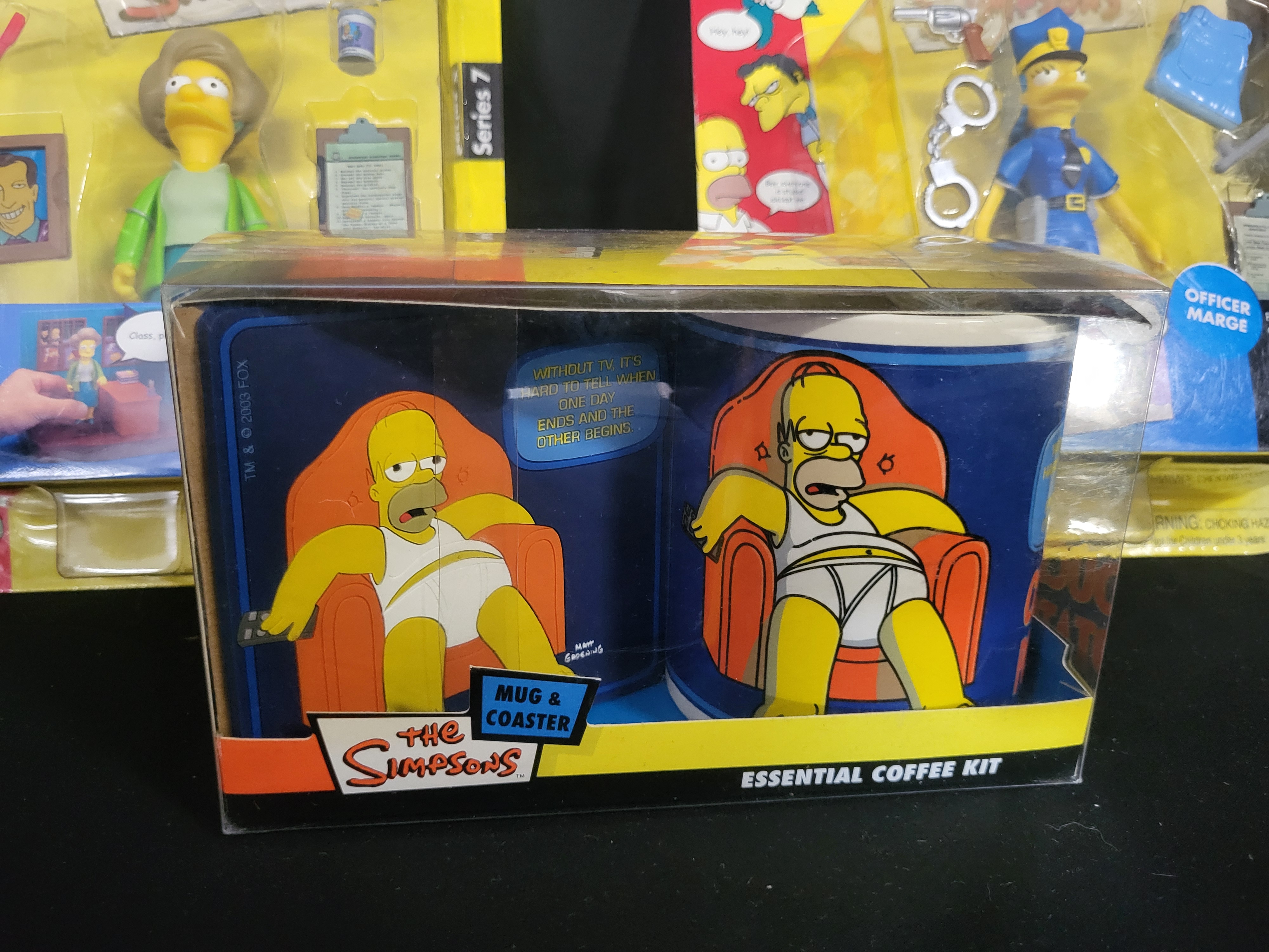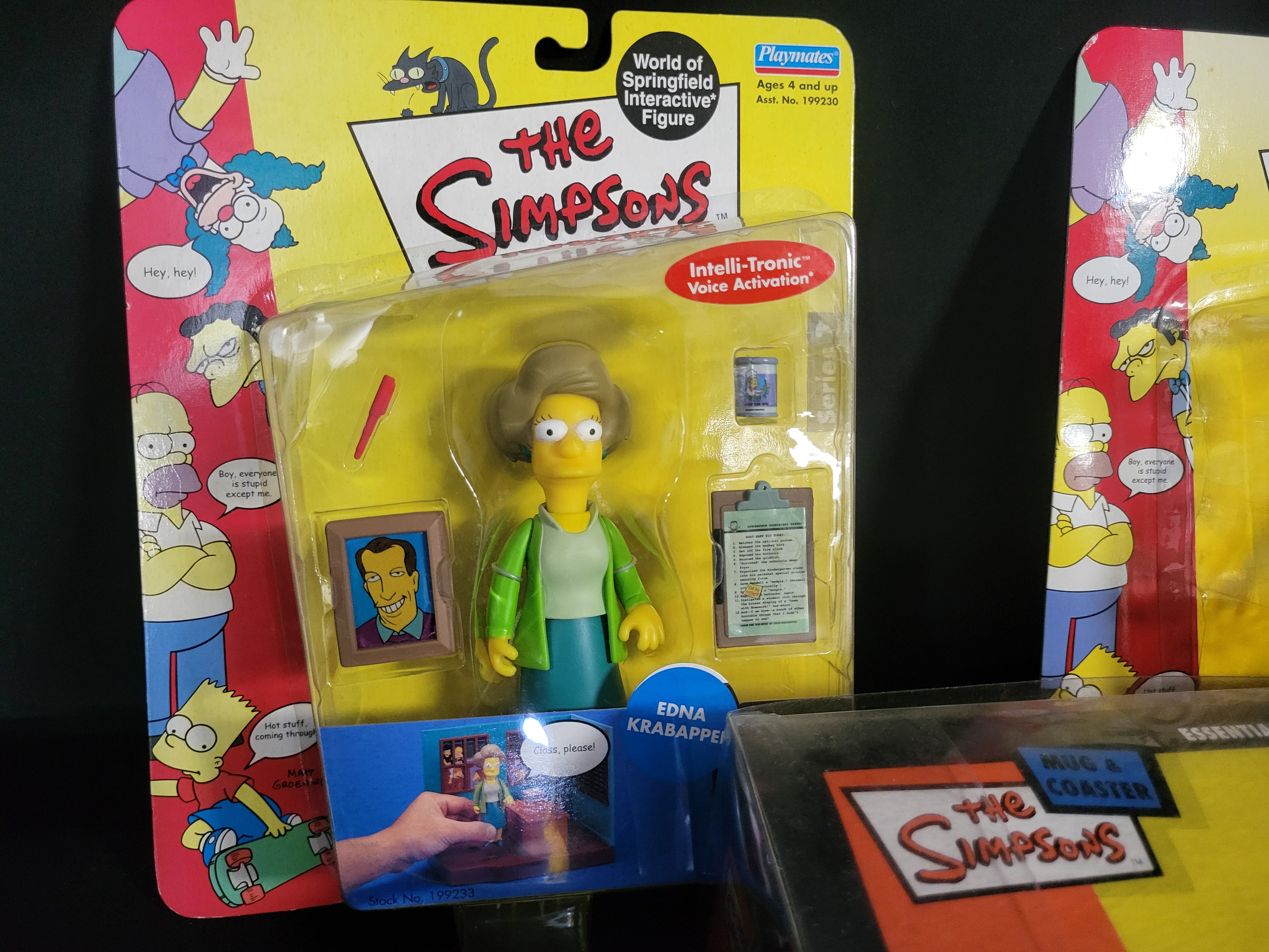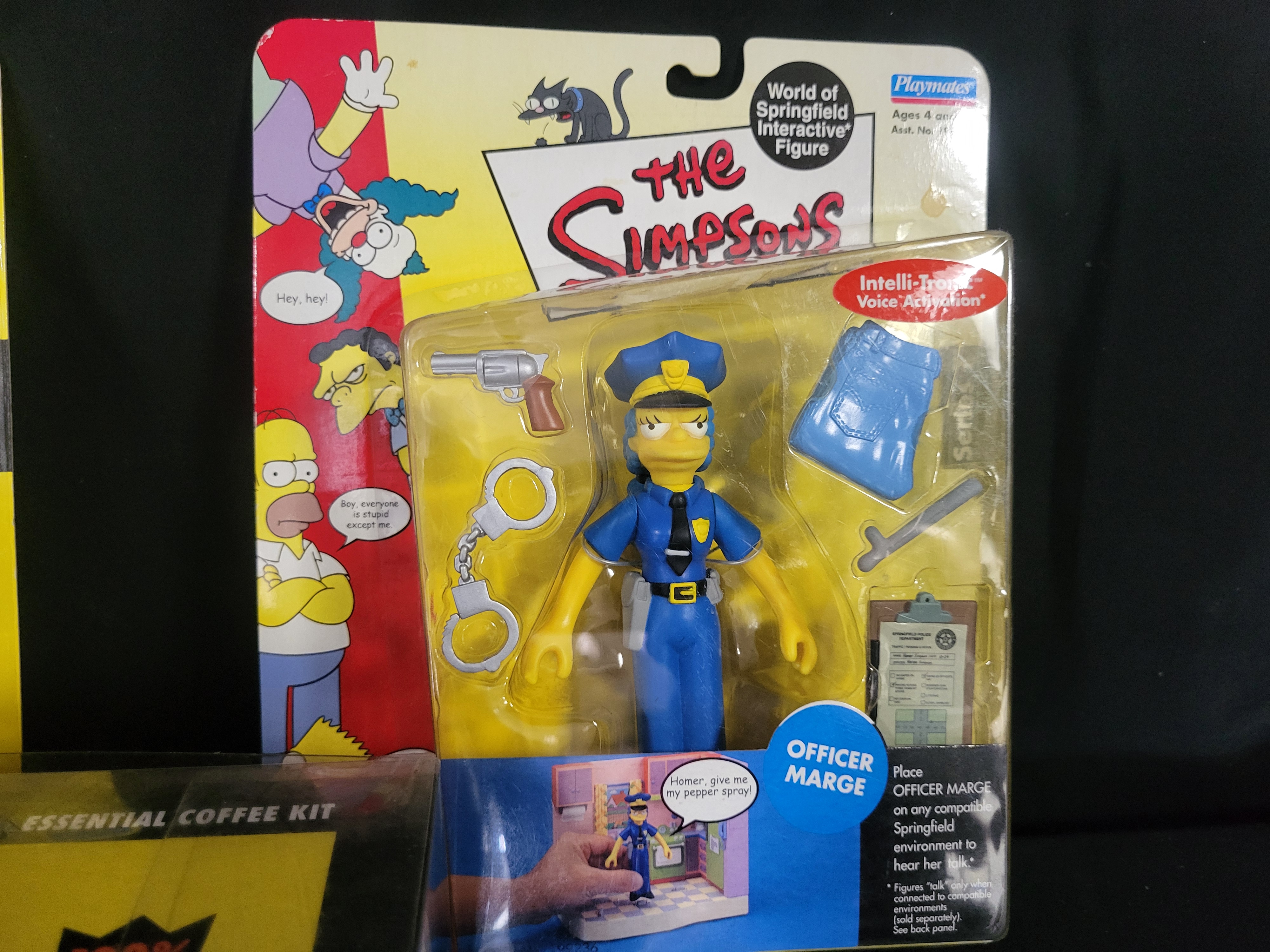 BID PER WHAT YOU SEE IN THE PHOTO, NOT THE AI GENERATED TITLES AND DESCRIPTIONS! A group of official The Simpsons themed merchandise featuring two Playmates World of Springfield interactive action figures and a Homer Simpson coffee set. The action figures include Edna Krabappel from Series 7 and Officer Marge. Both figures are manufactured from molded plastic and incorporate Intelli-Tronic Voice Activation technology. Character-specific accessories are included such as a clipboard and portrait for Edna Krabappel, and handcuffs, a handgun, and a baton for Officer Marge. The Essential Coffee Kit, dated 2003, comprises a ceramic mug and a matching coaster featuring Homer Simpson. All items are contained within their original factory packaging, including blister cards and a clear plastic display box, marked with trademarks from Twentieth Century Fox and Playmates.
