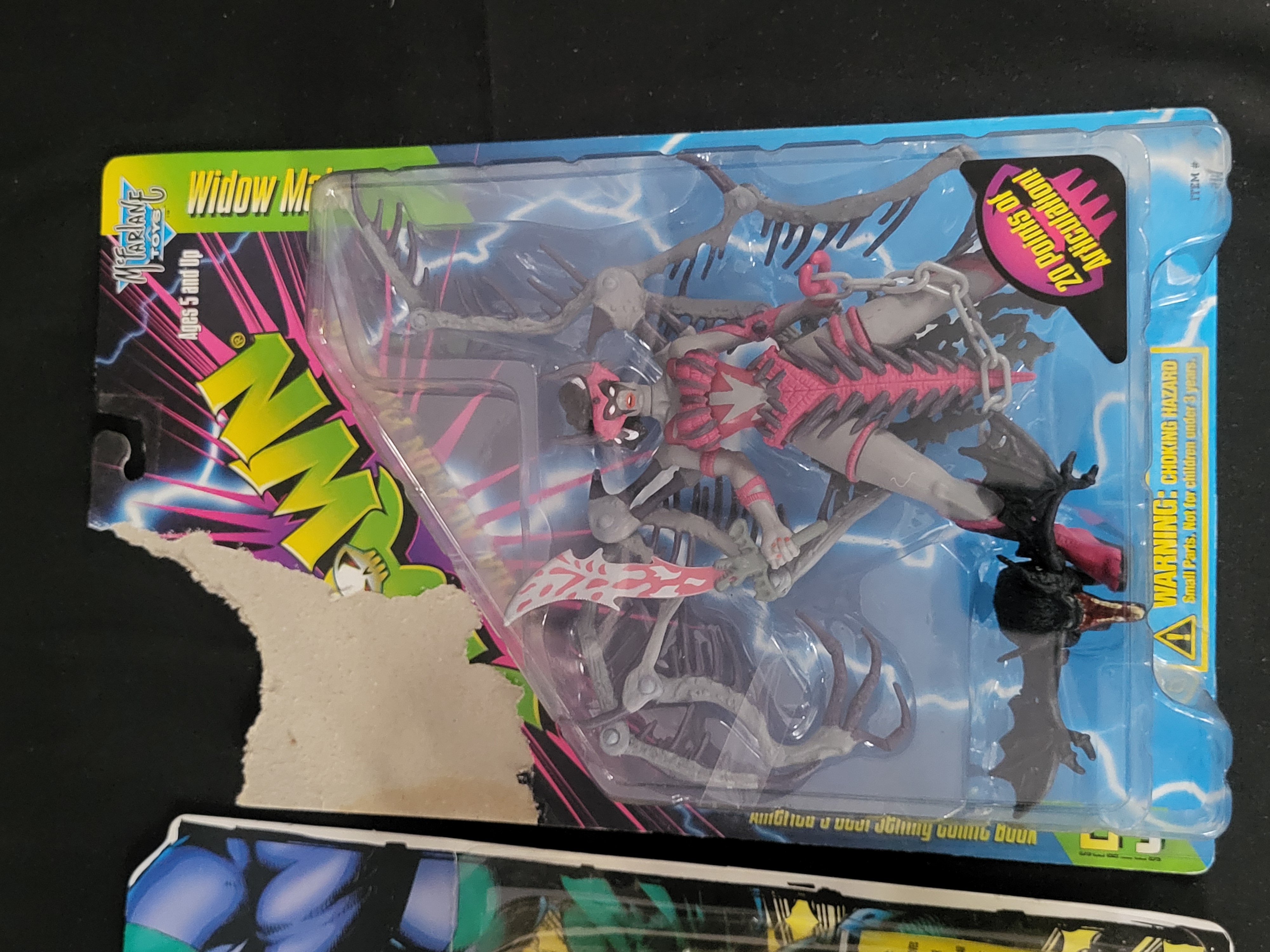 BID PER WHAT YOU SEE IN THE PHOTO, NOT THE AI GENERATED TITLES AND DESCRIPTIONS! Two molded plastic action figures in original manufacturer blister pack packaging. The first figure is a 1994 Playmates WildC.A.T.S. Covert Action Teams Maul, identified as a Massive Crossbreed Warrior from the Jim Lee Image Comics universe. The figure is rendered in green and purple plastic and includes a chrome-finished hook accessory, two yellow components, and a special edition collector card. The second figure is a McFarlane Toys Spawn Series 5 Widow Maker ultra-action figure. This figure is designed with a grey and pink color scheme, featuring 20 points of articulation and a black bat-like accessory. Both items are factory sealed within plastic bubbles on cardboard backers.