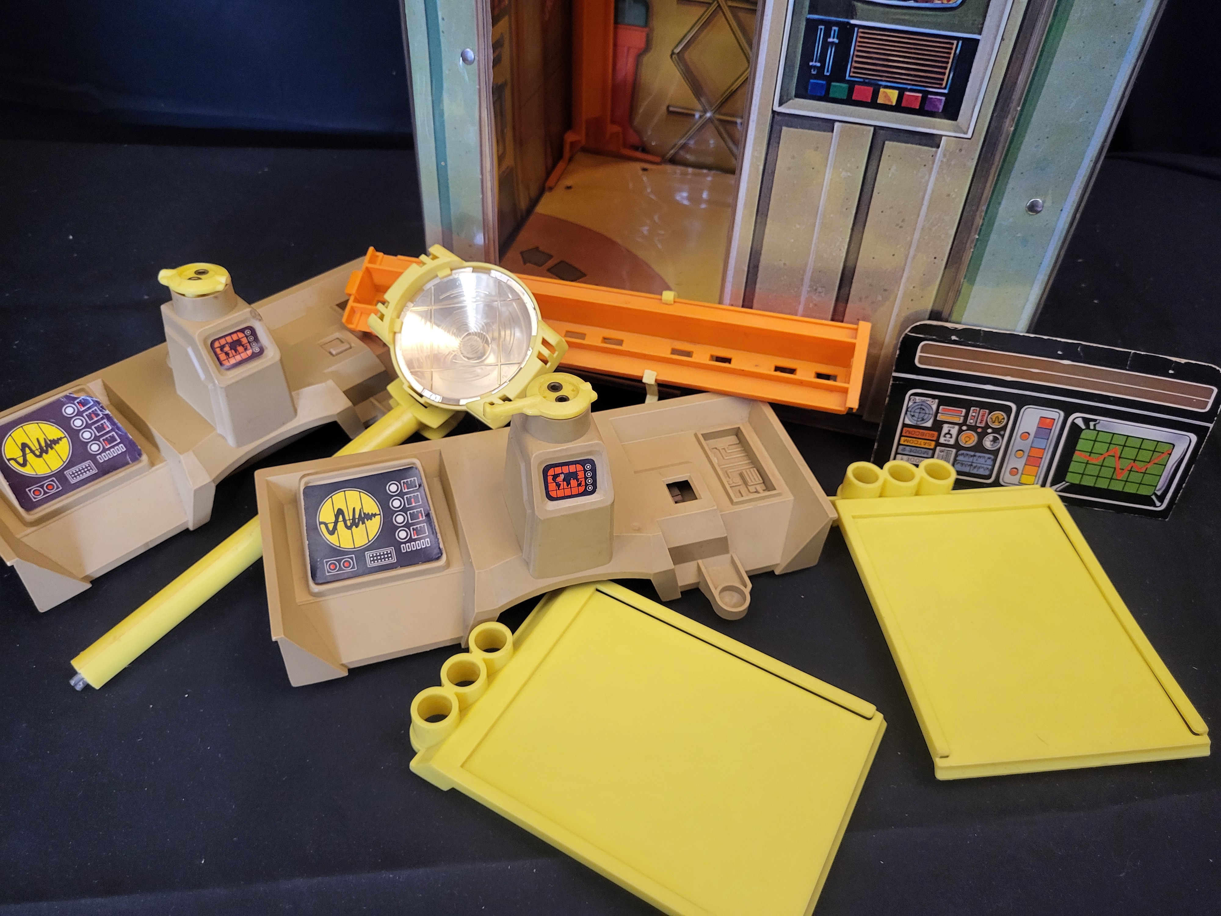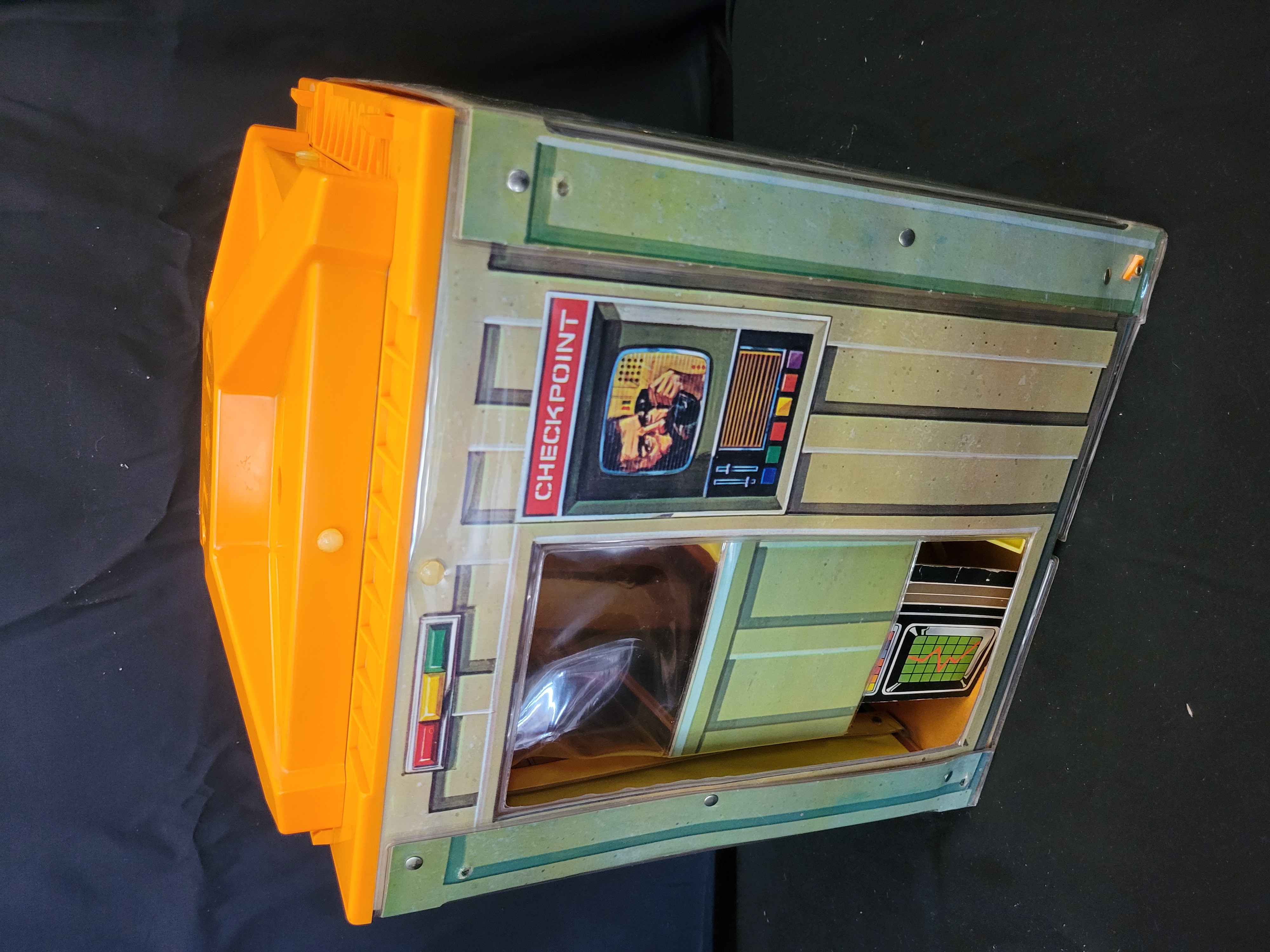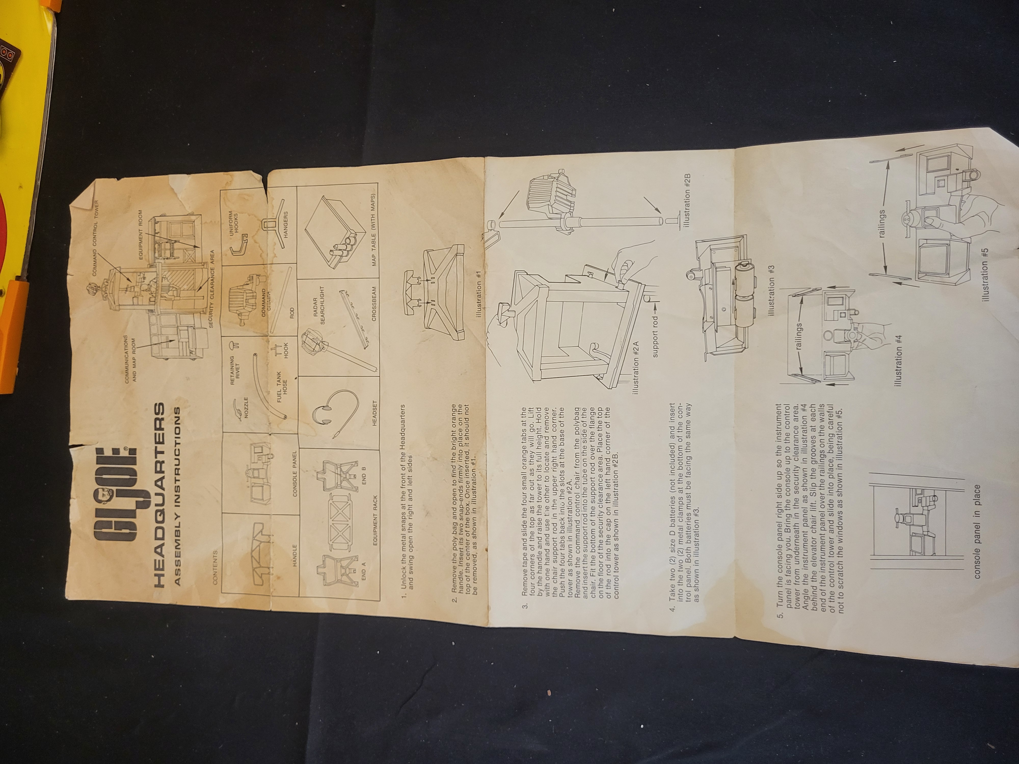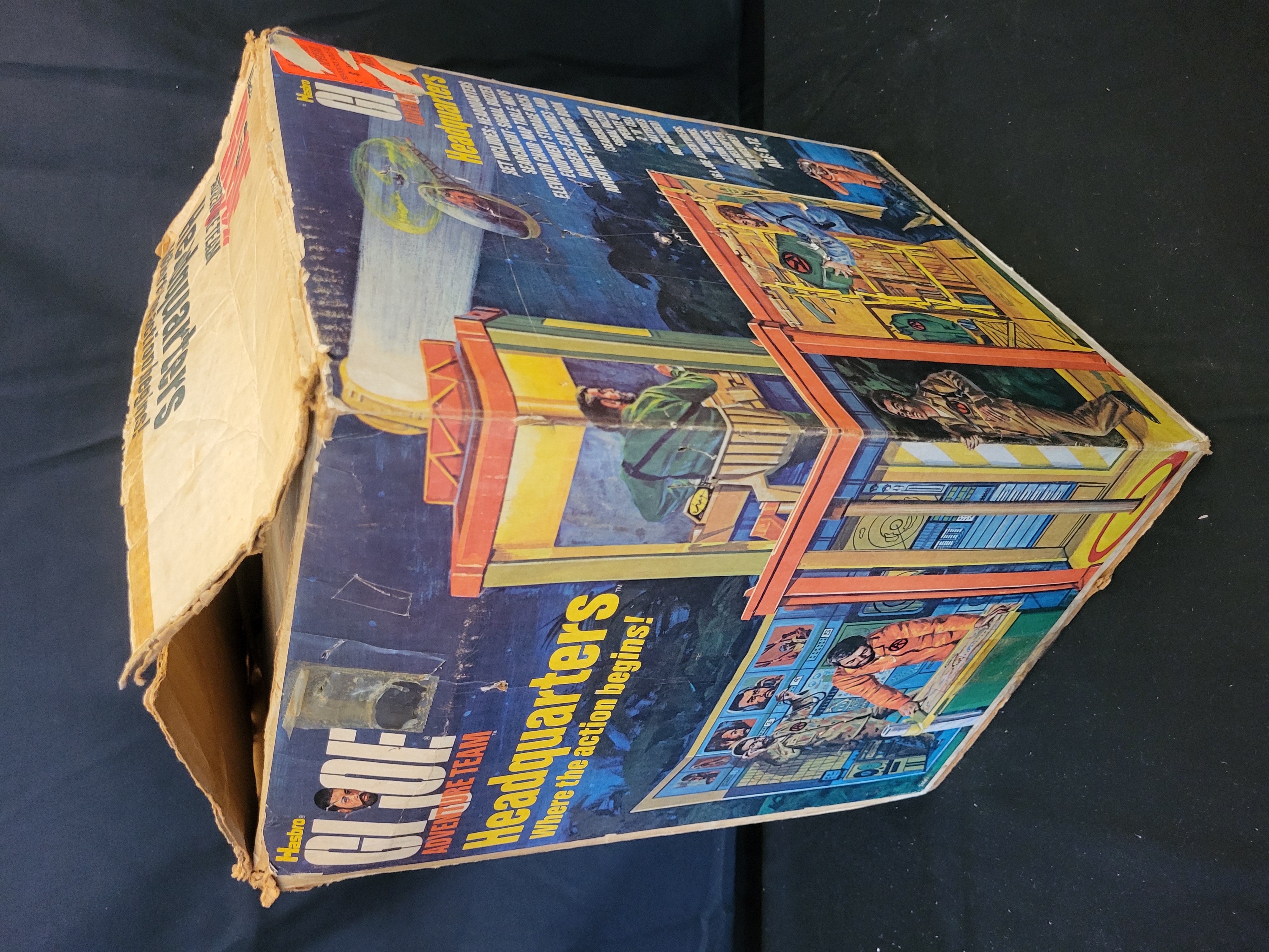 BID PER WHAT YOU SEE IN THE PHOTO, NOT THE AI GENERATED TITLES AND DESCRIPTIONS! A 1972 Hasbro G.I. Joe Adventure Team Headquarters playset. The set is constructed from molded plastic and vinyl-coated cardboard. It features a central folding tower unit with colorful illustrated interior scenes and exterior Checkpoint signage. The lot includes an assortment of plastic accessories such as control consoles with decals, yellow modular panels, orange structural pieces, and a searchlight. Also included is an original paper assembly instruction sheet. The playset is housed in its original illustrated cardboard box.