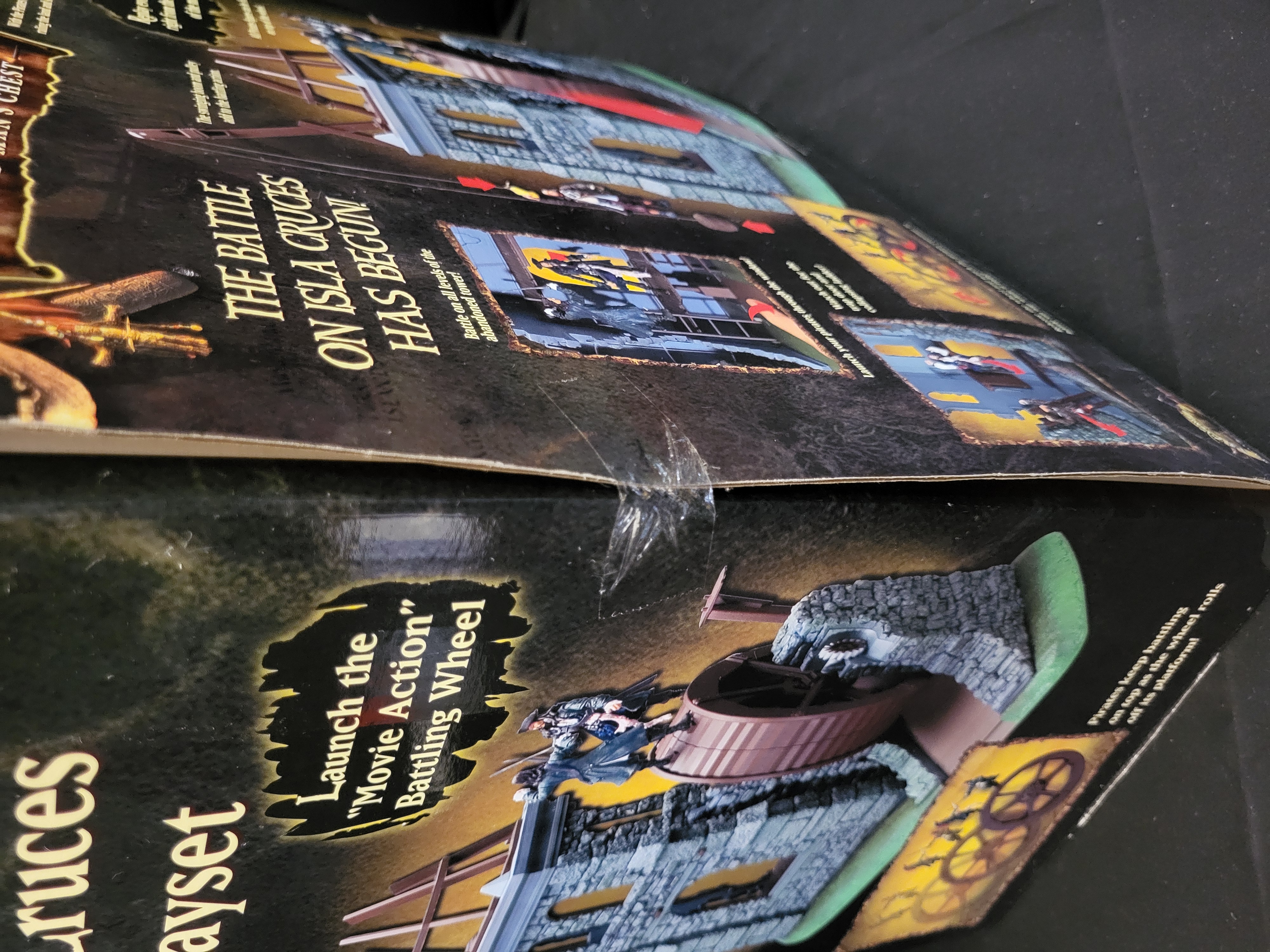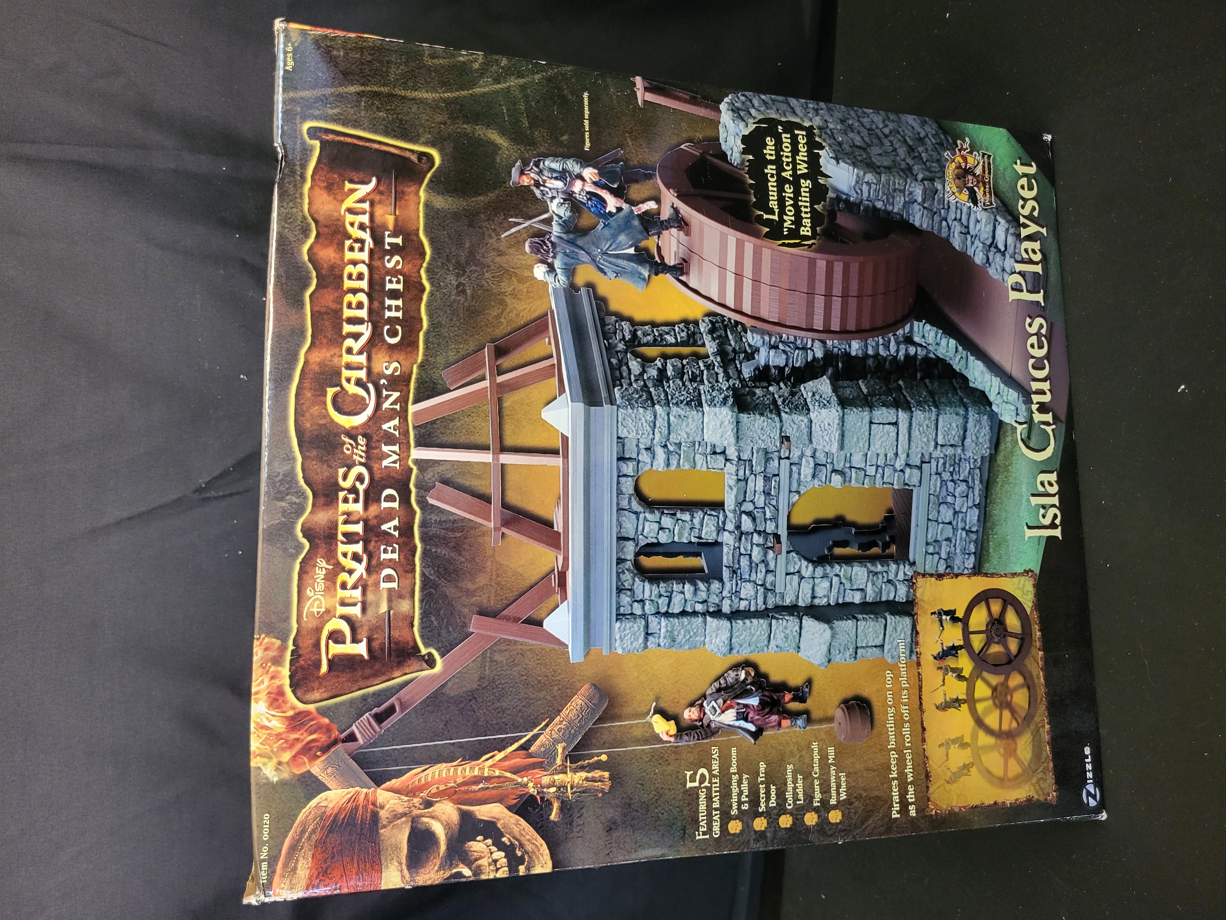 BID PER WHAT YOU SEE IN THE PHOTO, NOT THE AI GENERATED TITLES AND DESCRIPTIONS! A boxed Disney Pirates of the Caribbean: Dead Mans Chest Isla Cruces playset manufactured by Zizzle, circa 2006. This plastic playset is modeled after scenes from the motion picture and features a movie action battling wheel, a swinging boom and pulley, a secret trap door, a collapsing ladder, a figure catapult, and a runaway mill wheel. The item is identified by product number 00120 and includes original manufacturer branding and film-related graphics. The playset is housed in its original color-illustrated cardboard packaging. Action figures were sold separately and are not included with this lot.