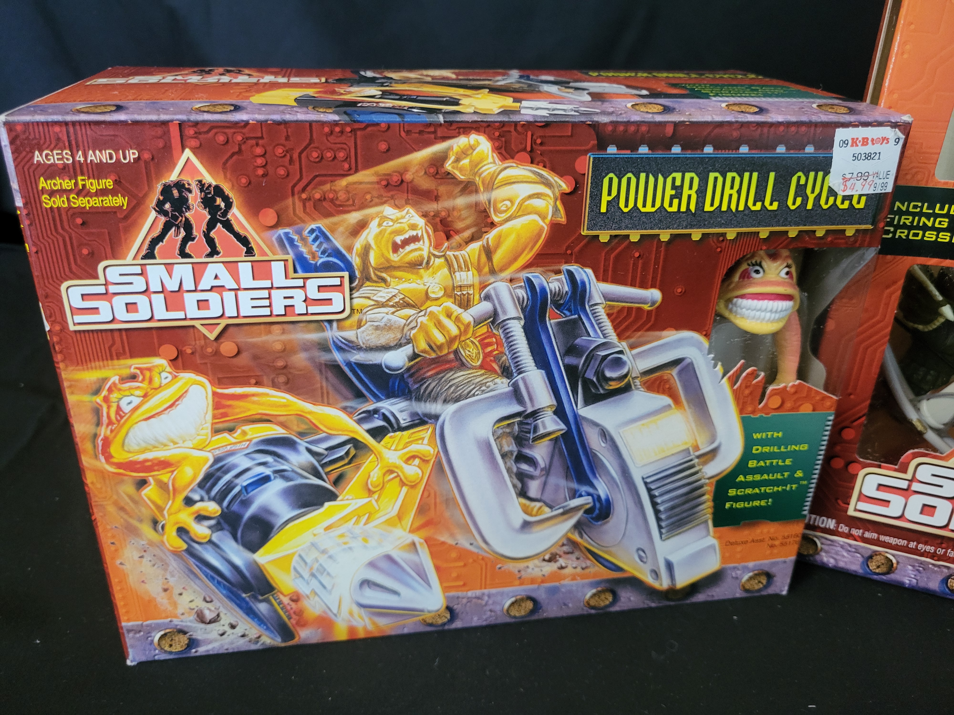 BID PER WHAT YOU SEE IN THE PHOTO, NOT THE AI GENERATED TITLES AND DESCRIPTIONS! Two Kenner Small Soldiers action figure playsets based on the 1998 motion picture. The collection features a 12-inch Archer Gorgonite Leader action figure and a Power Drill Cycle vehicle playset. The Archer figure is constructed of molded plastic and includes a firing crossbow accessory. The Power Drill Cycle includes a Scratch-it figure and features a drilling battle assault action. Both items are contained within their original illustrated cardboard boxes with transparent plastic display windows. The packaging displays original KB Toys retail price stickers and character-specific branding.