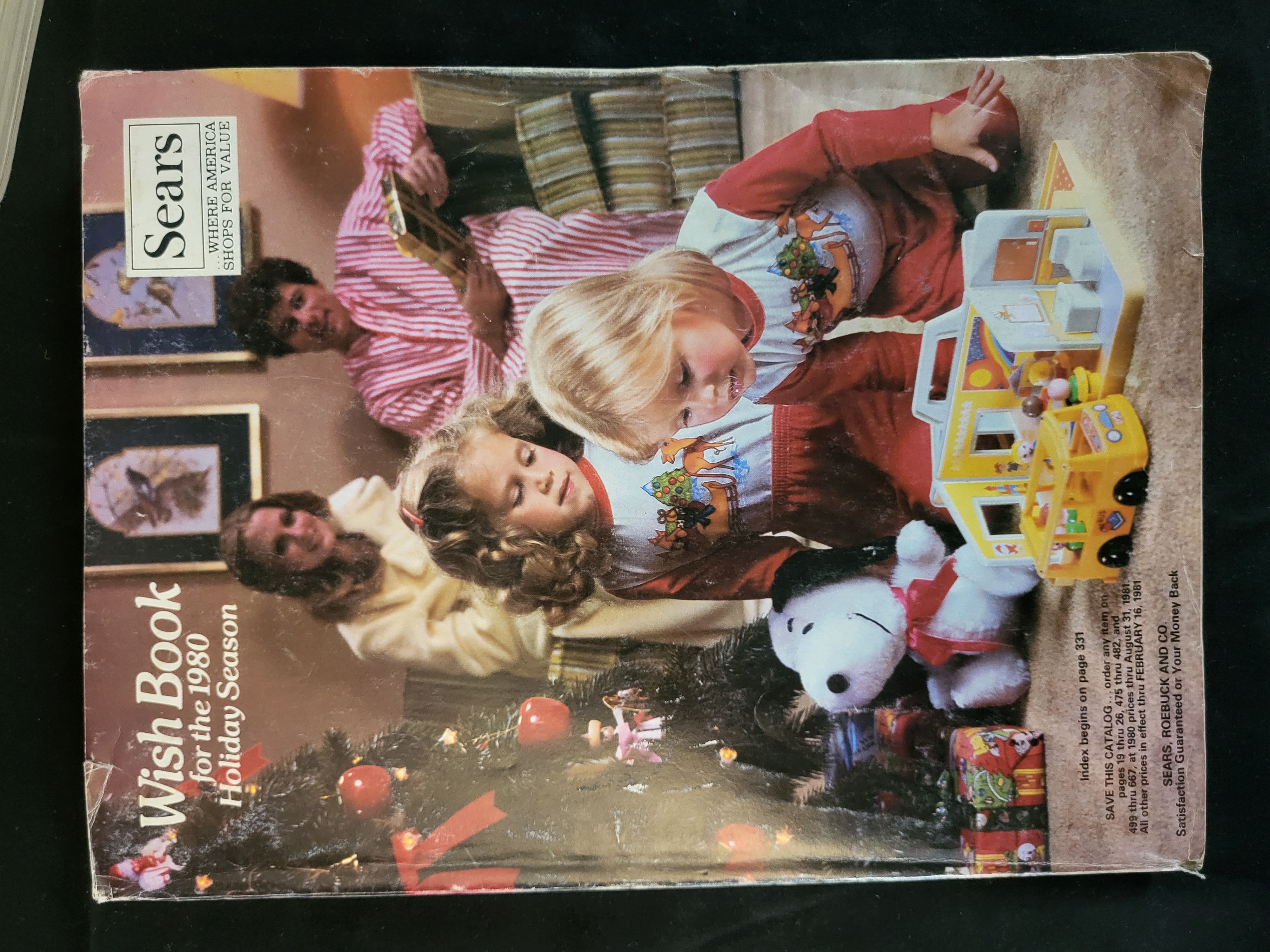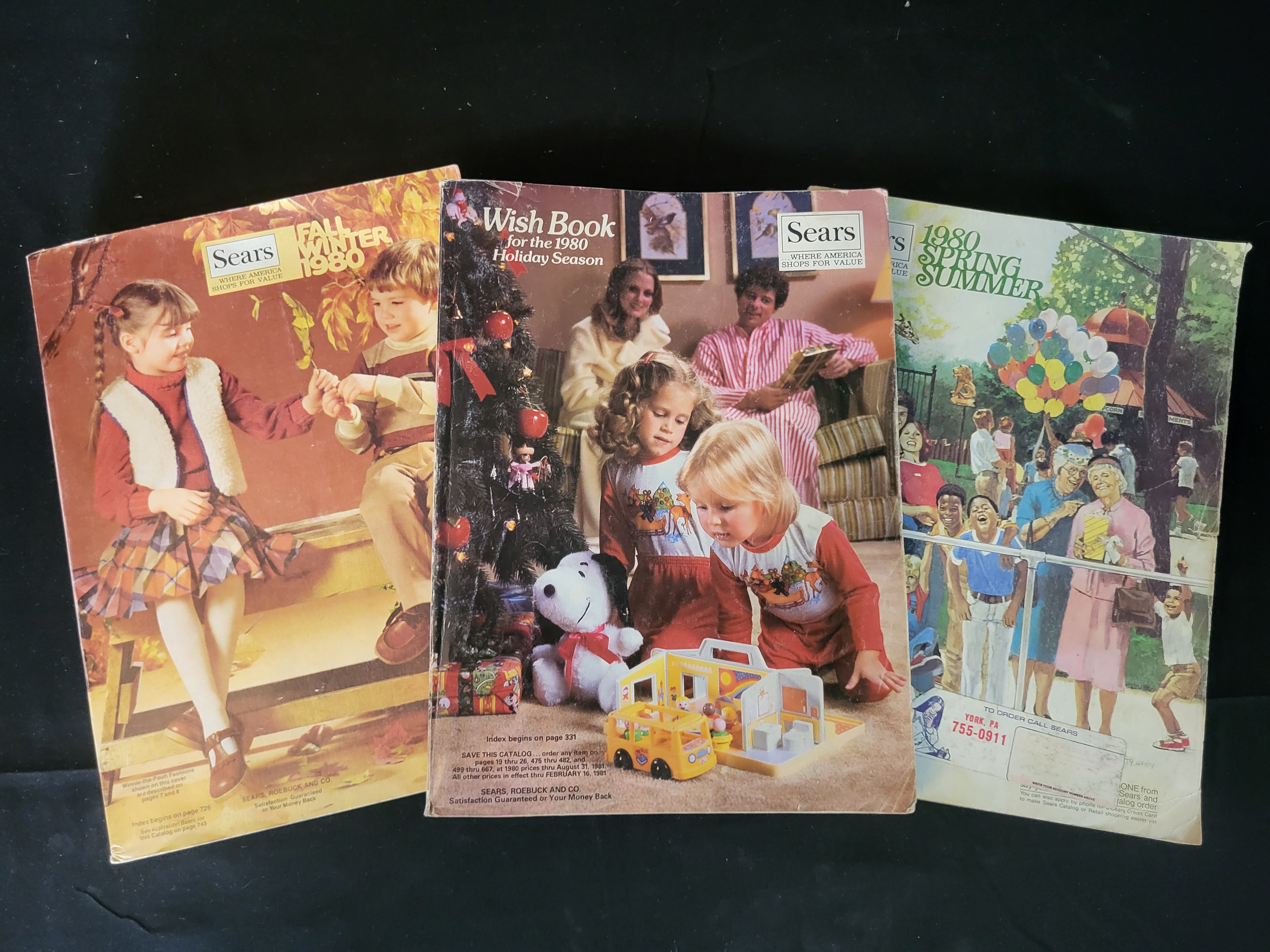 BID PER WHAT YOU SEE IN THE PHOTO, NOT THE AI GENERATED TITLES AND DESCRIPTIONS! A trio of vintage mail-order catalogs from Sears, Roebuck and Co., all dating to 1980. This collection includes the 1980 Spring Summer catalog, the Fall Winter 1980 catalog, and the Wish Book for the 1980 Holiday Season. These printed paper ephemera items feature full-color cover photography. The Wish Book cover depicts a family holiday scene with a Christmas tree, toys, and a Snoopy plush, while the Fall Winter issue shows children in autumnal attire. Interior and back-cover content includes advertisements for Kenmore laundry appliances and designer home fashions by Diane von Furstenberg, specifically the Eternal Tree Bed Fashions line. The catalogs are constructed with softcover paper bindings and feature standard period typography and layout.