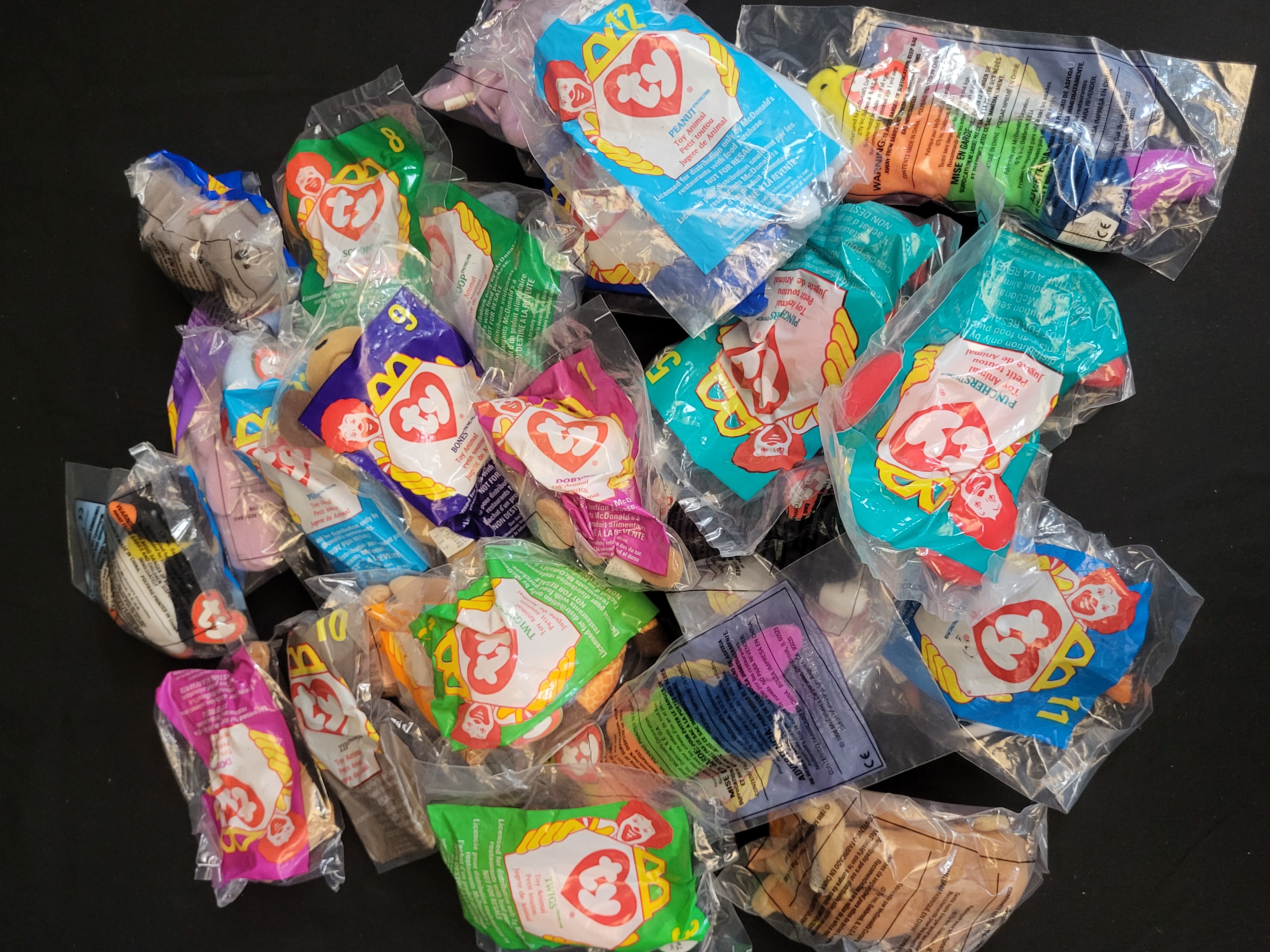 BID PER WHAT YOU SEE IN THE PHOTO, NOT THE AI GENERATED TITLES AND DESCRIPTIONS! A collection of Ty Teenie Beanie Babies produced in 1998 as a promotional collaboration for McDonald’s Corporation. Each plush toy is contained within its original, factory-sealed plastic polybag featuring the Ty heart and McDonald’s logos. The collection includes various characters such as Peanut, Scoop, Bones, Doby, and Twigs. The packaging displays character names and manufacturing details in English, French, and Spanish, including the phrases Jouet de Animal and Juguete de Animal. The bags are printed with the copyright date of 1998 McDonald’s Corporation and indicate the items were manufactured in China.