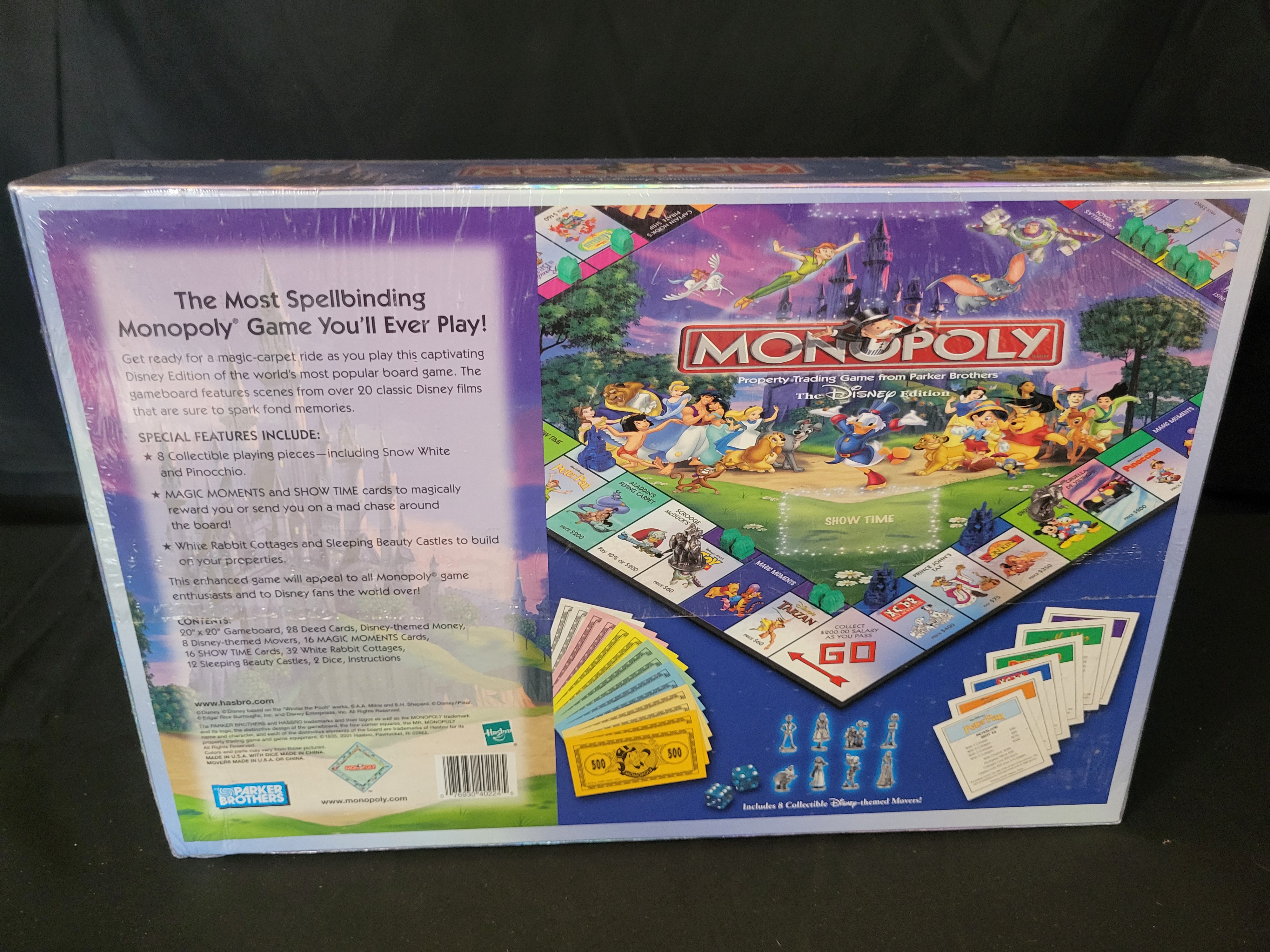 BID PER WHAT YOU SEE IN THE PHOTO, NOT THE AI GENERATED TITLES AND DESCRIPTIONS! This lot consists of a factory-sealed copy of Monopoly The Disney Edition produced by Parker Brothers in 2001. The front of the box features a variety of Disney and Pixar characters against a castle background, framed by an iridescent holographic border. The reverse side details the game contents, which include a 20-inch by 20-inch gameboard, 28 deed cards, Disney-themed currency, 8 collectible Disney-themed movers, 16 Magic Moments cards, 16 Show Time cards, 32 White Rabbit Cottages, 12 Sleeping Beauty Castles, 2 dice, and an instruction manual. The Parker Brothers and Hasbro logos are present on the packaging.