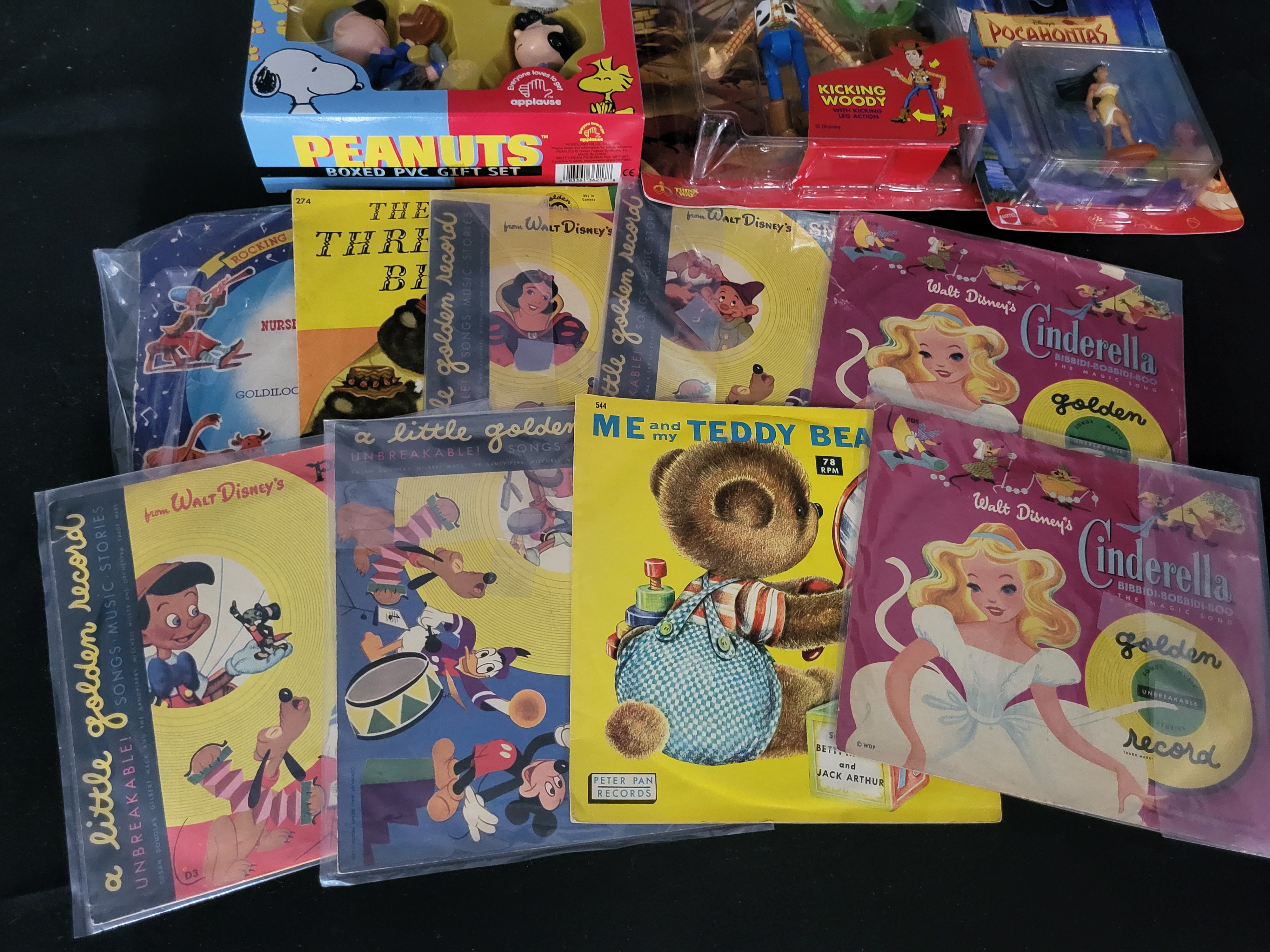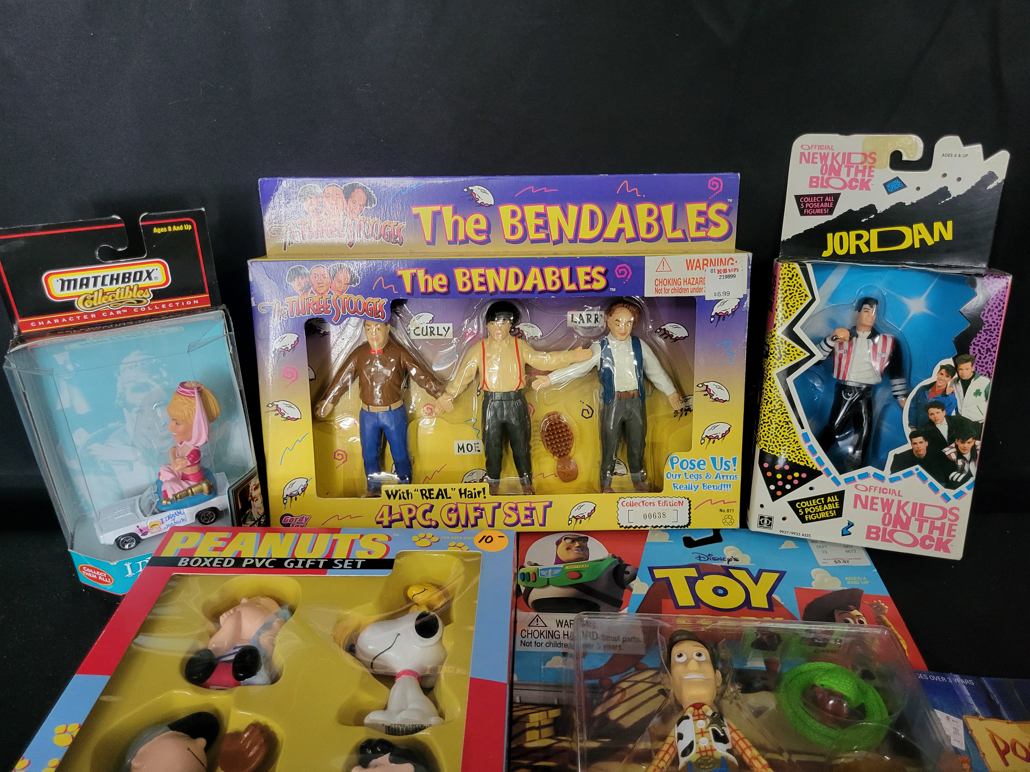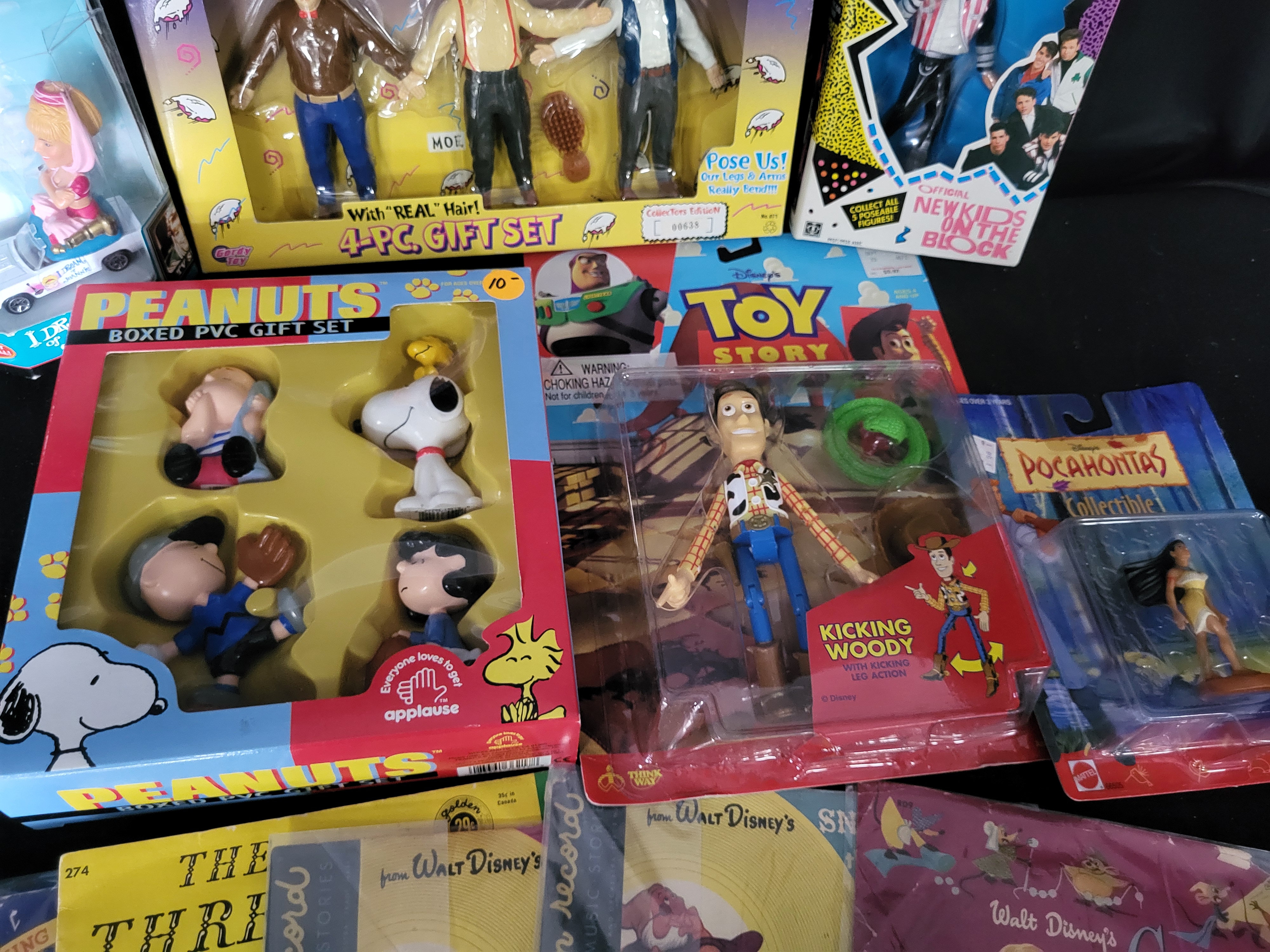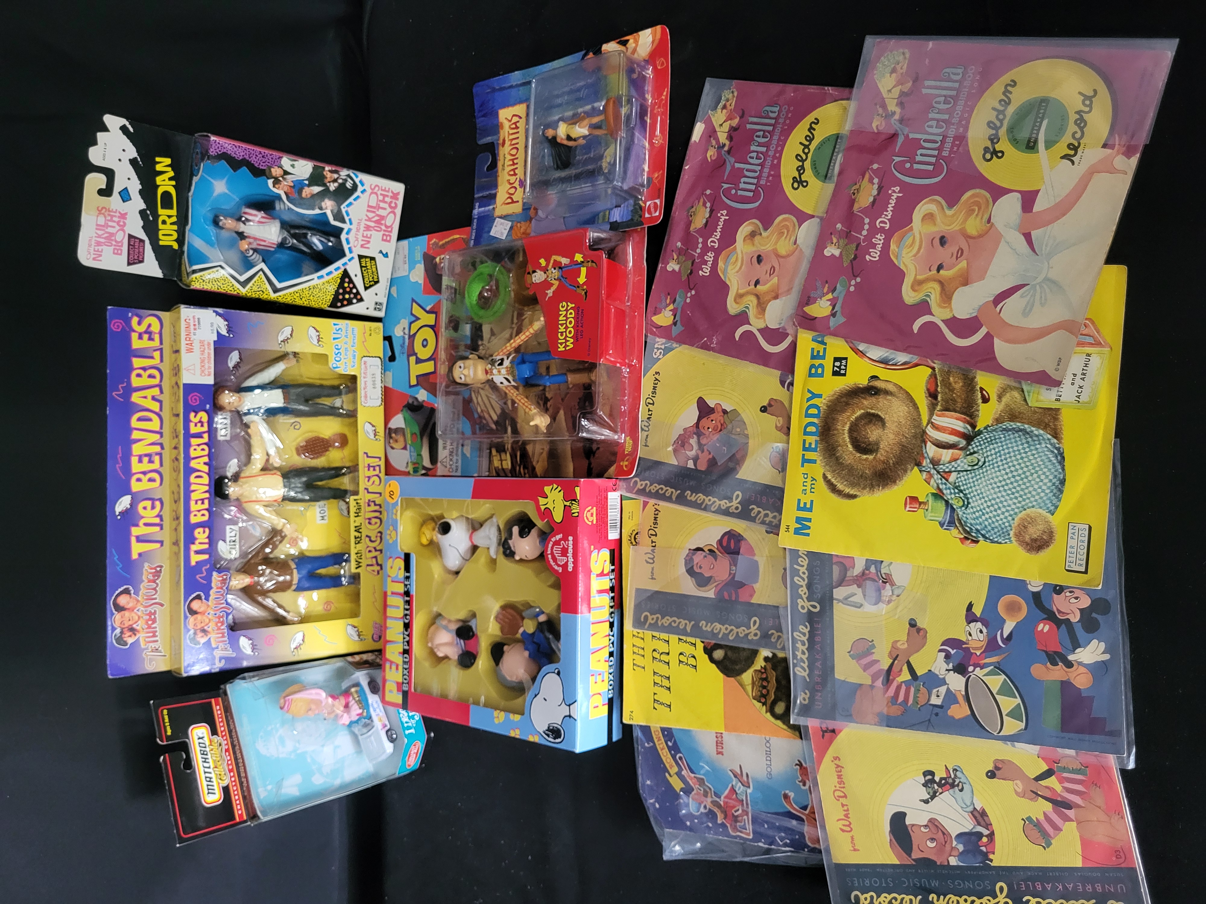 BID PER WHAT YOU SEE IN THE PHOTO, NOT THE AI GENERATED TITLES AND DESCRIPTIONS! This collection features an assortment of vintage action figures and children’s media. The group includes a Gordy Toy The Three Stooges The Bendables 4-piece gift set, a Hasbro New Kids on the Block Jordan Knight action figure, a Thinkway Toy Story Kicking Woody figure with kicking action, and an Applause Peanuts boxed PVC gift set featuring Snoopy, Charlie Brown, and Lucy. Additional items include a Matchbox Collectibles I Dream of Jeannie character car and a Mattel Pocahontas collectible figure. The media portion of the lot consists of several Little Golden Records with Walt Disney titles including Cinderella, Pinocchio, Snow White and the Seven Dwarfs, and The Three Little Pigs, as well as a Peter Pan Records 78 RPM disc titled Me and My Teddy Bear. Also included is a bag of vintage paper hockey player cutouts, including Chicago team members, and a red plastic goal frame. The figures are primarily composed of molded plastic and PVC, with most retained in their original retail blister packs or window boxes.