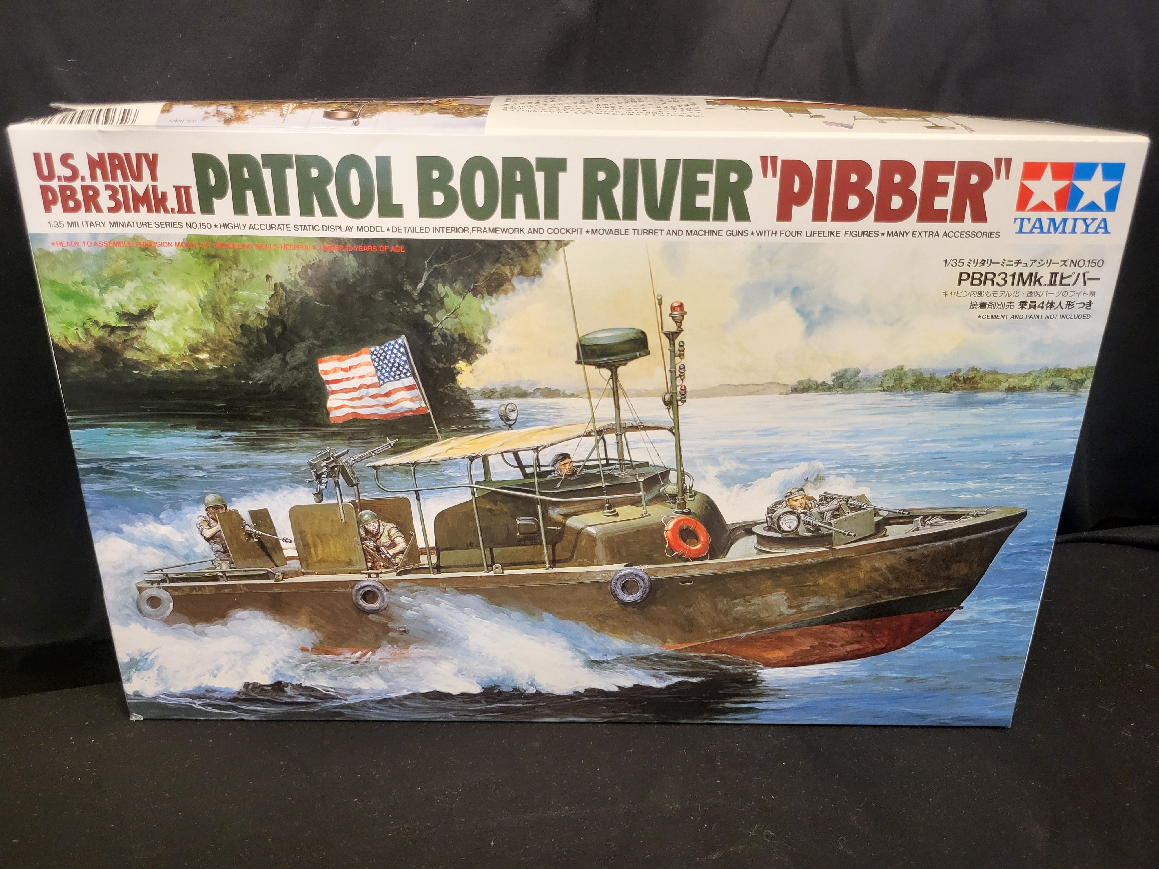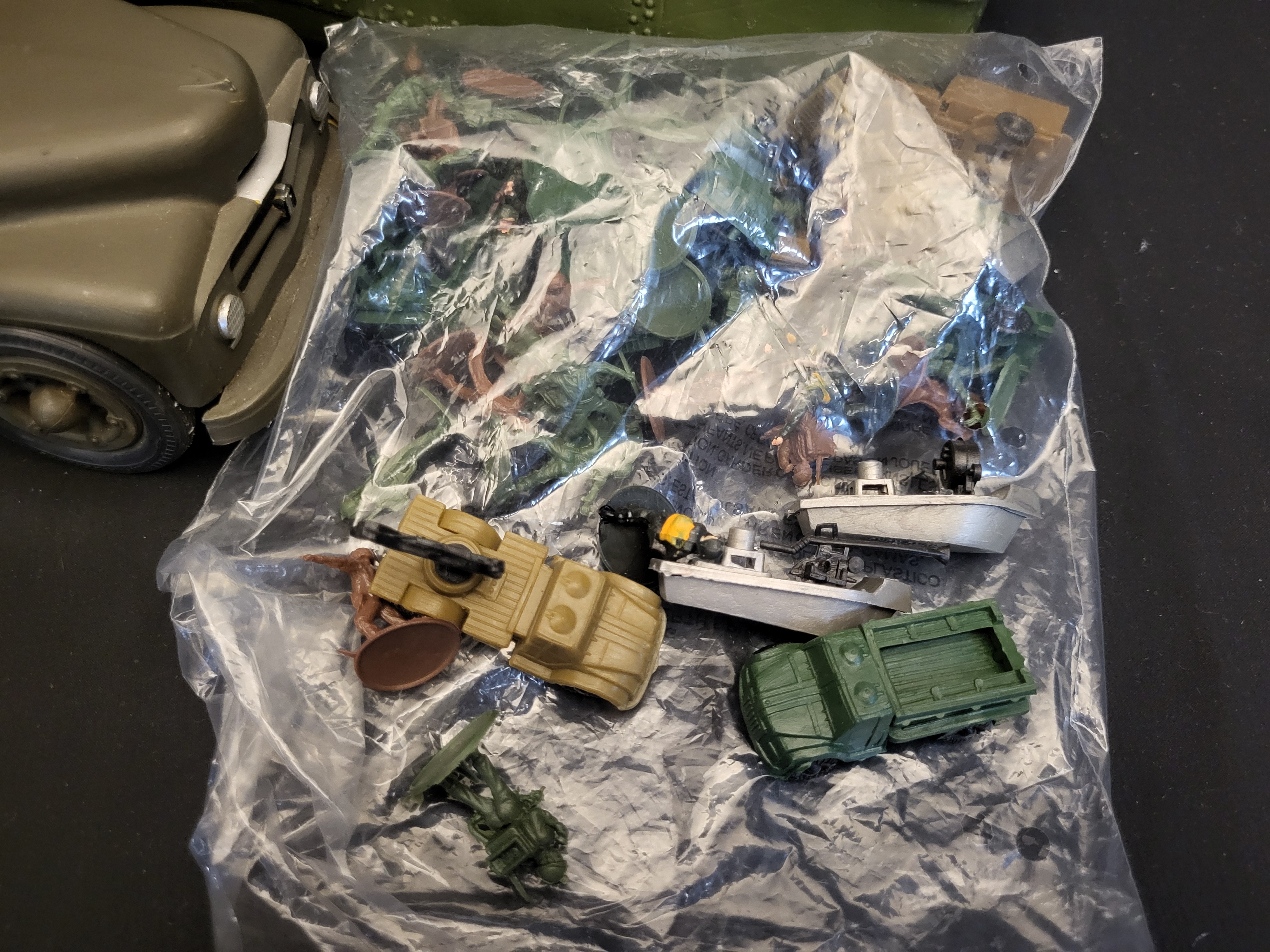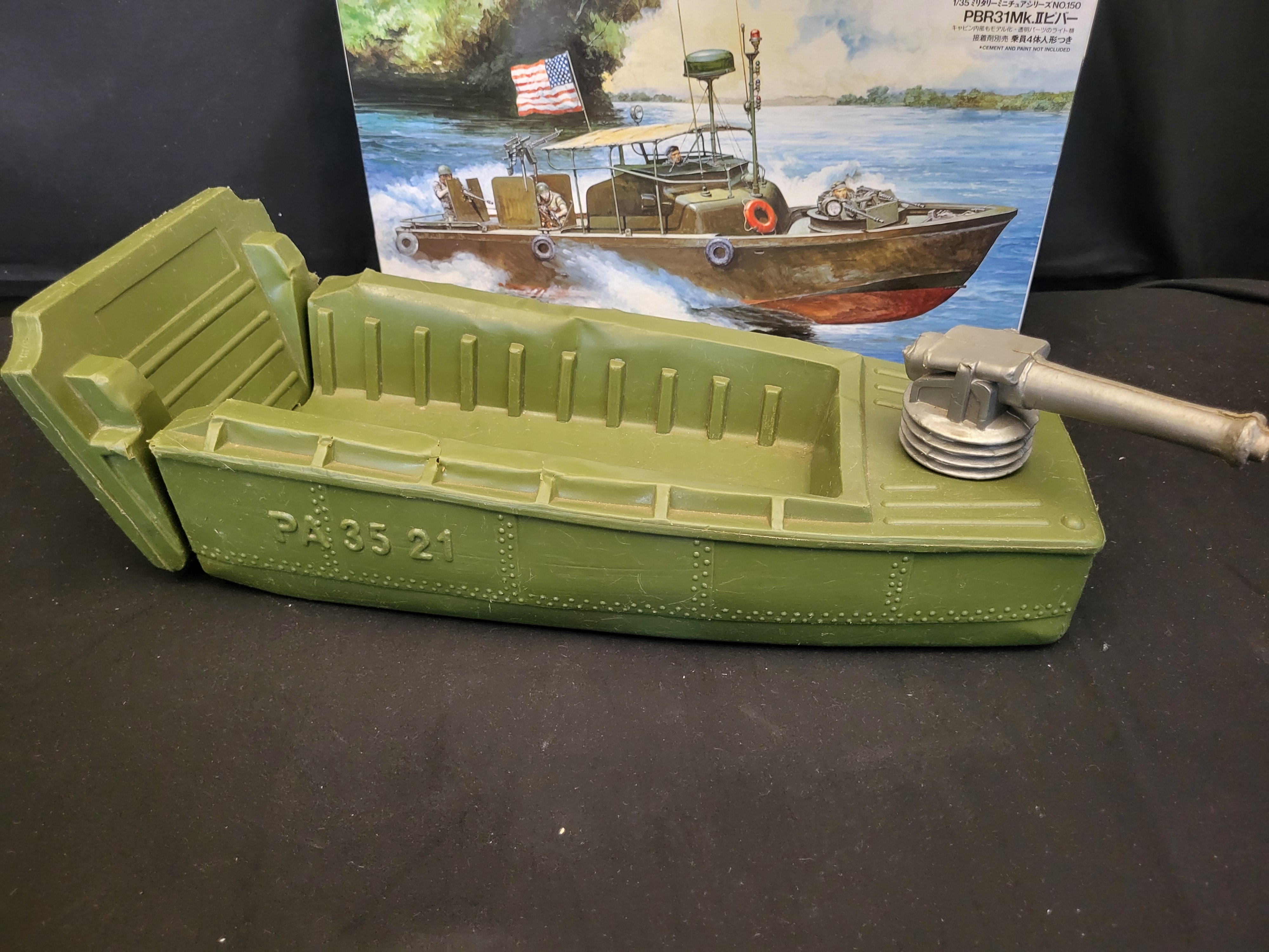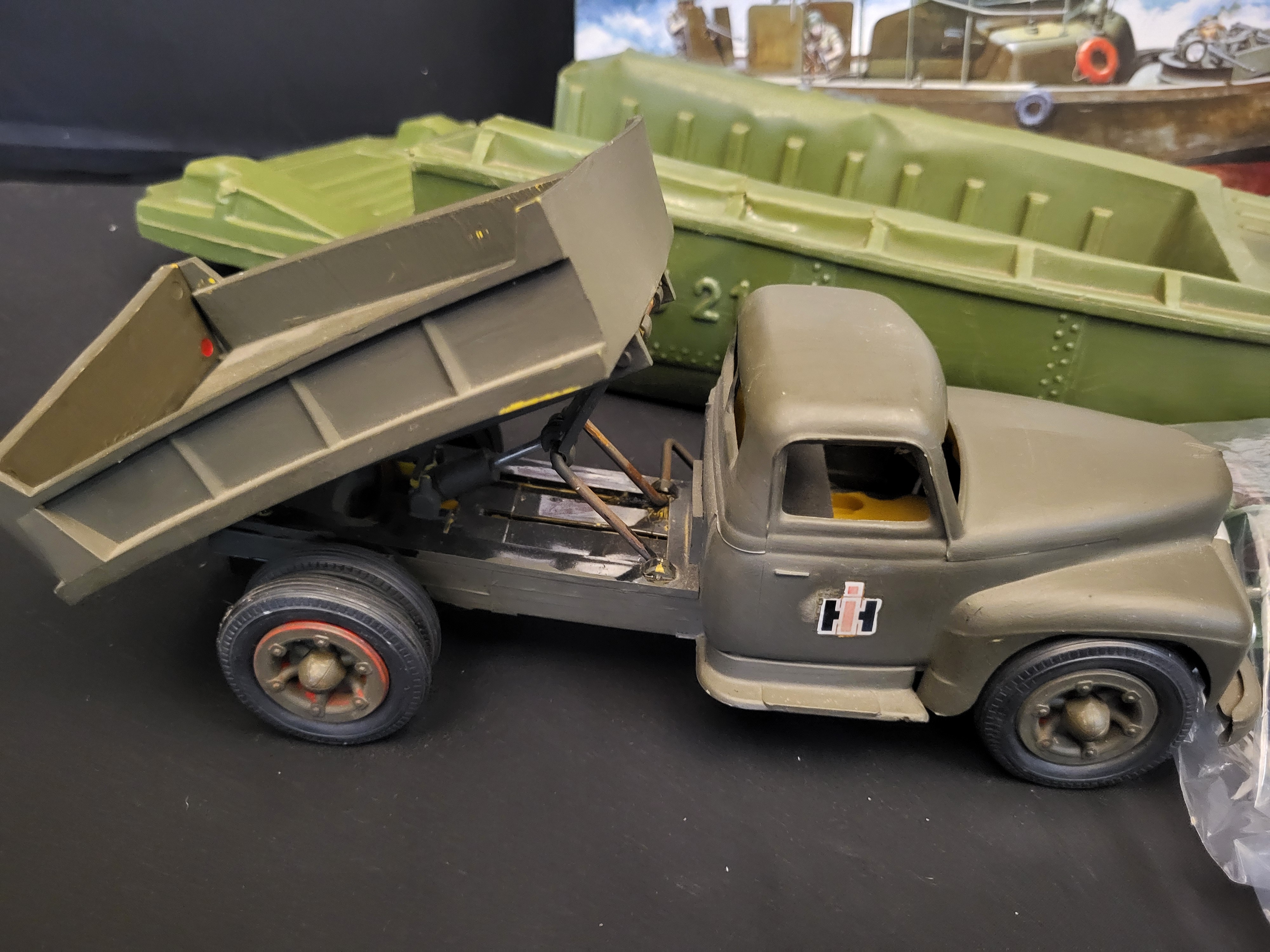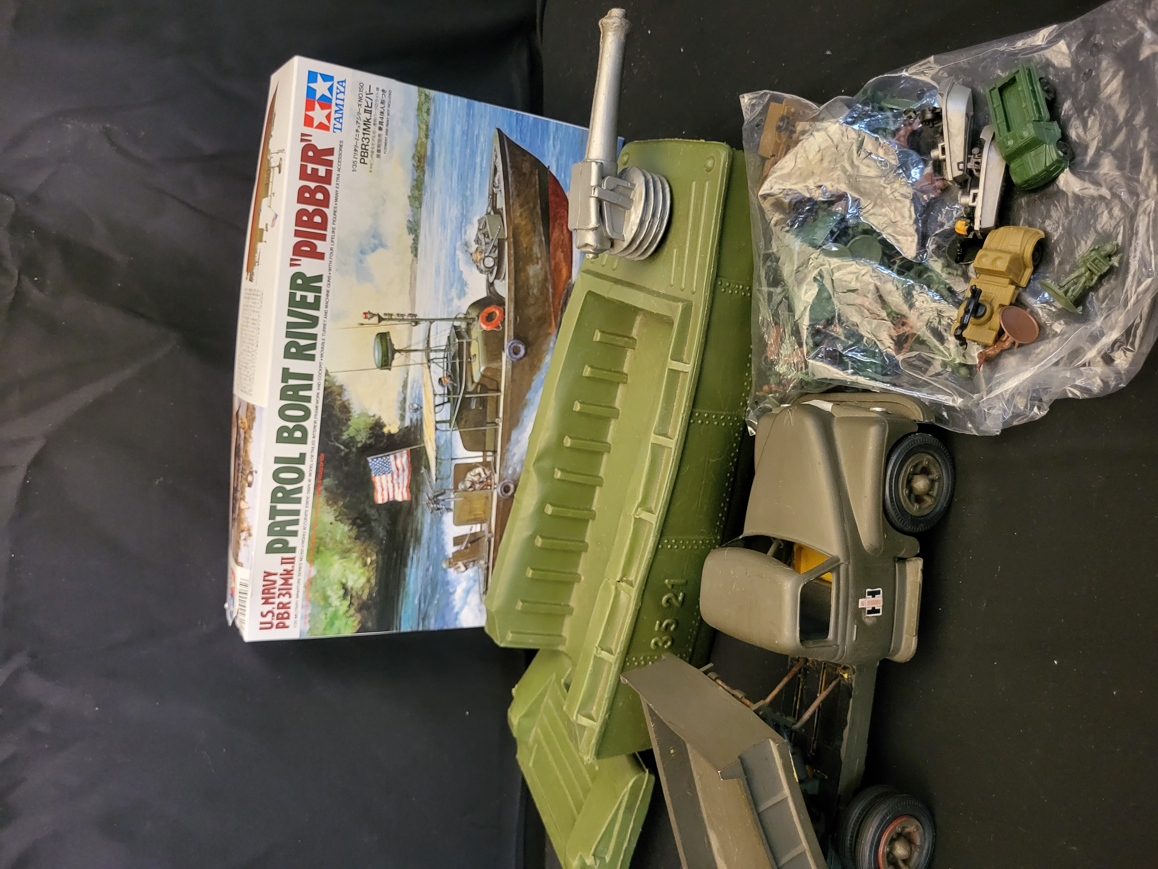 BID PER WHAT YOU SEE IN THE PHOTO, NOT THE AI GENERATED TITLES AND DESCRIPTIONS! A collection of military-themed toys and collectibles featuring a Tamiya 1/35 scale plastic model kit of a U.S. Navy PBR 31 Mk.II Patrol Boat River Pibber in its original illustrated box. The group includes a large olive-drab plastic toy landing craft molded with the markings PA 35 21 and equipped with a silver-tone stern gun. Also included is a drab green dump truck featuring International Harvester IH logos and a functional tilting bed, constructed of pressed steel or heavy plastic. The lot is completed by an assortment of small plastic soldiers and miniature military vehicles contained in a clear plastic bag.