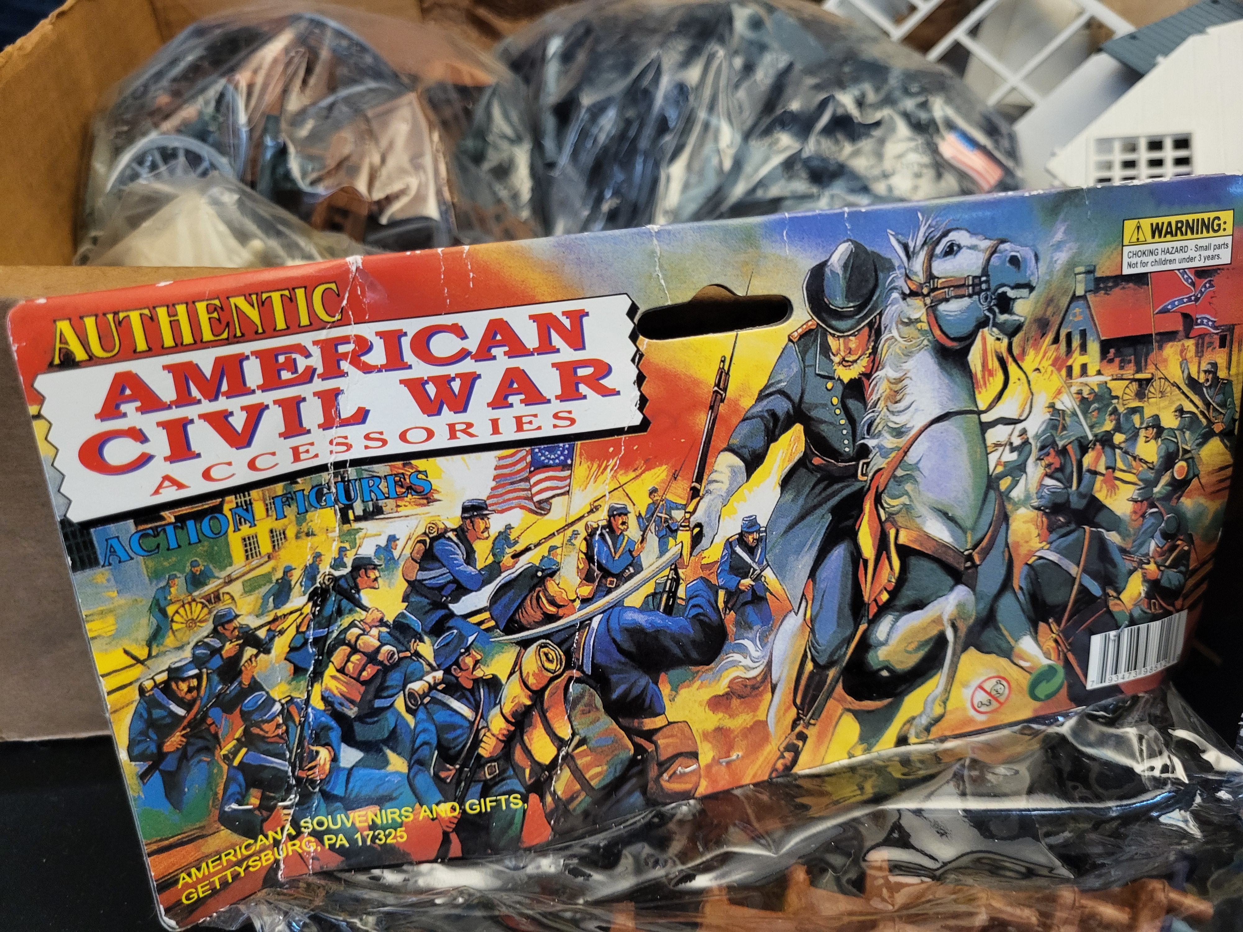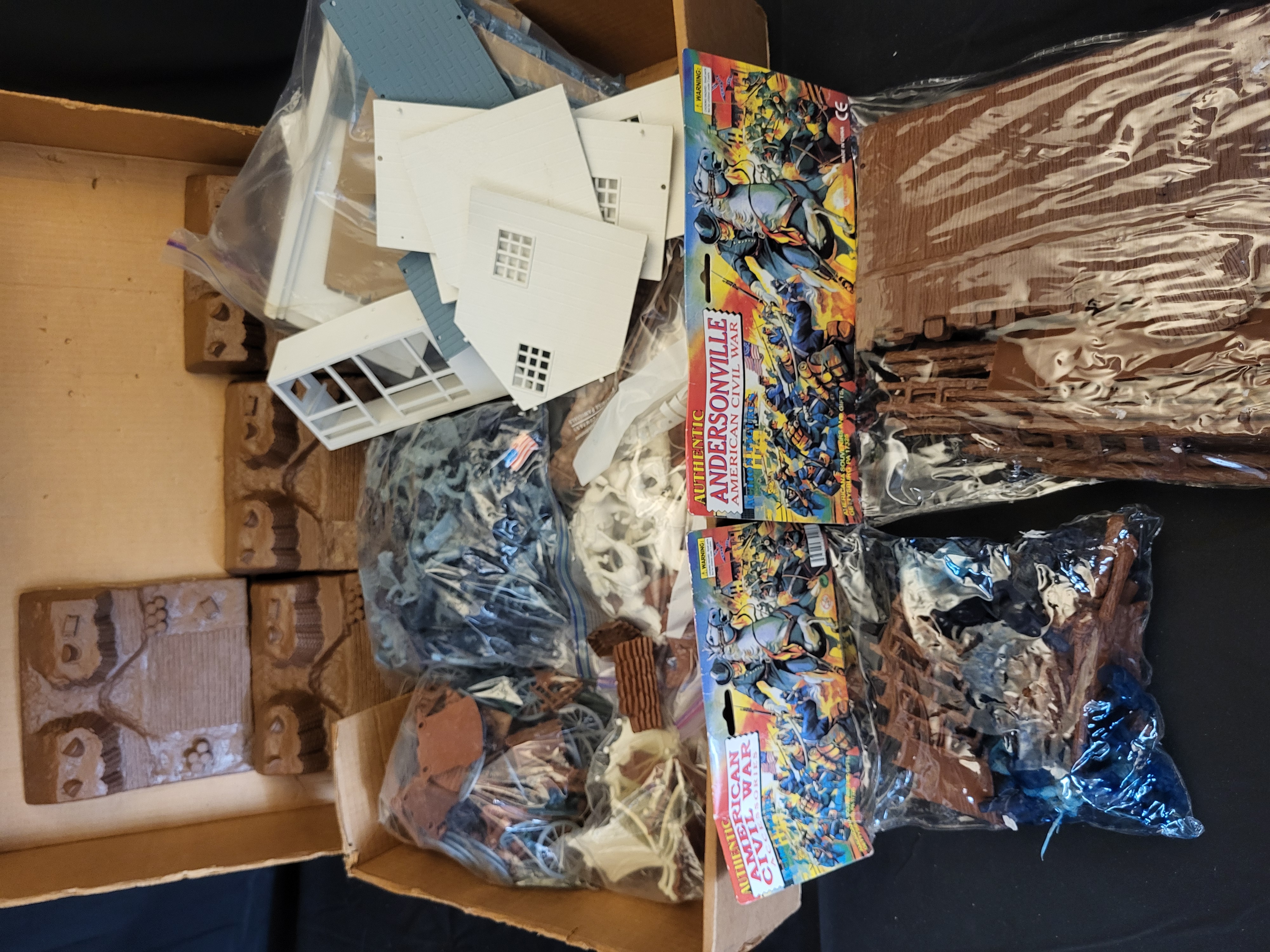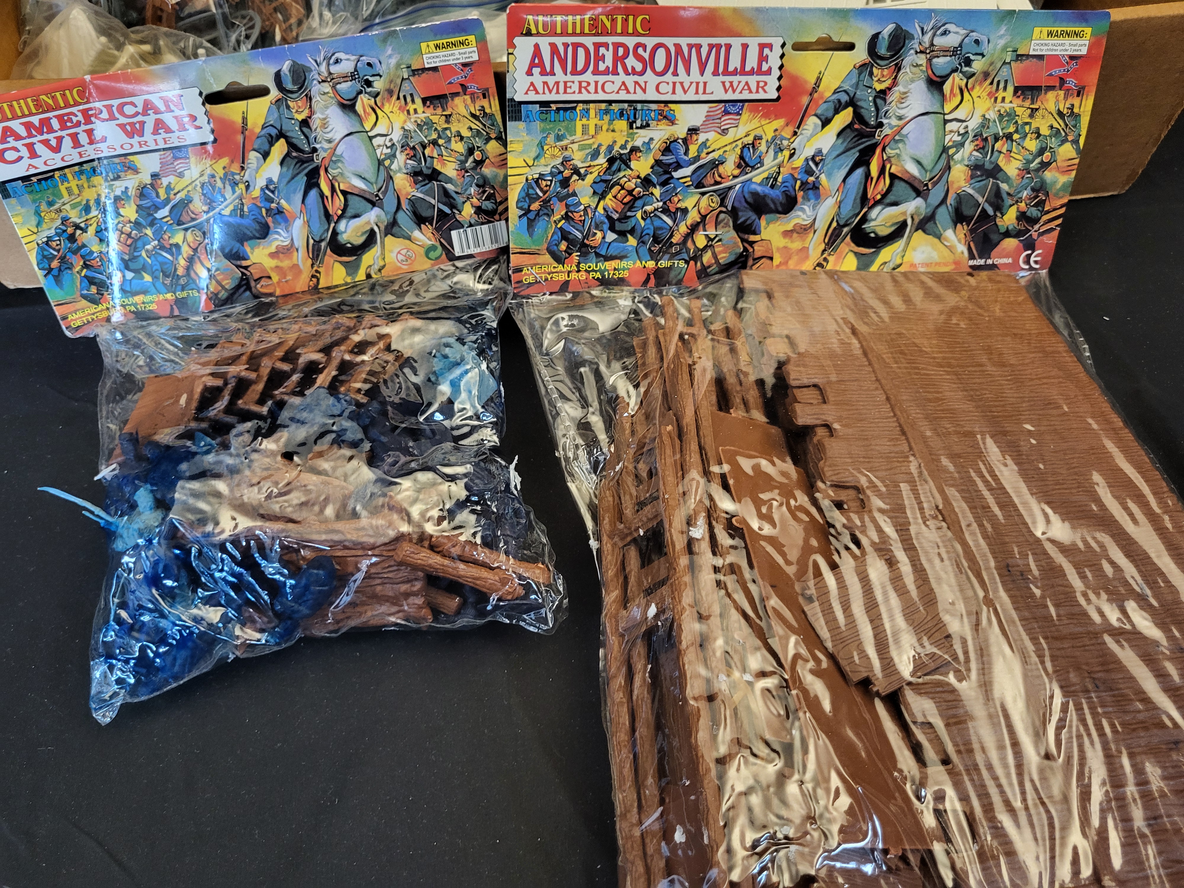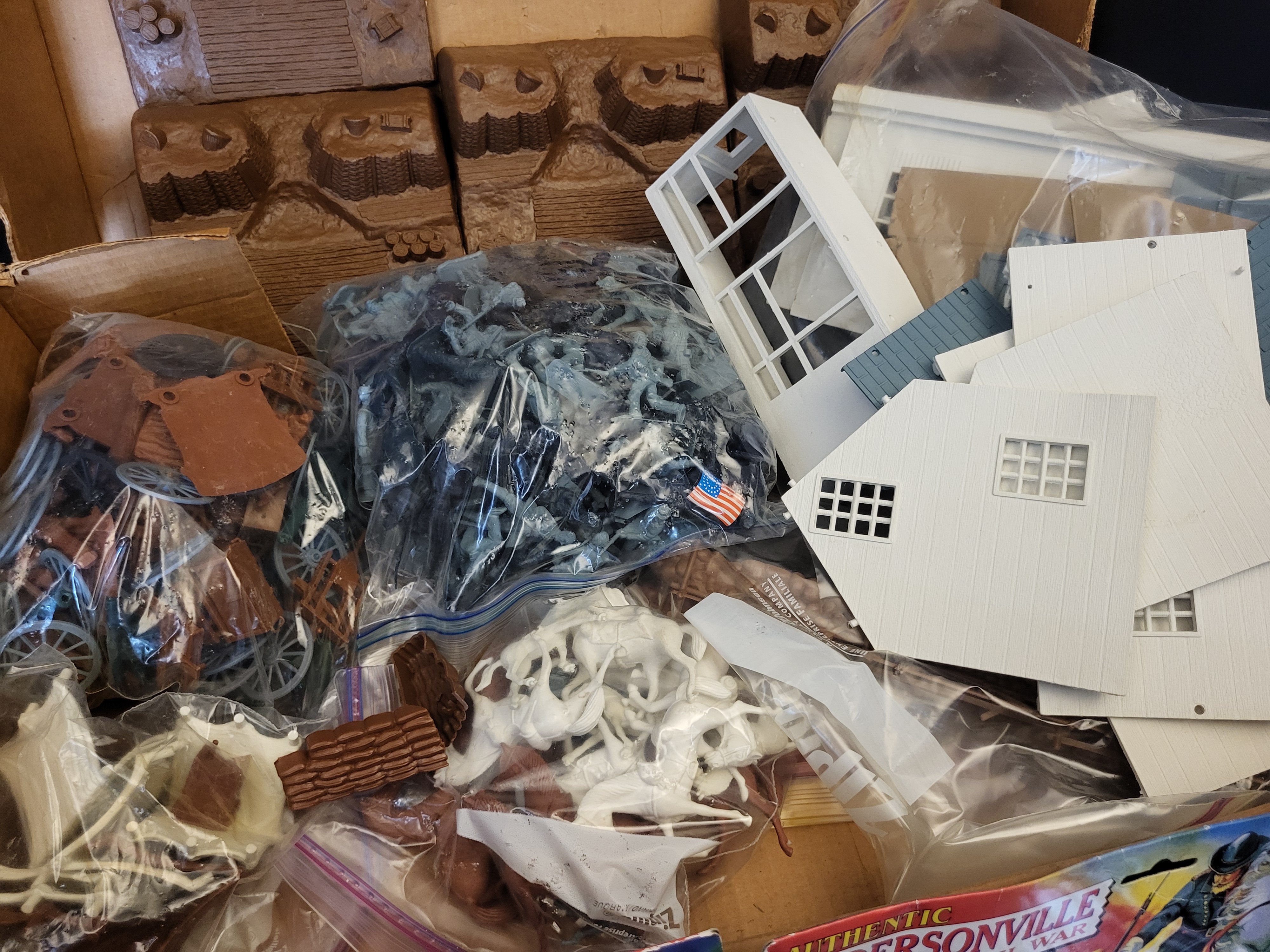 BID PER WHAT YOU SEE IN THE PHOTO, NOT THE AI GENERATED TITLES AND DESCRIPTIONS! This collection features an assortment of American Civil War-themed plastic toy soldier playsets and accessories produced by Americana Souvenirs and Gifts of Gettysburg, PA. The lot includes numerous molded plastic figures in Union blue and Confederate grey, along with white horses and various battlefield accessories such as wagon wheels and split-rail fencing. Several components are contained within their original polybag packaging featuring decorative header cards titled Authentic Andersonville American Civil War and Authentic American Civil War Accessories. Other items, including white plastic building walls with window frames and molded brown terrain pieces representing fortifications, are loose or organized into clear storage bags. Visible markings on the packaging include the manufacturer address in Gettysburg, PA, Made in China, and the CE mark.