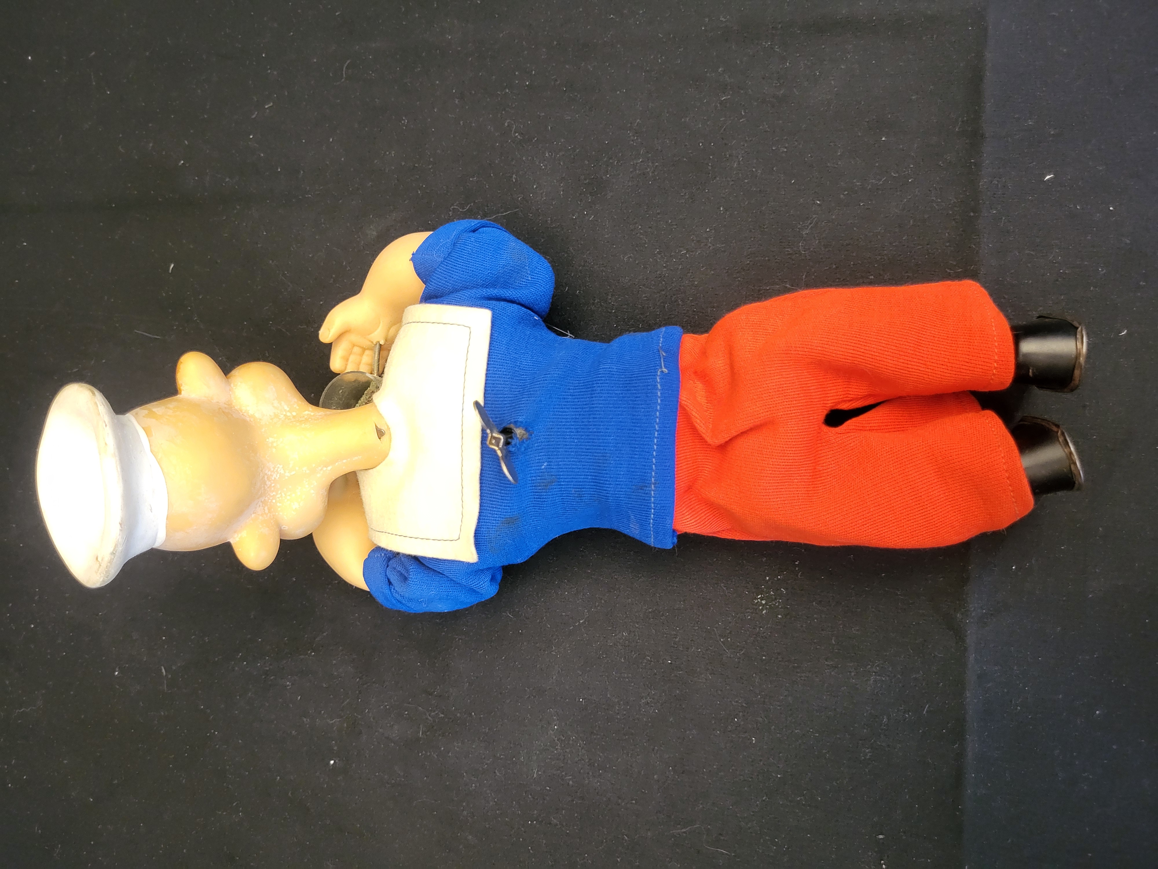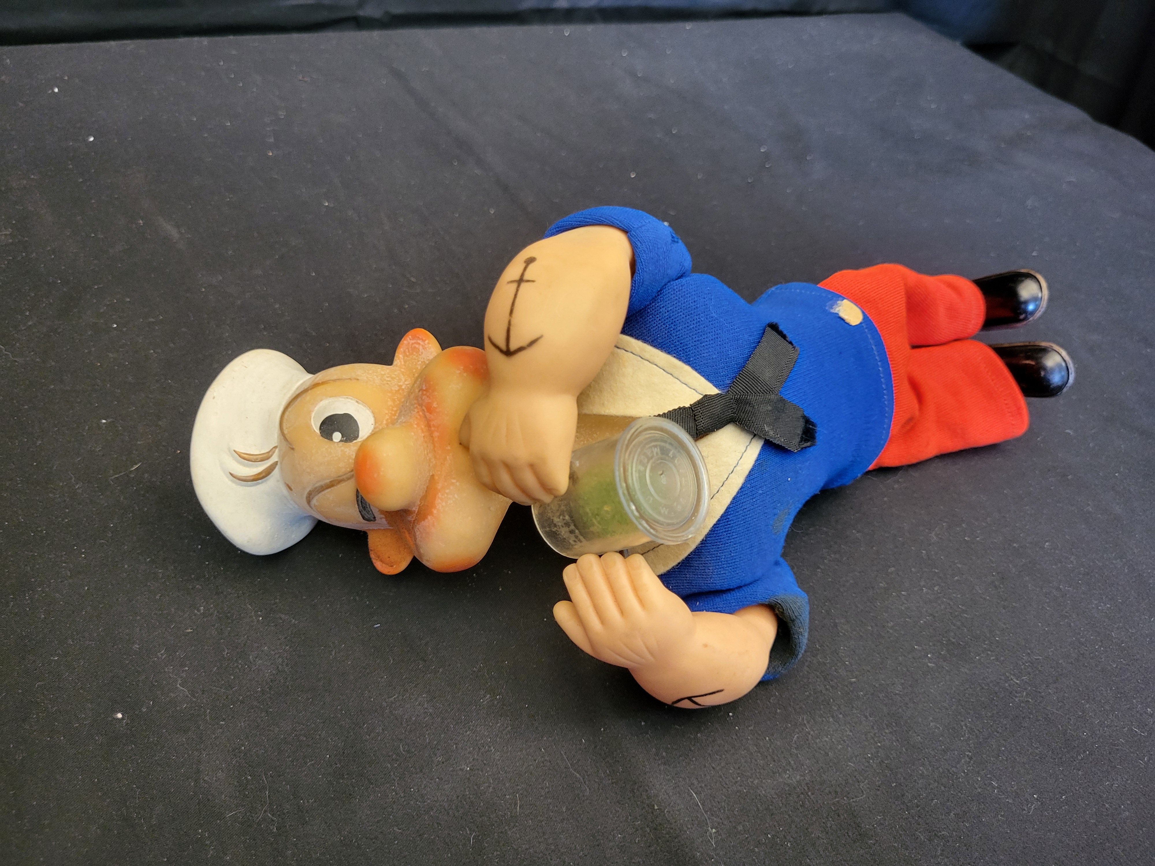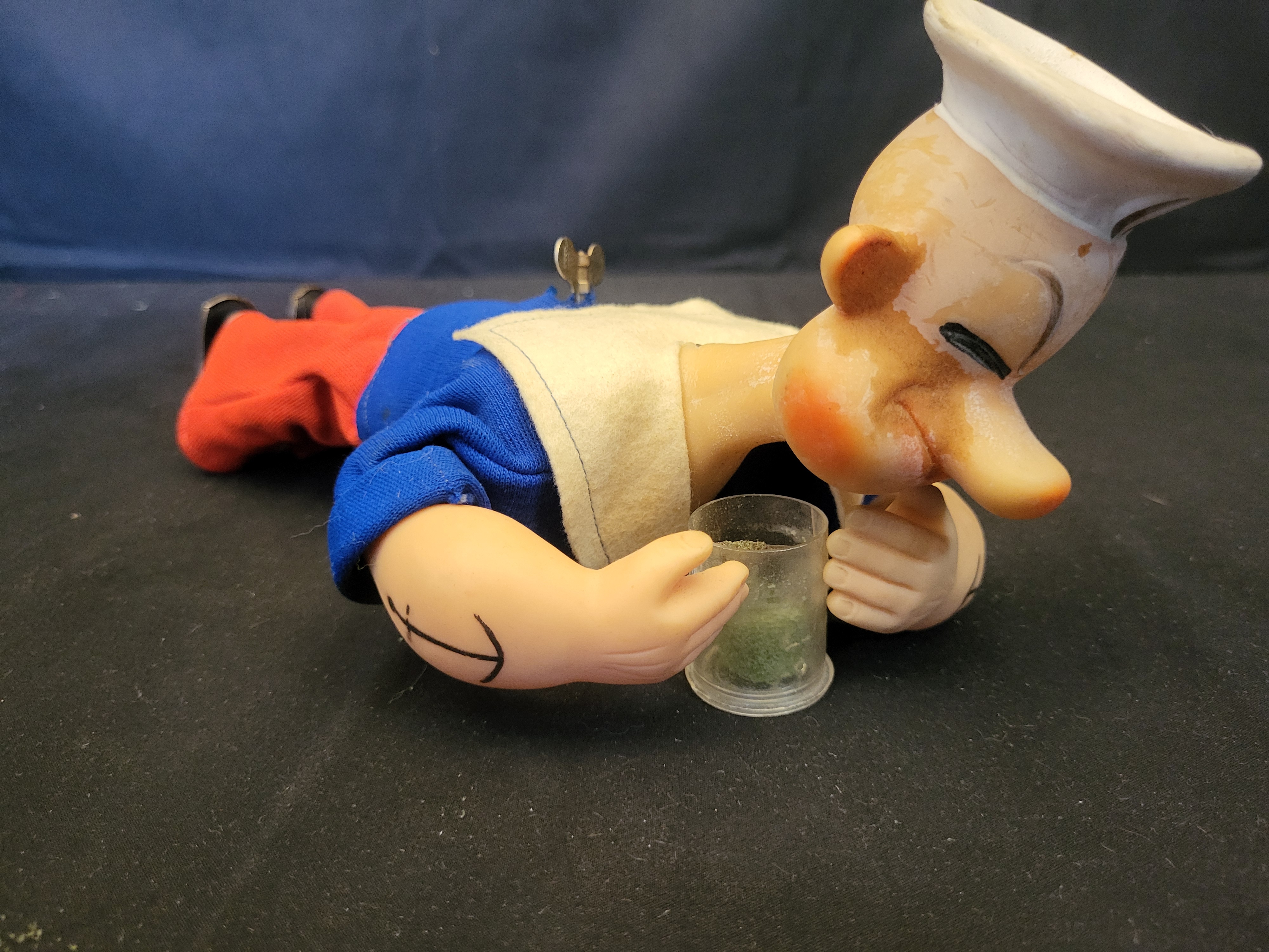 BID PER WHAT YOU SEE IN THE PHOTO, NOT THE AI GENERATED TITLES AND DESCRIPTIONS! A 1950s Gund Manufacturing Co. wind-up toy depicting the character Popeye the Sailor Man in a crawling pose. The figure features a molded vinyl or rubber head and forearms with anchor tattoos. The character is dressed in a fabric outfit consisting of a blue sailor’s shirt with a white collar and black tie, and red trousers. A metal wind-up key is integrated into the back of the figure. The figure holds a clear plastic cup containing green simulated spinach.