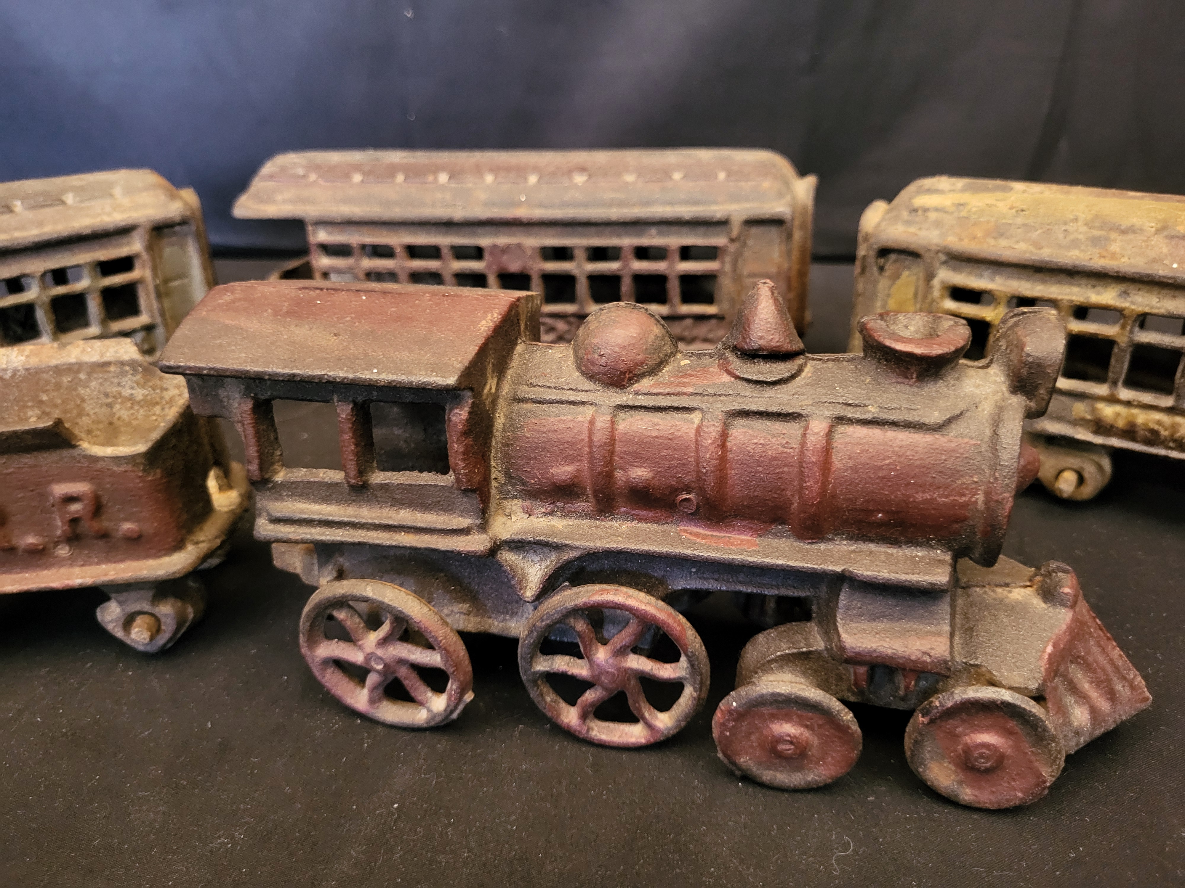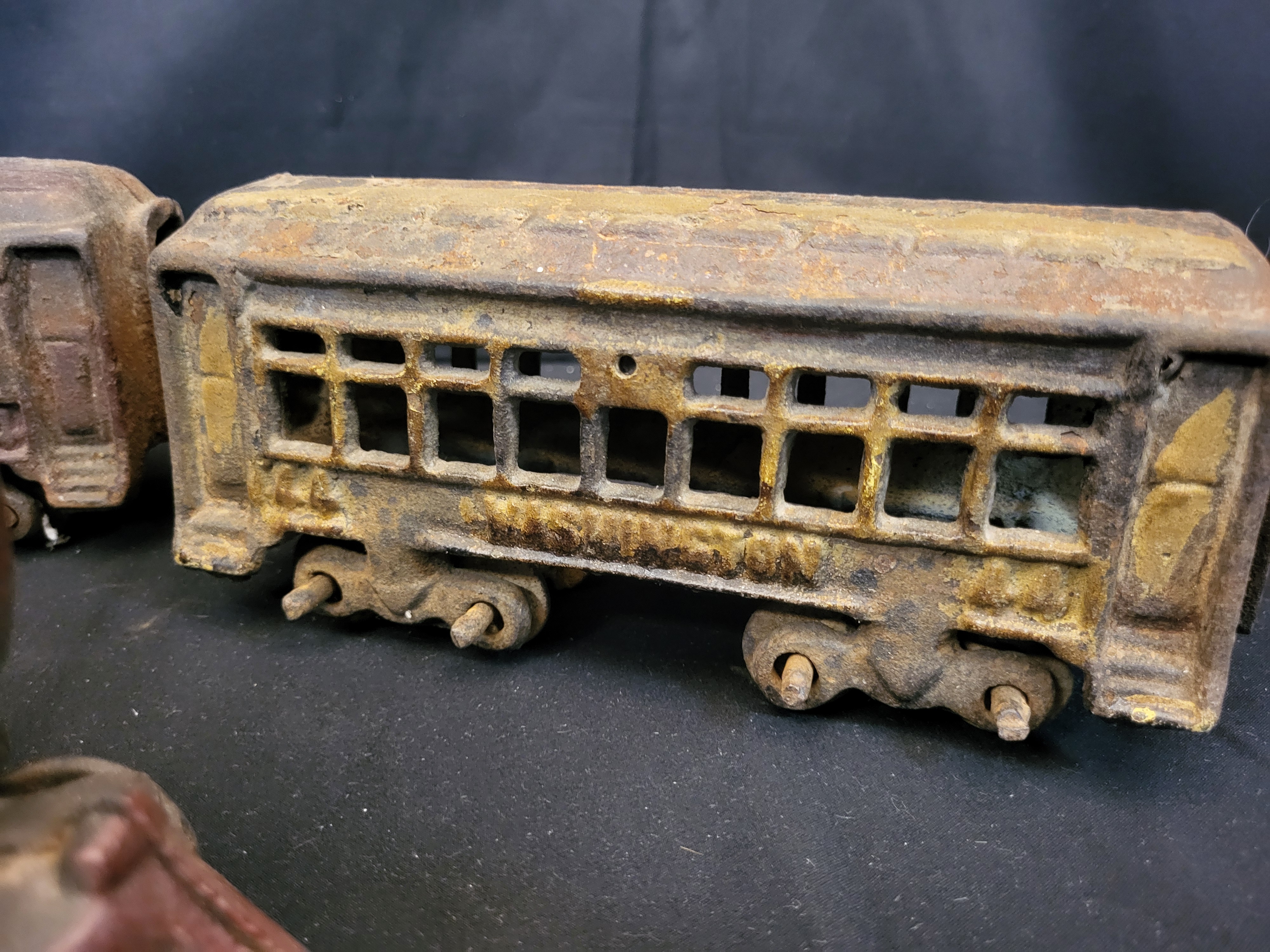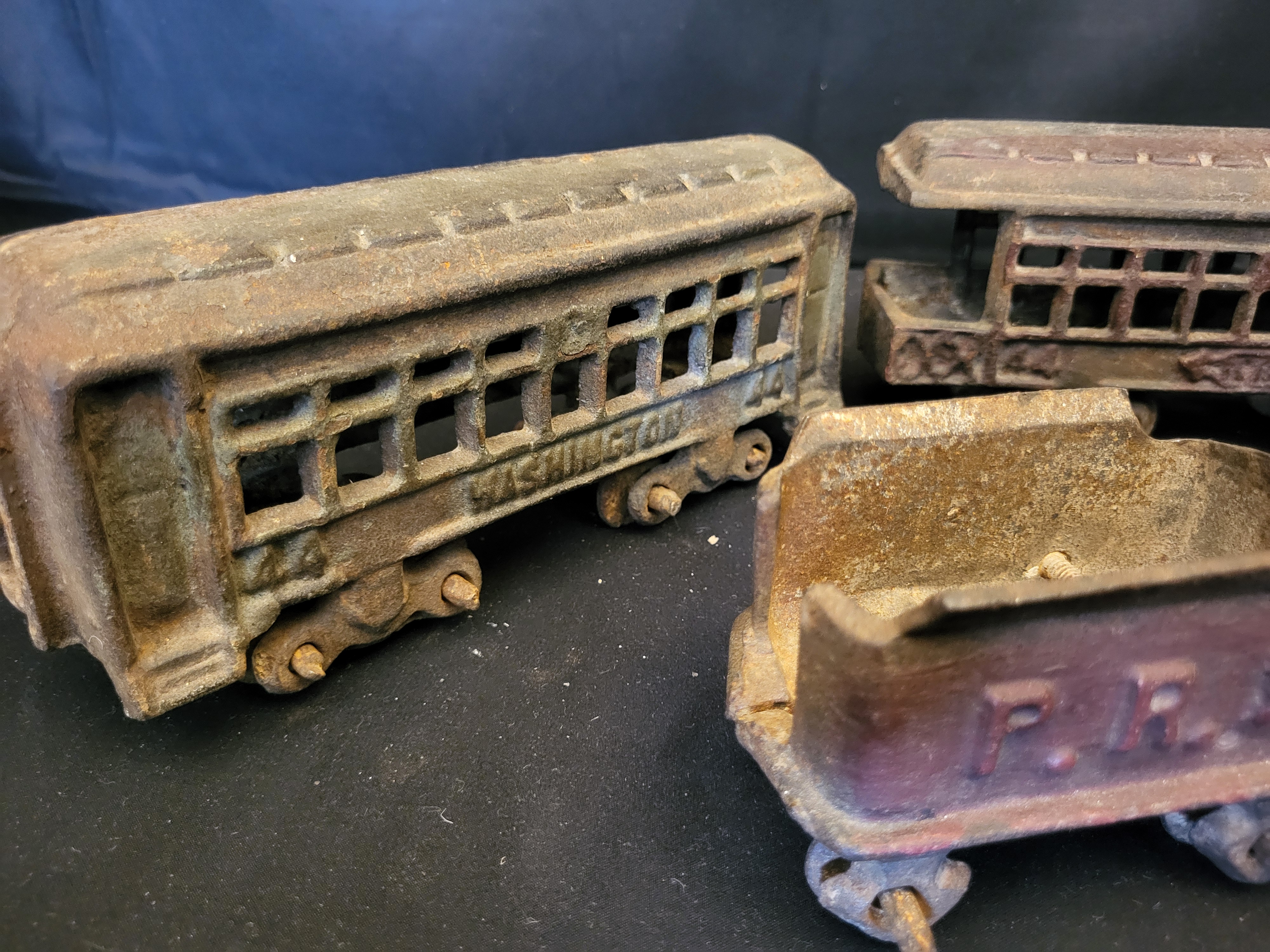 BID PER WHAT YOU SEE IN THE PHOTO, NOT THE AI GENERATED TITLES AND DESCRIPTIONS! A collection of antique cast iron floor train components, including a steam locomotive engine, a coal tender, and passenger coaches. The coal tender features the embossed initials P.R.R. for the Pennsylvania Railroad, while one passenger coach is embossed with the name WASHINGTON. The pieces are manufactured from heavy modular cast iron and retain remnants of red, yellow, and gray paint. These items are characteristic of early 20th-century American toy production.