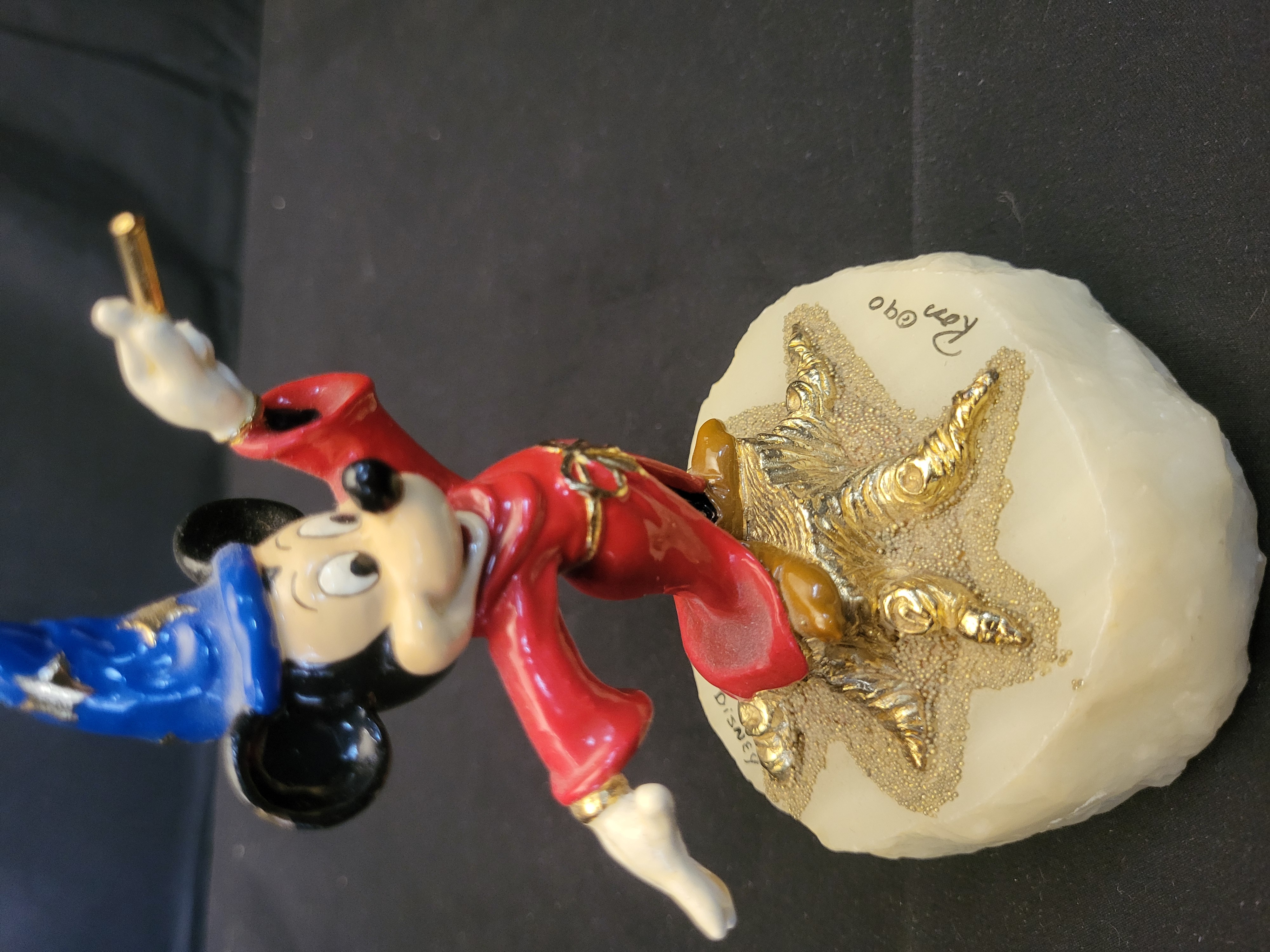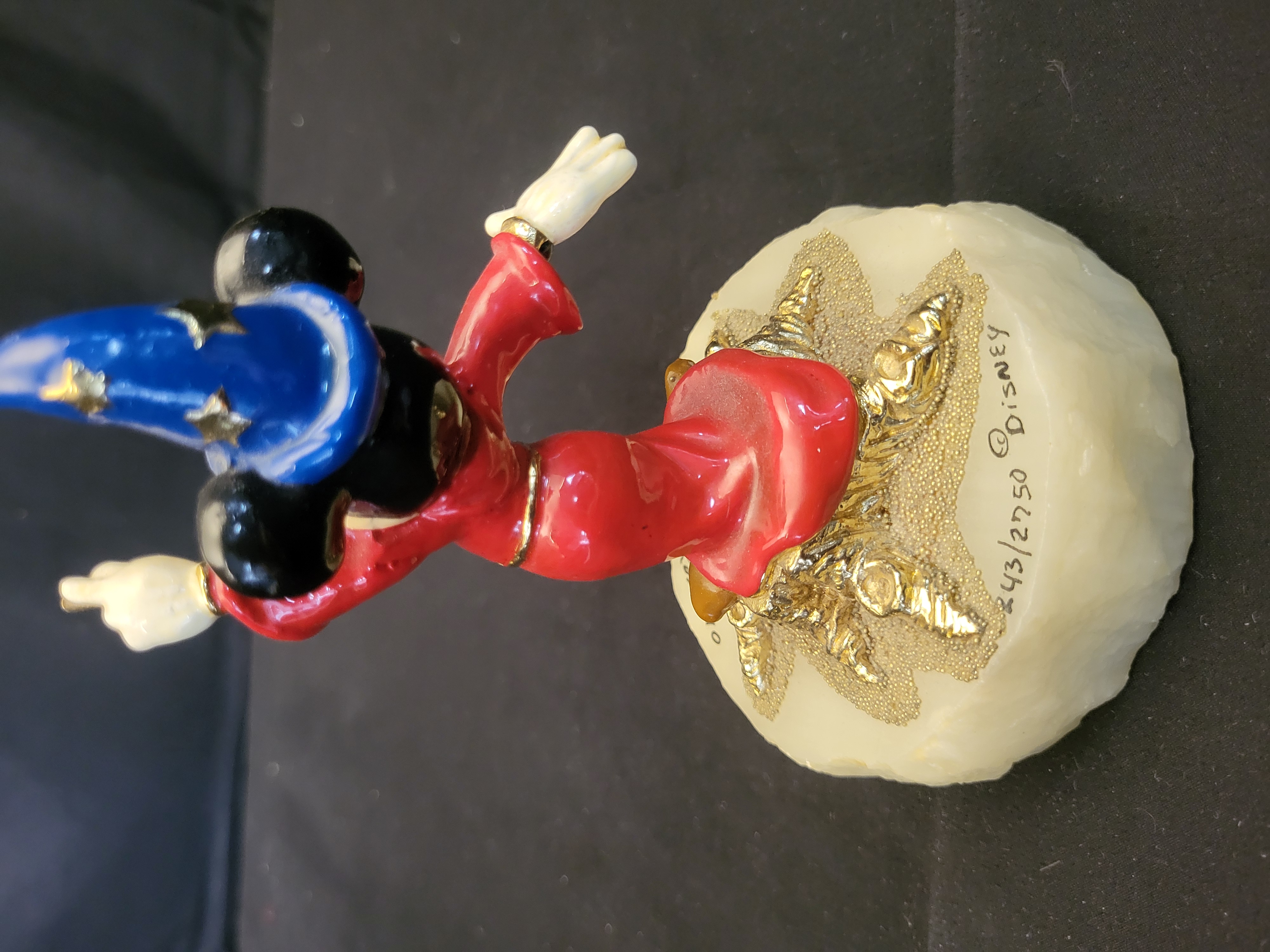 BID PER WHAT YOU SEE IN THE PHOTO, NOT THE AI GENERATED TITLES AND DESCRIPTIONS! A limited edition hand-painted figurine depicting Mickey Mouse as the Sorcerer’s Apprentice from the Disney film Fantasia. The figure is rendered in a red robe and blue star-patterned hat, holding a gold-toned wand. The character is mounted upon a faceted, cream-colored base that features a gold-toned starburst design with textured beadwork. The base is signed Ron © 90 and marked © DISNEY. The piece is hand-numbered 243/2750 on the base.