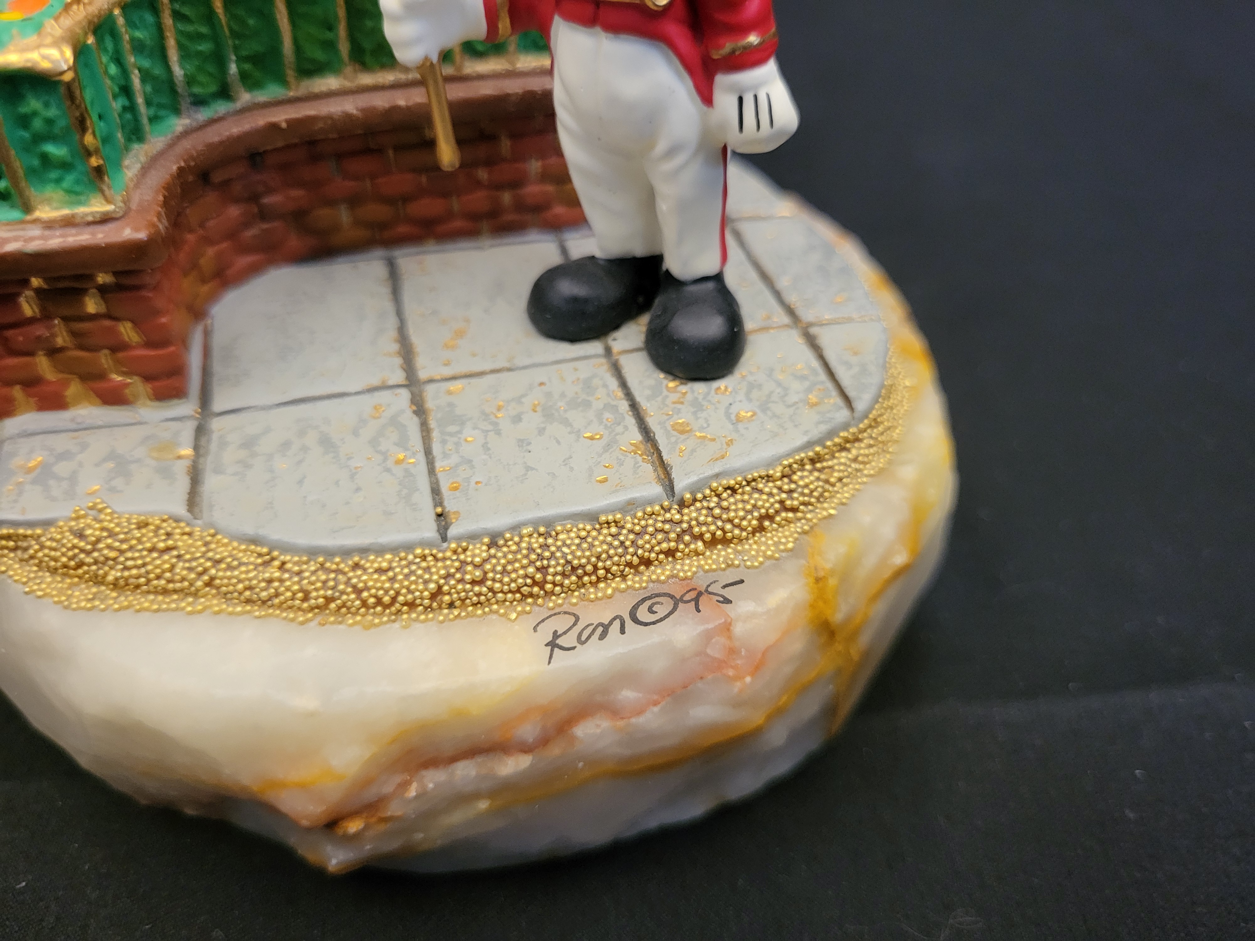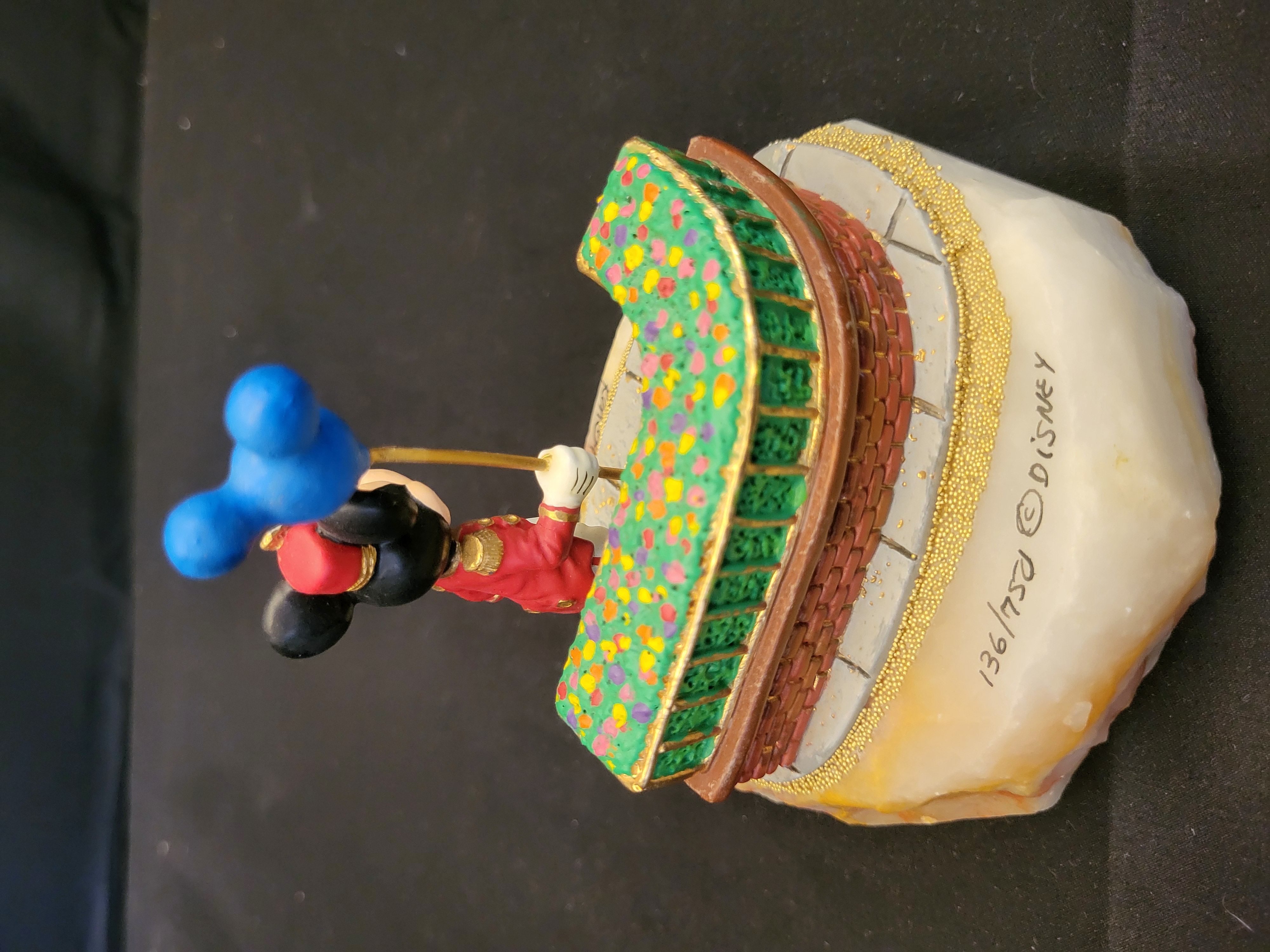 BID PER WHAT YOU SEE IN THE PHOTO, NOT THE AI GENERATED TITLES AND DESCRIPTIONS! A Walt Disney Classics Collection (WDCC) limited edition figurine titled From the Top, inspired by the animated short The Band Concert. The piece depicts Mickey Mouse in a red and white bandleader uniform with gold-tone epaulets, holding a blue Mickey-shaped balloon on a gold-tone rod. The character is positioned on a simulated gray tile walkway beside a curved brick wall topped with a green railing and multicolored floral accents. The entire scene is mounted on a thick, polished onyx base featuring natural white and orange veining. A border of small gold-tone beads surrounds the perimeter of the walkway. The side of the stone base is hand-inscribed with the signature Ron and the year 95, alongside the edition number 136/750 and the Disney copyright mark.