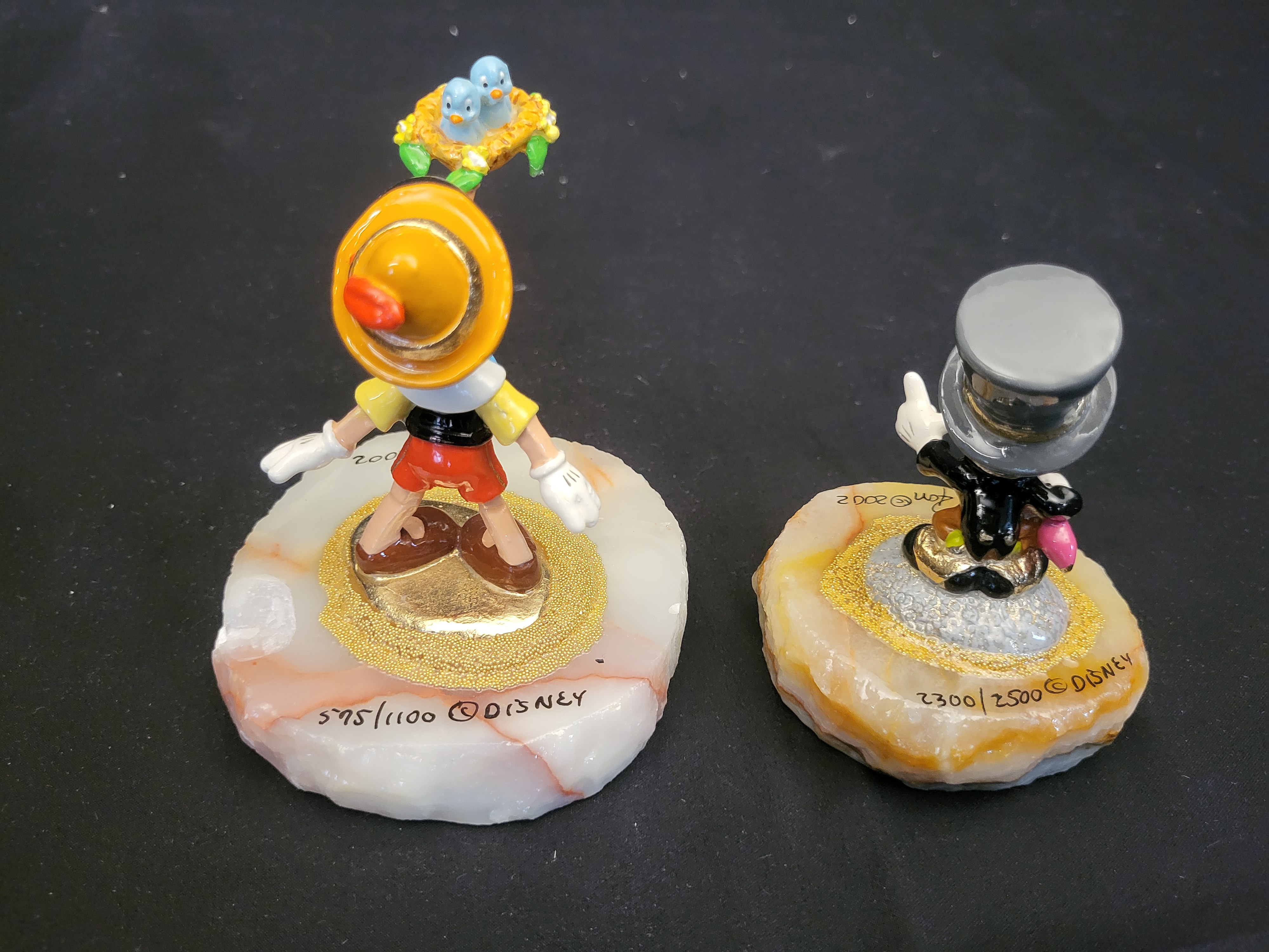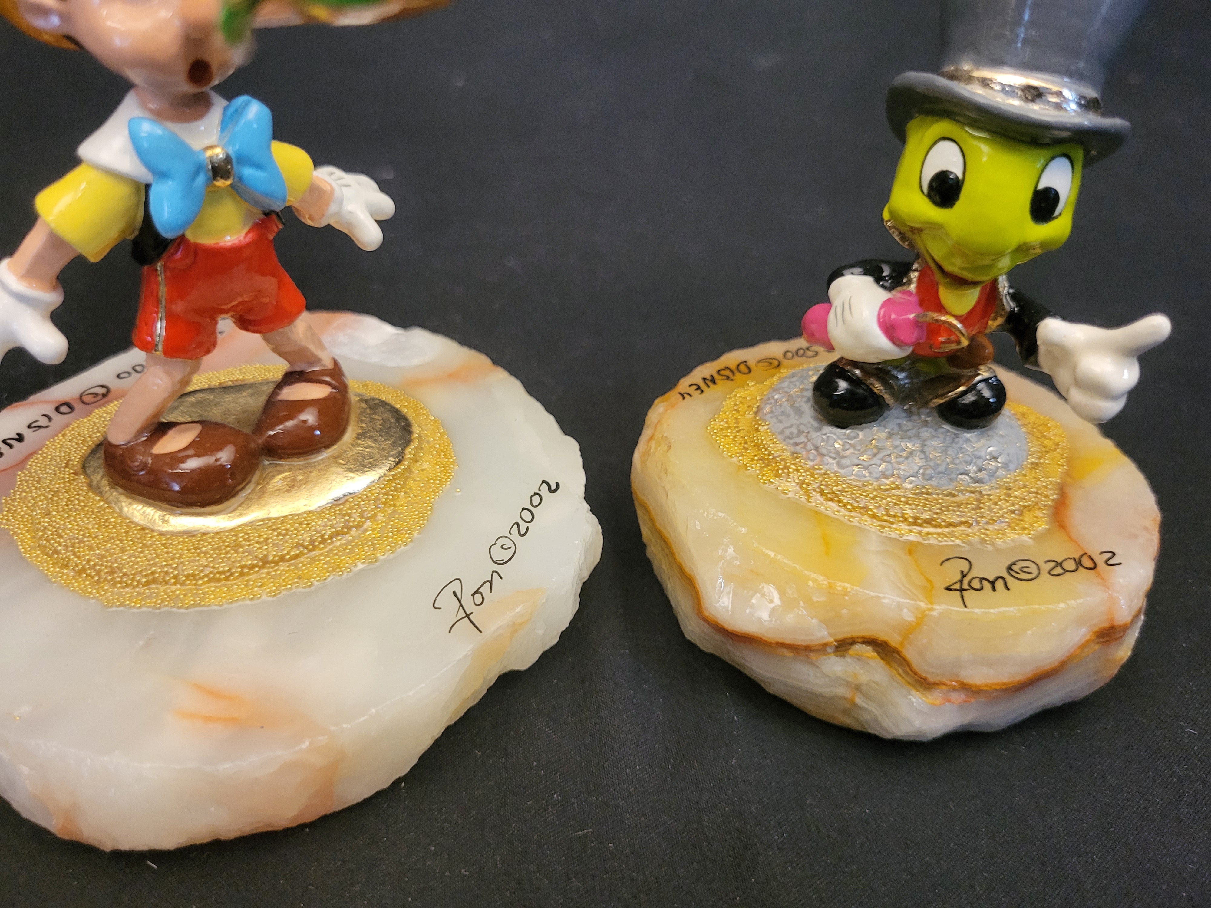 BID PER WHAT YOU SEE IN THE PHOTO, NOT THE AI GENERATED TITLES AND DESCRIPTIONS! A group of two limited edition hand-painted figurines designed by artist Ron Lee for Disney, dated 2002. The first figurine depicts the character Pinocchio with an elongated wooden nose supporting a bird nest with two blue birds. The second figurine depicts Jiminy Cricket in his signature tuxedo and top hat while holding a pink umbrella. Both figures are mounted on polished natural stone bases, likely onyx, featuring gold-toned platforms and textured micro-beading. The Pinocchio figurine is marked Ron 2002 and Disney, and is hand-numbered 575/1100. The Jiminy Cricket figurine is marked Ron 2002 and Disney, and is hand-numbered 2300/2500.