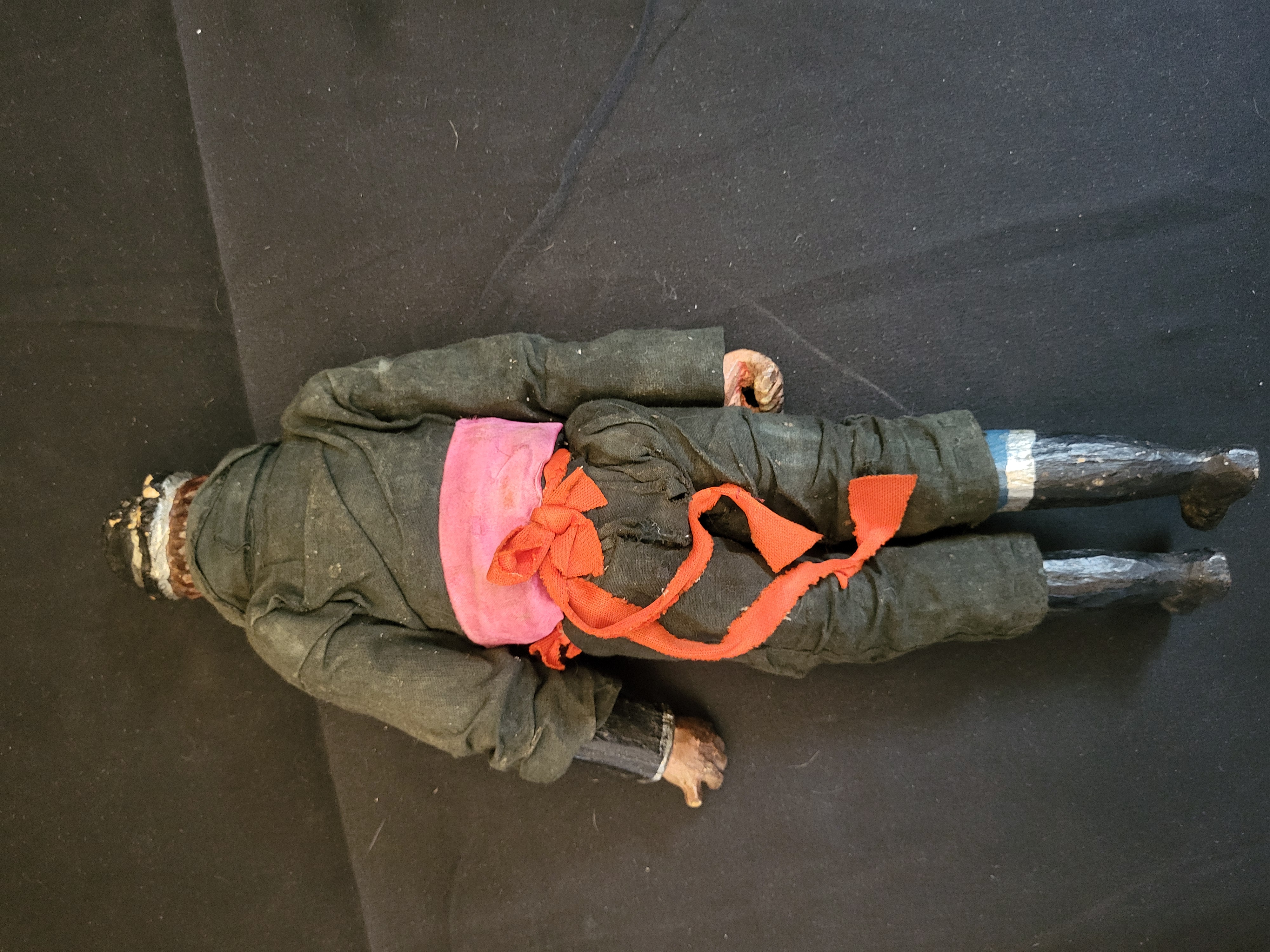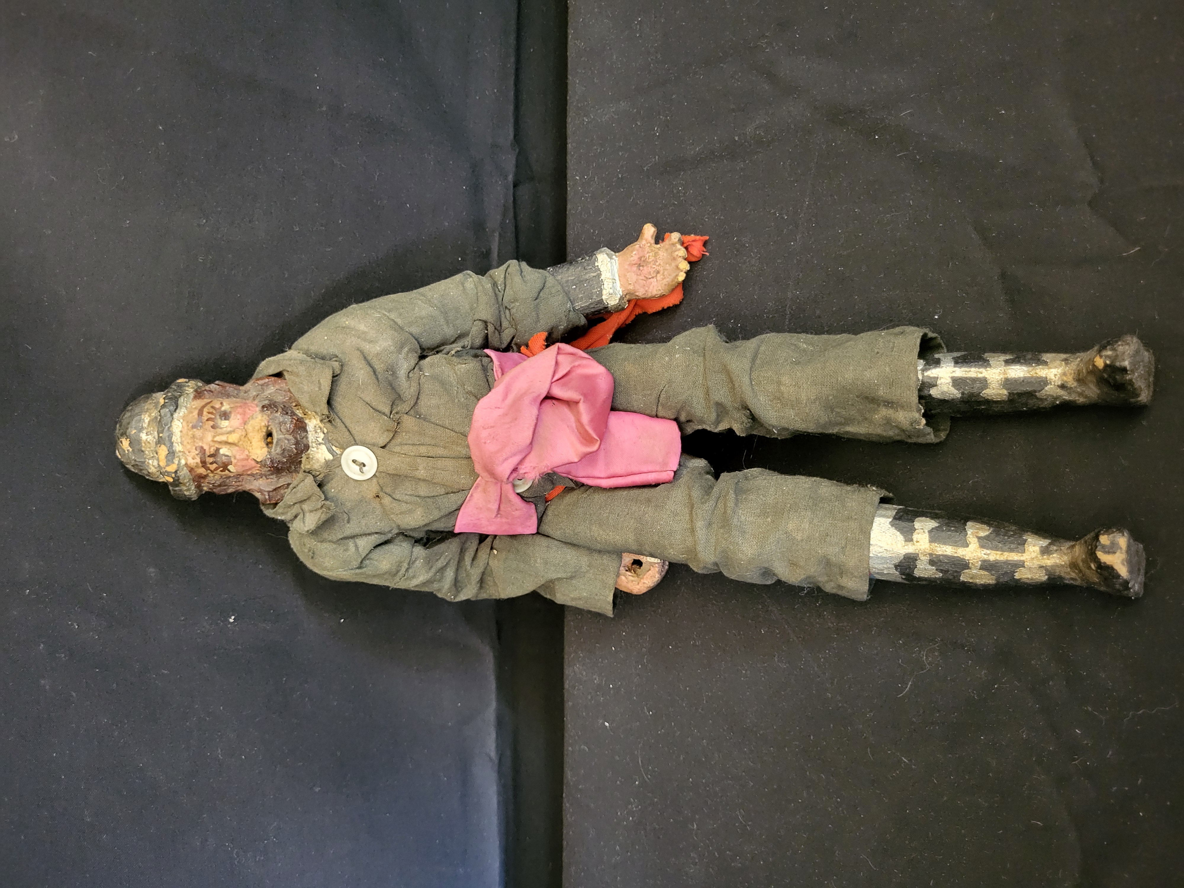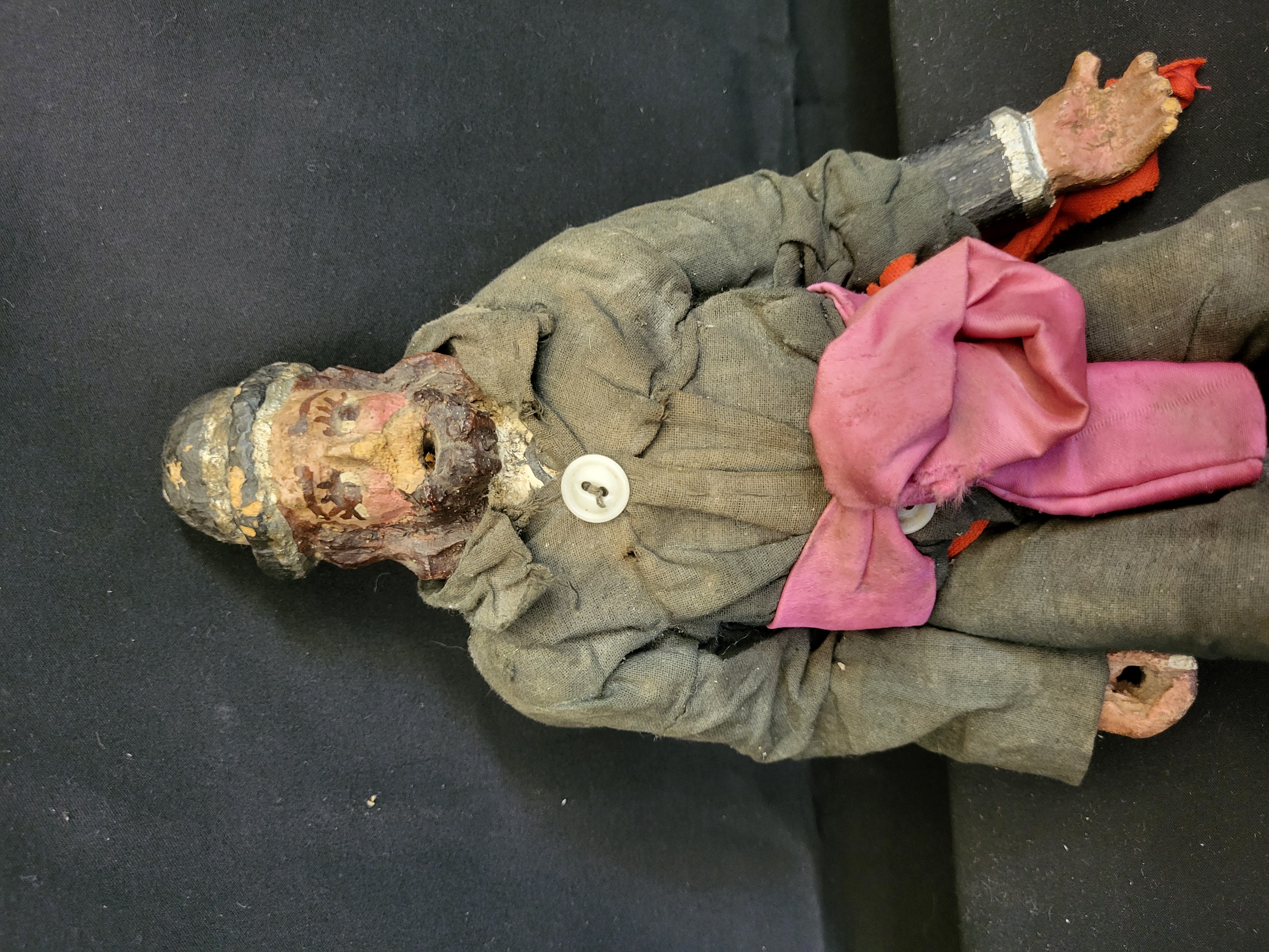 BID PER WHAT YOU SEE IN THE PHOTO, NOT THE AI GENERATED TITLES AND DESCRIPTIONS! A vintage folk art carved male figure featuring a hand-carved and painted head with a beard and integral hat. The figure is constructed with composition or wooden hands and lower legs, with the legs featuring a painted silver and black geometric pattern. The figure is dressed in a dark gray fabric tunic and matching pants, accented with a large pink fabric sash and a red ribbon trim. The tunic is fastened with a single white button at the neck. No manufacturer’s markings, labels, or signatures are visible.