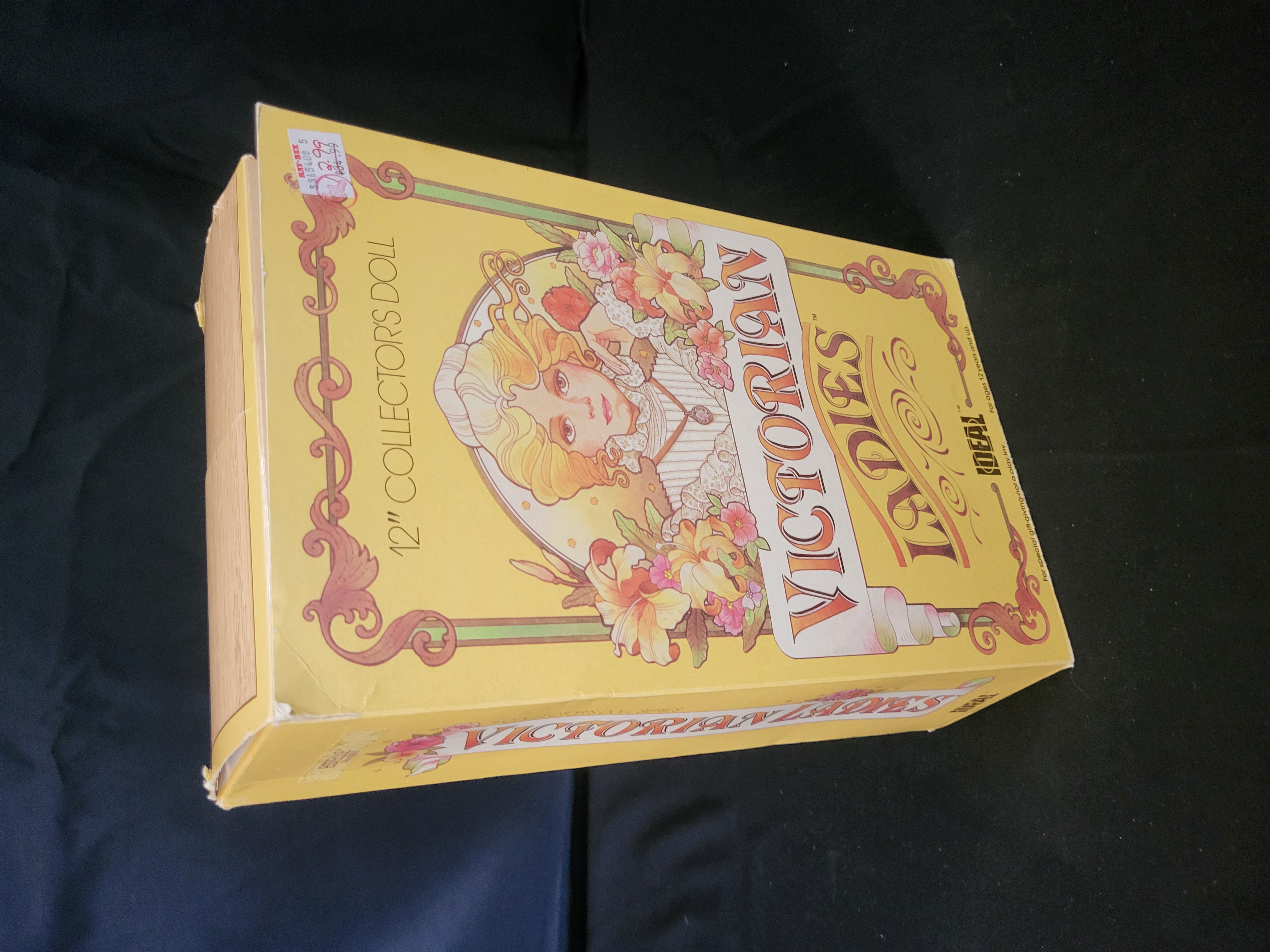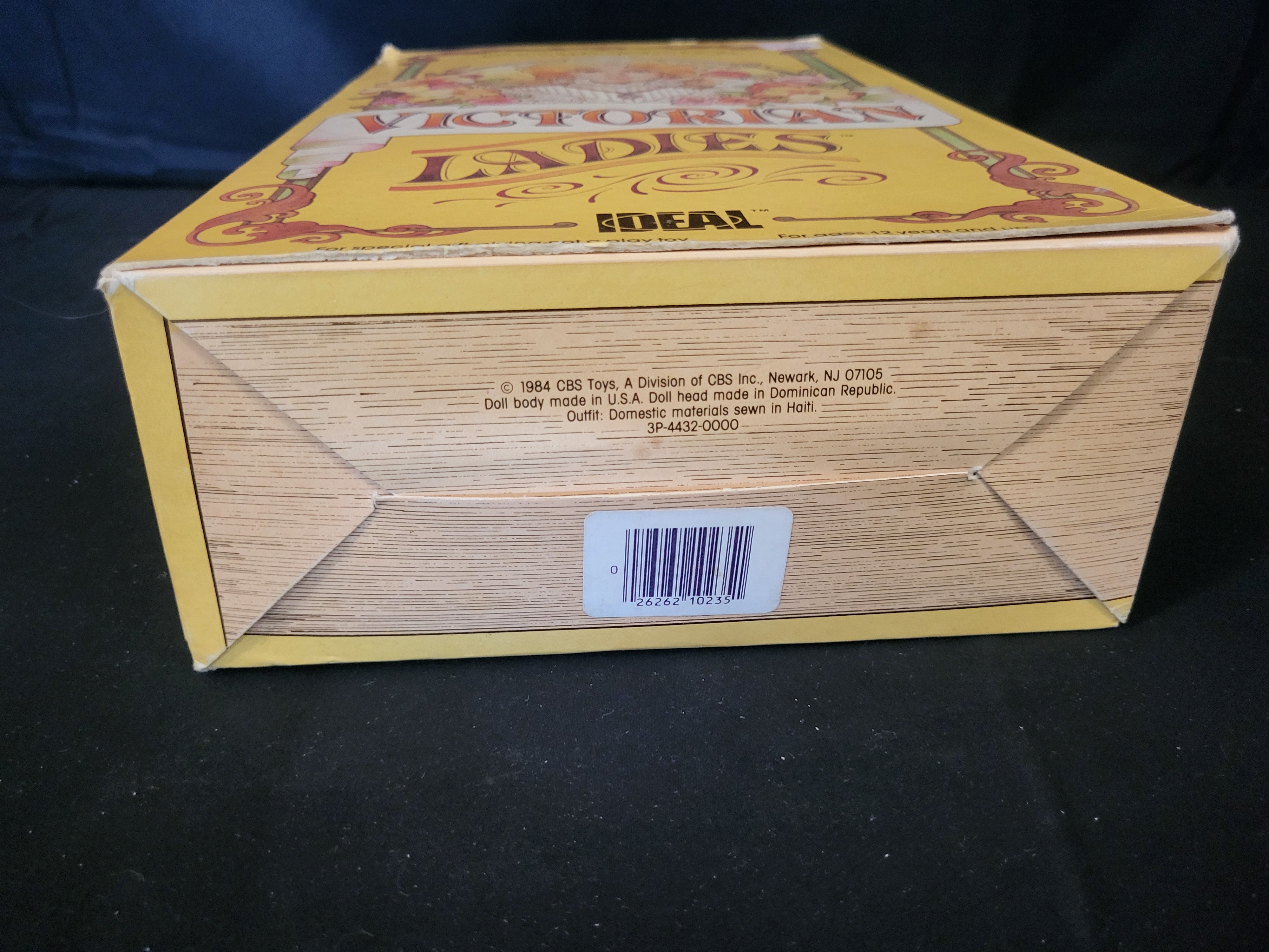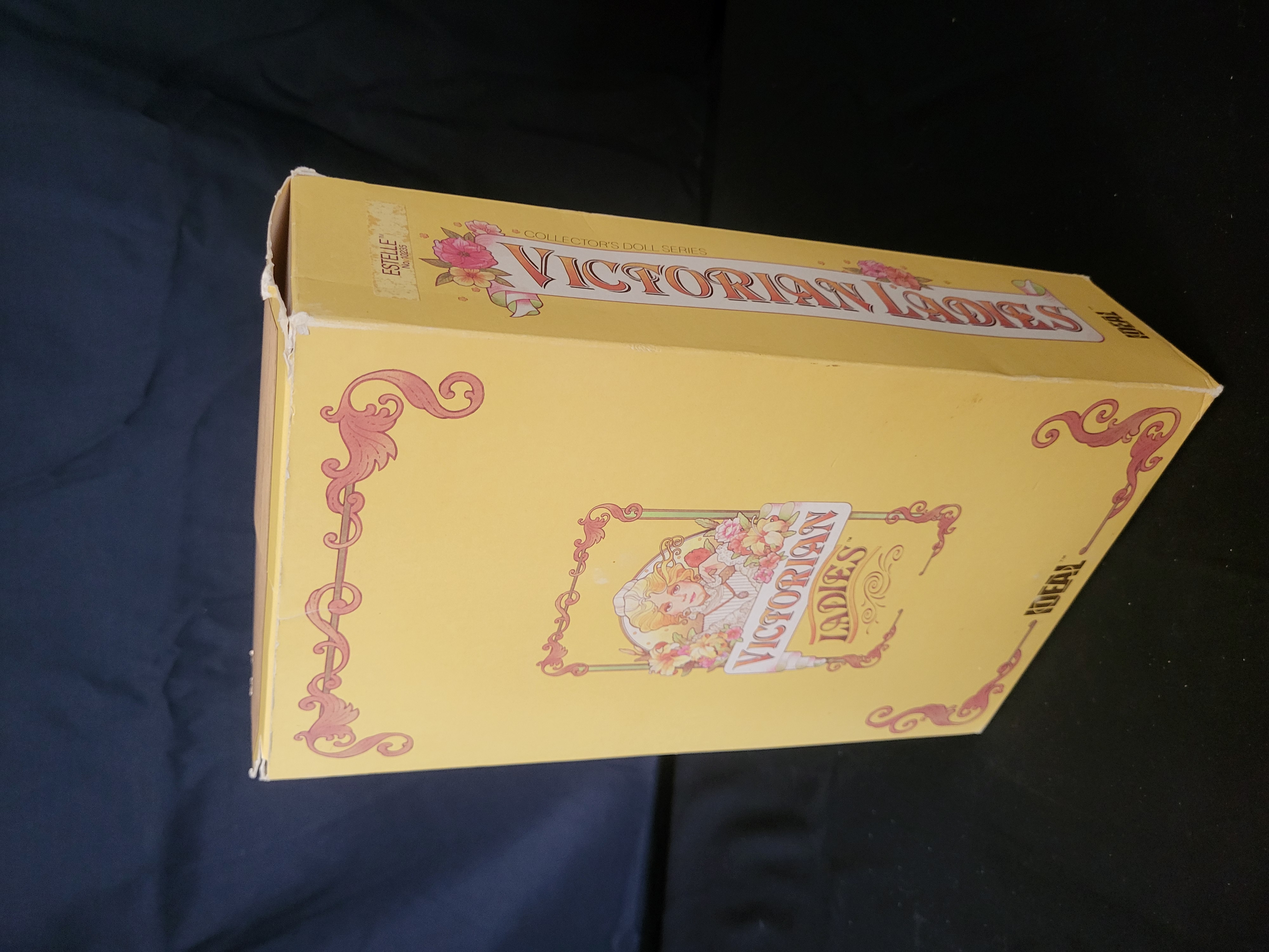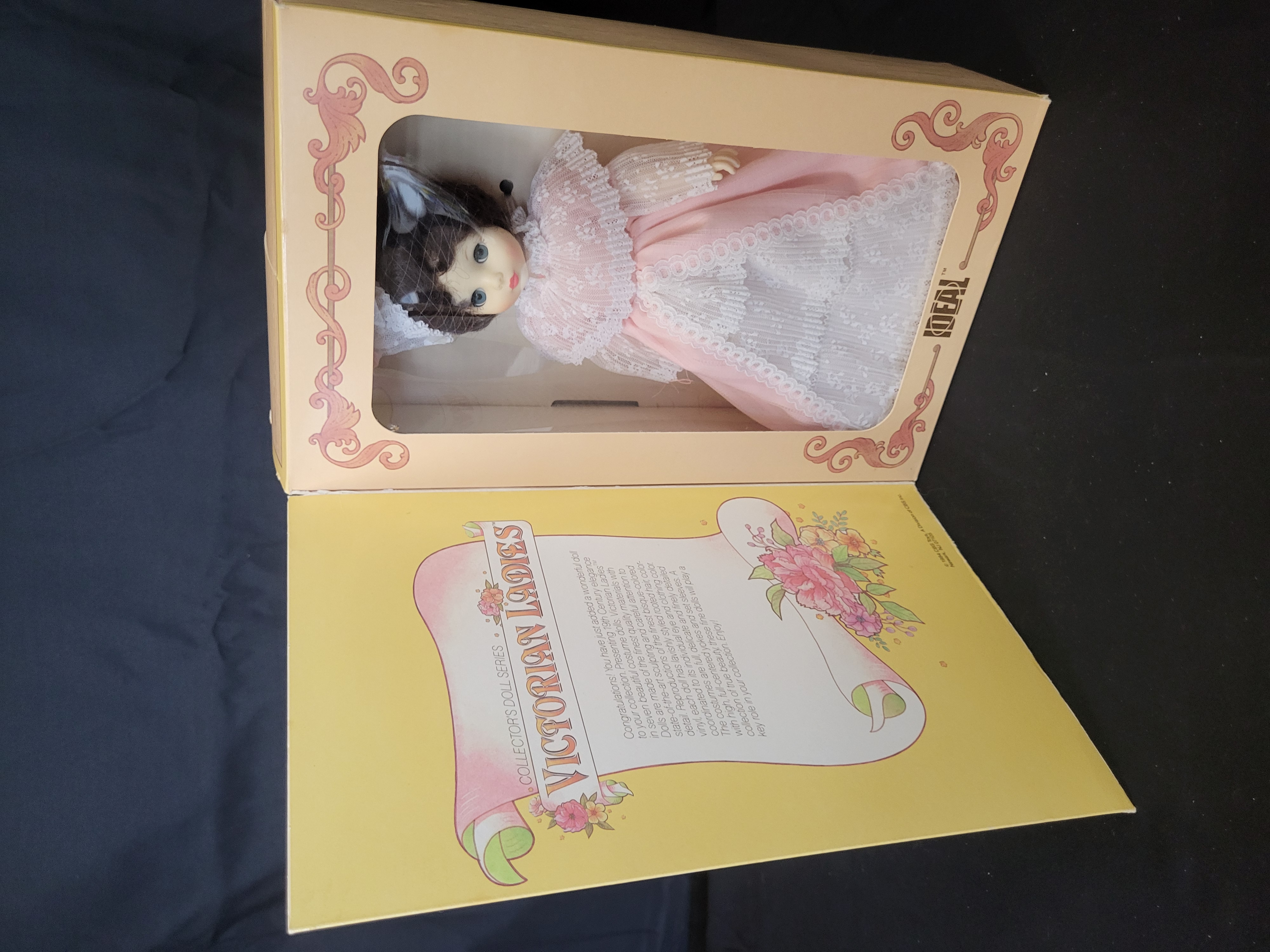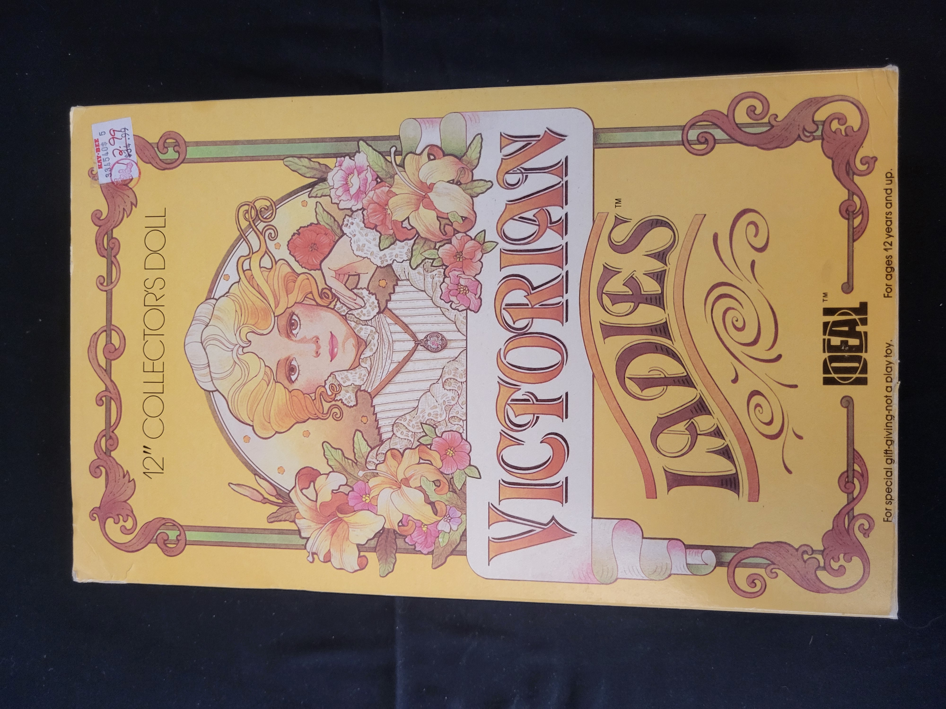 BID PER WHAT YOU SEE IN THE PHOTO, NOT THE AI GENERATED TITLES AND DESCRIPTIONS! An Ideal Victorian Ladies collector doll titled Estelle, model number 10235, dating to 1984. The doll is constructed with a vinyl head and body, featuring dark hair and blue eyes. She is dressed in a period-style light pink and white lace gown with a coordinating bonnet. The item is housed in its original yellow cardboard window box, which features Art Nouveau-style floral graphics and descriptive text on the interior flap. Manufacturing information on the base identifies the producer as CBS Toys, a division of CBS Inc., with components manufactured in the USA and Dominican Republic, and the outfit sewn in Haiti. An original Kay-Bee price tag is affixed to the upper corner of the box.