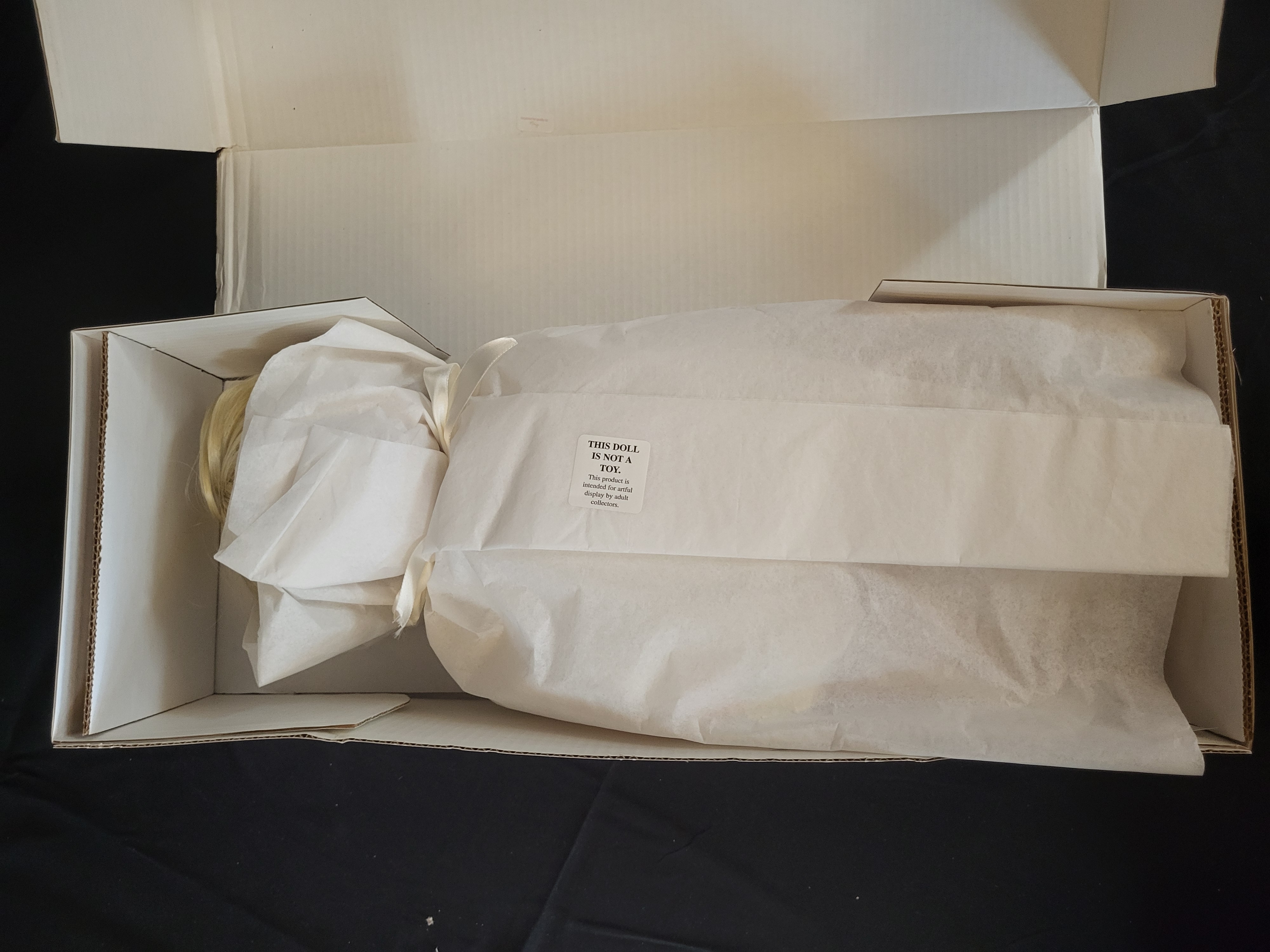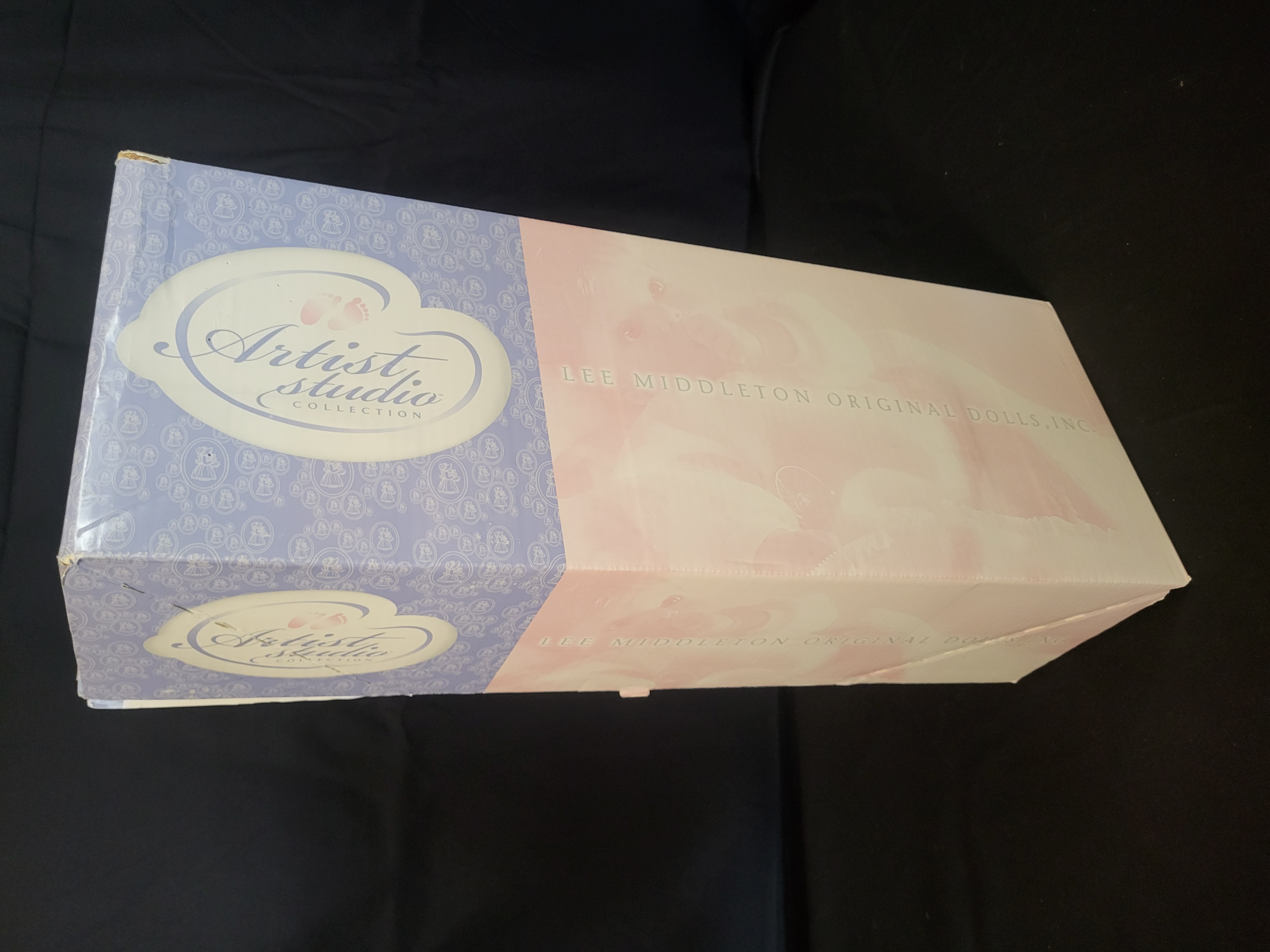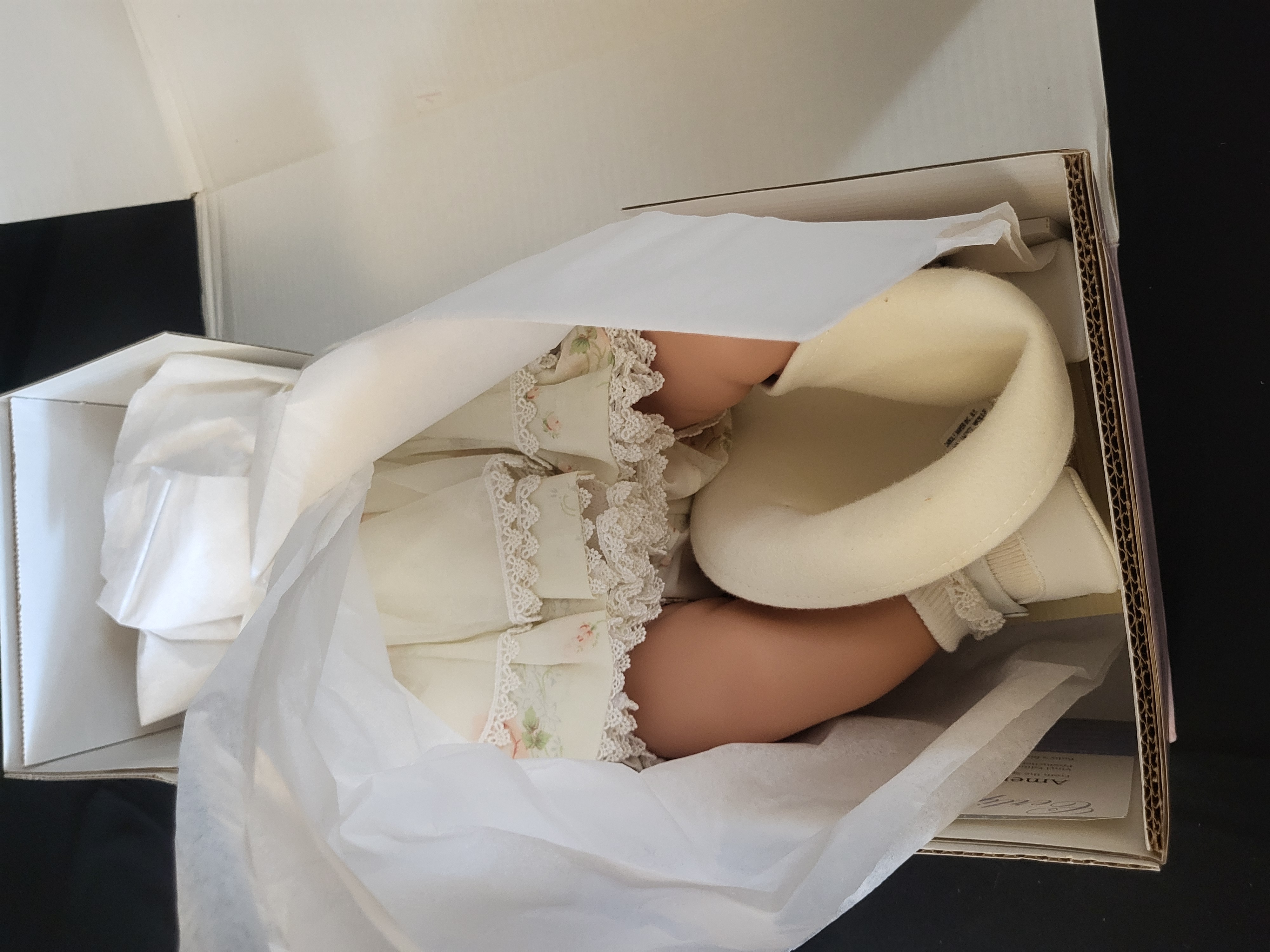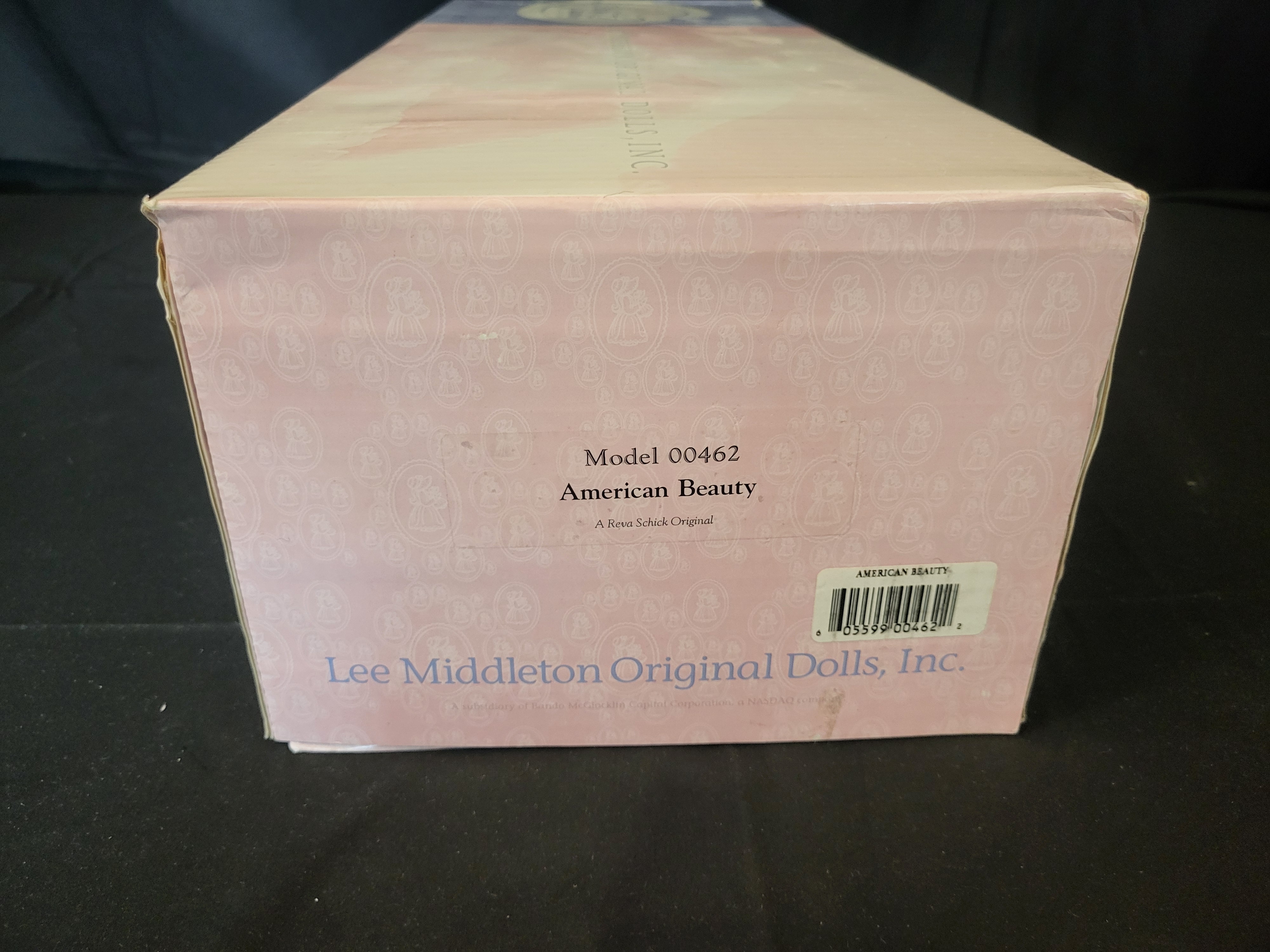 BID PER WHAT YOU SEE IN THE PHOTO, NOT THE AI GENERATED TITLES AND DESCRIPTIONS! A Lee Middleton American Beauty collector doll, model number 00462, from the Artist Studio Collection. This original design by Reva Schick features a vinyl face and limbs, blonde hair, and blue eyes with applied eyelashes. The doll is dressed in a lace-trimmed, tiered cream fabric dress with small pink floral patterns and includes a coordinating wide-brimmed felt hat. The item is housed in its original manufacturer’s box and includes tissue paper with a collector’s advisory label.