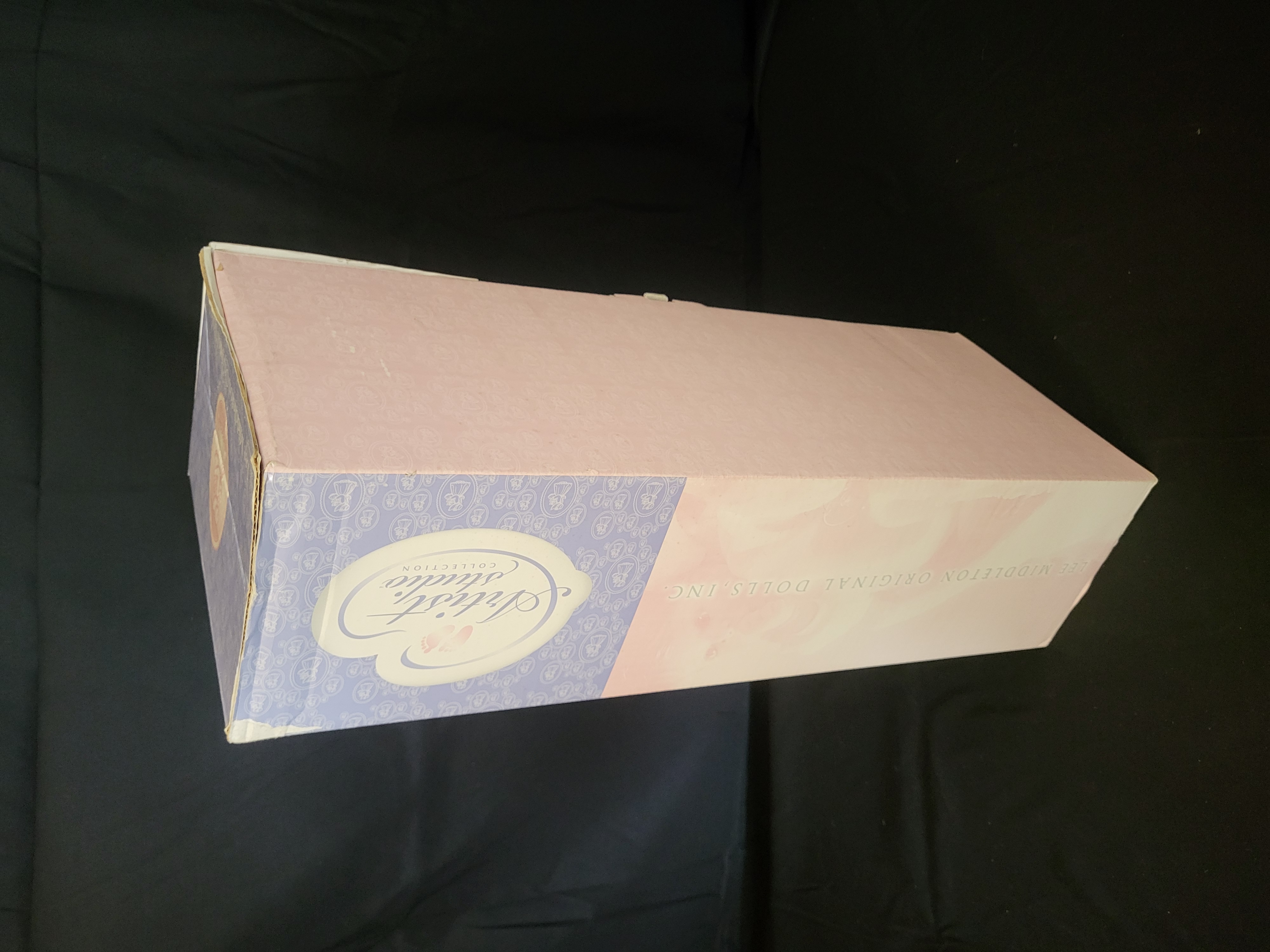 The doll appears in good condition. The exterior packaging displays minor shelf wear and slight tearing at the corner joints.