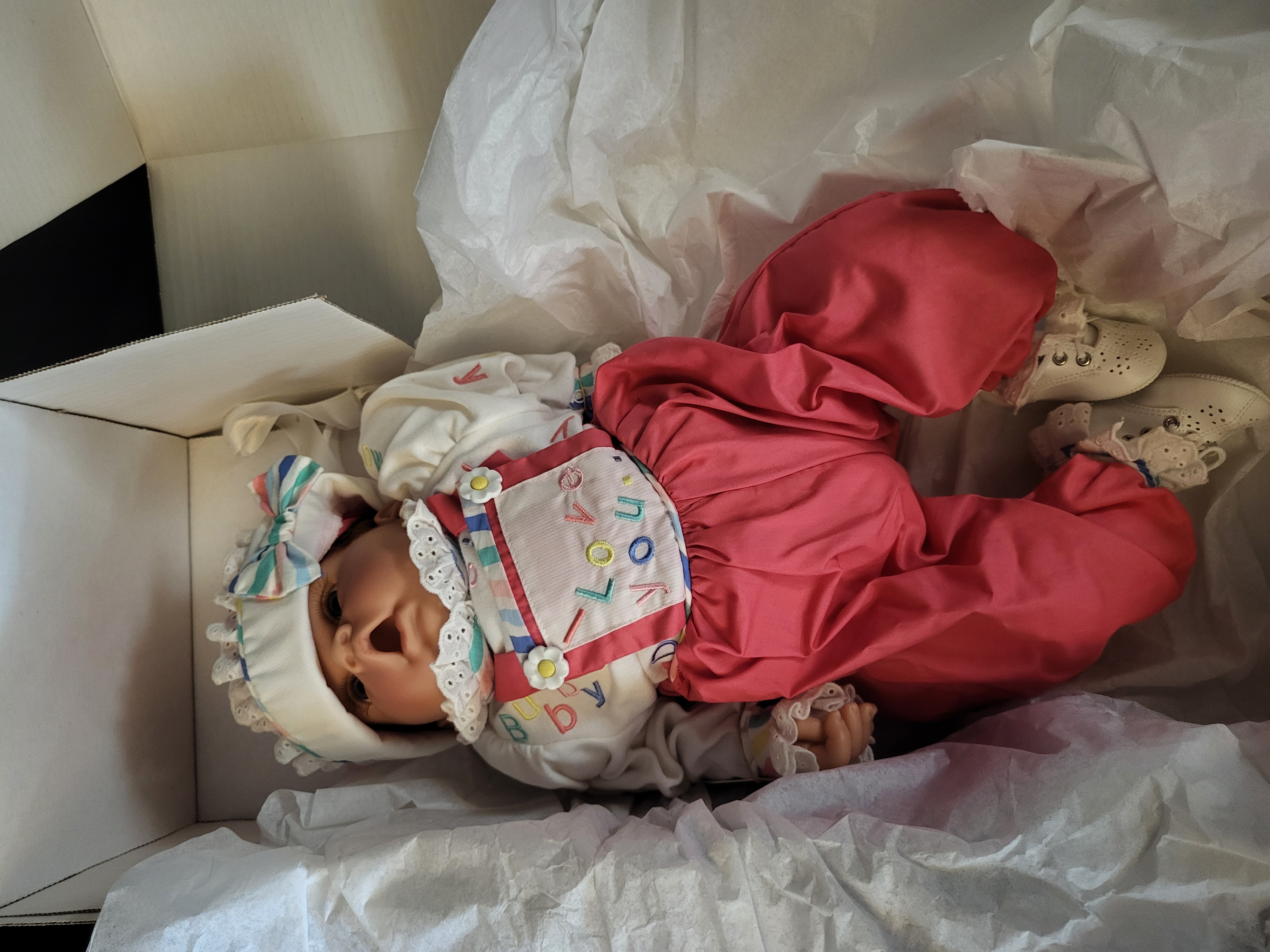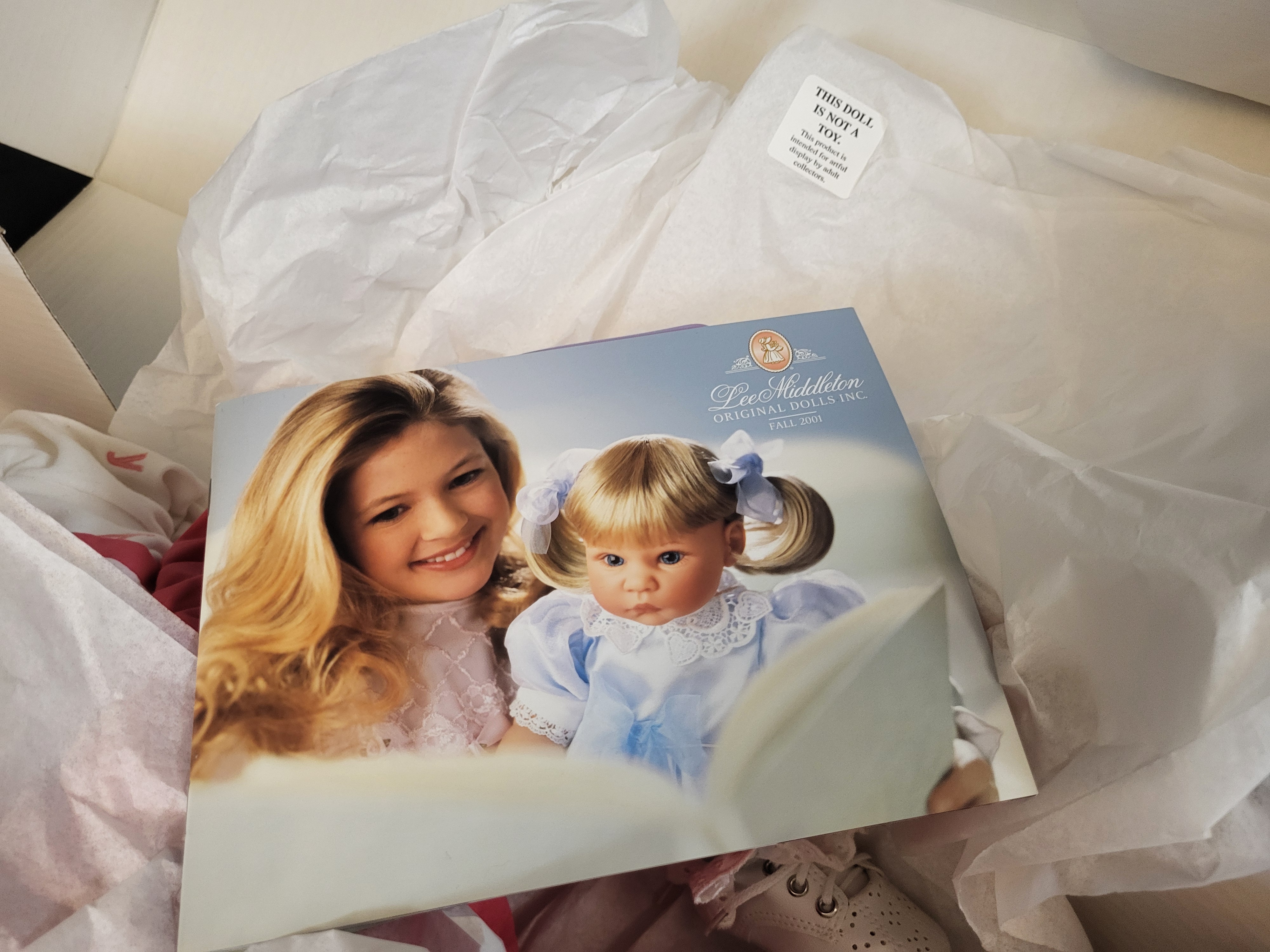 BID PER WHAT YOU SEE IN THE PHOTO, NOT THE AI GENERATED TITLES AND DESCRIPTIONS! This lot features a collectible vinyl baby doll from Lee Middleton Original Dolls, Inc., titled I Love You (Model 00479) from the Artist Studio Collection. Designed by artist Reva Schick, the infant doll is constructed with vinyl limbs and a soft fabric body. The doll is dressed in a pink and white embroidered I Love You bibbed outfit with a matching bonnet and white lacy shoes. The item is housed in its original retail box and includes a Certificate of Authenticity identifying it as edition number 1403 of 2500 with a recorded birthdate of November 1, 2001. Additional included materials consist of a miniature Baby’s Bible and a Fall 2001 promotional catalog.