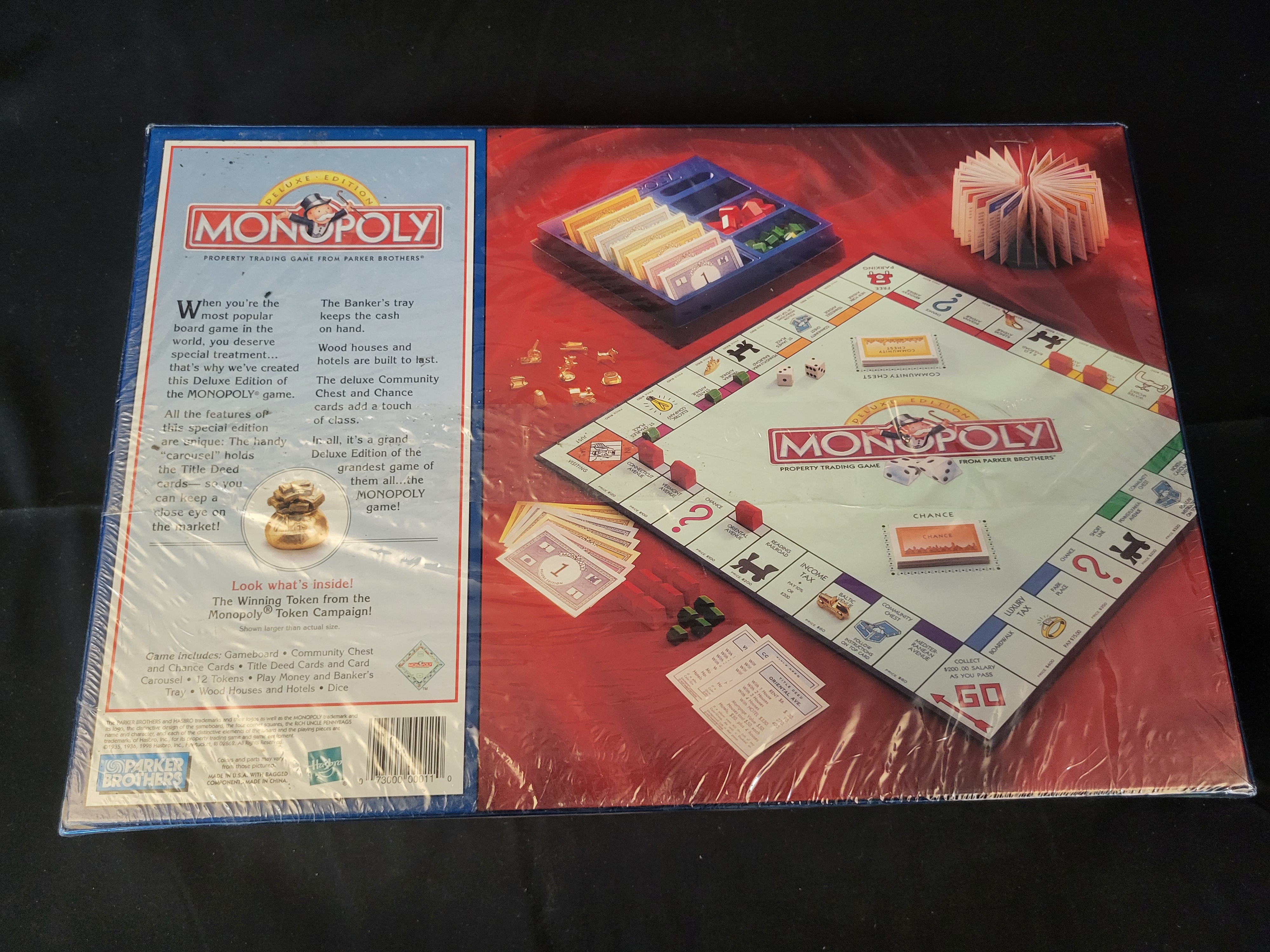 BID PER WHAT YOU SEE IN THE PHOTO, NOT THE AI GENERATED TITLES AND DESCRIPTIONS! This Monopoly Deluxe Edition property trading game was produced by Parker Brothers and Hasbro in 1998. The set features premium components as listed on the reverse of the packaging, including a gameboard, twelve tokens, wooden houses and hotels, a Title Deed Carousel, a Banker’s tray, play money, Chance and Community Chest cards, and dice. The box art depicts the character Rich Uncle Pennybags against a city skyline. The reverse side includes copyright dates of 1935, 1936, and 1998 by Hasbro, Inc. and indicates the set includes the winning token from the Monopoly Token Campaign.