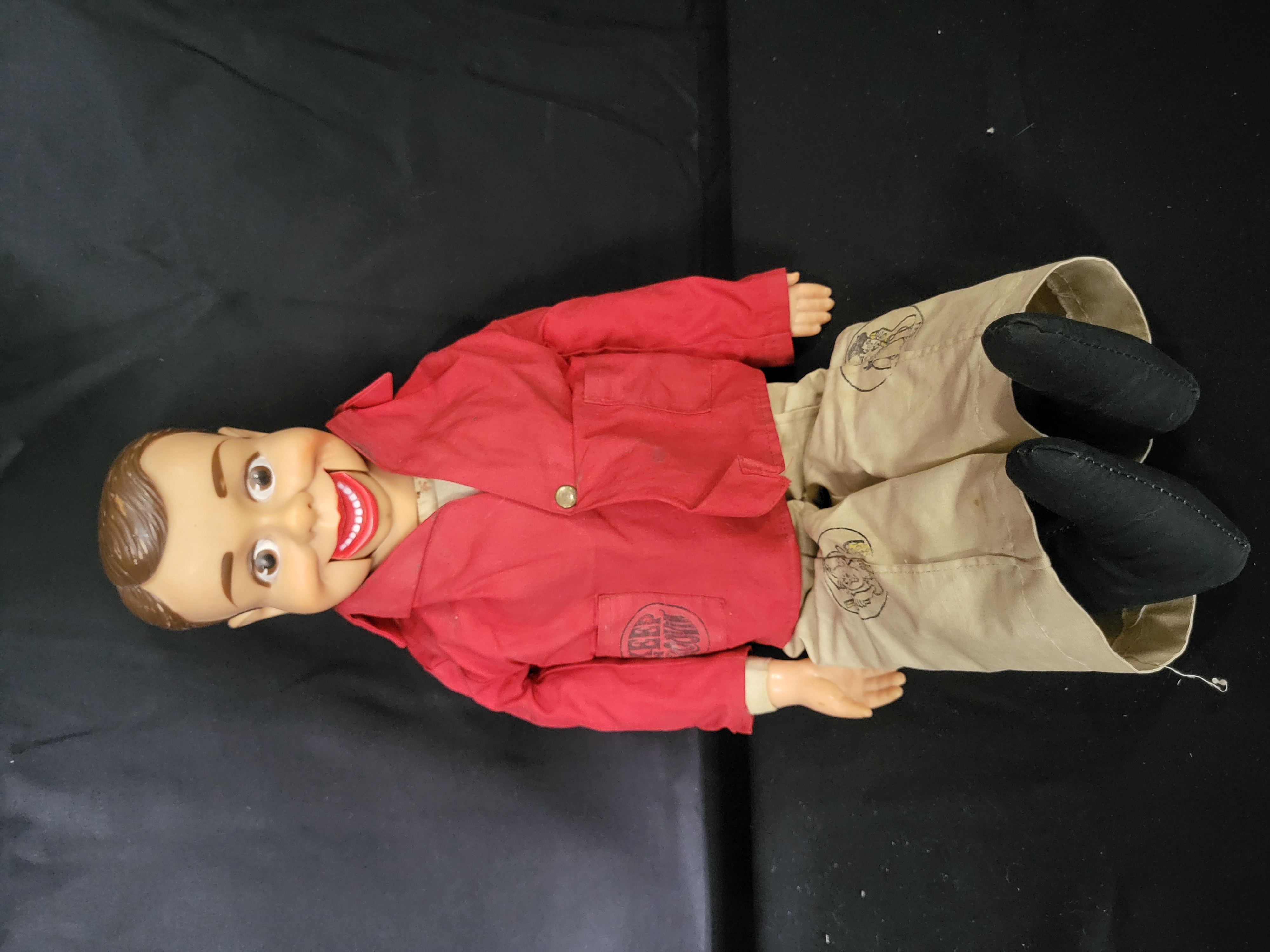 BID PER WHAT YOU SEE IN THE PHOTO, NOT THE AI GENERATED TITLES AND DESCRIPTIONS! This Ricky Little ventriloquist dummy was produced by Juro Novelty Co. in 1967. The item features a molded vinyl head with a hinged jaw and painted facial features, complemented by molded vinyl hands and a stuffed fabric body. The dummy is dressed in a red fabric jacket with a circular logo on the pocket, tan trousers with printed character illustrations, and black cloth footwear. Embossed markings on the back of the neck read copyright 1967 JURO NOVELTY CO. INC. A pull-string for operating the mouth is present at the base of the head.