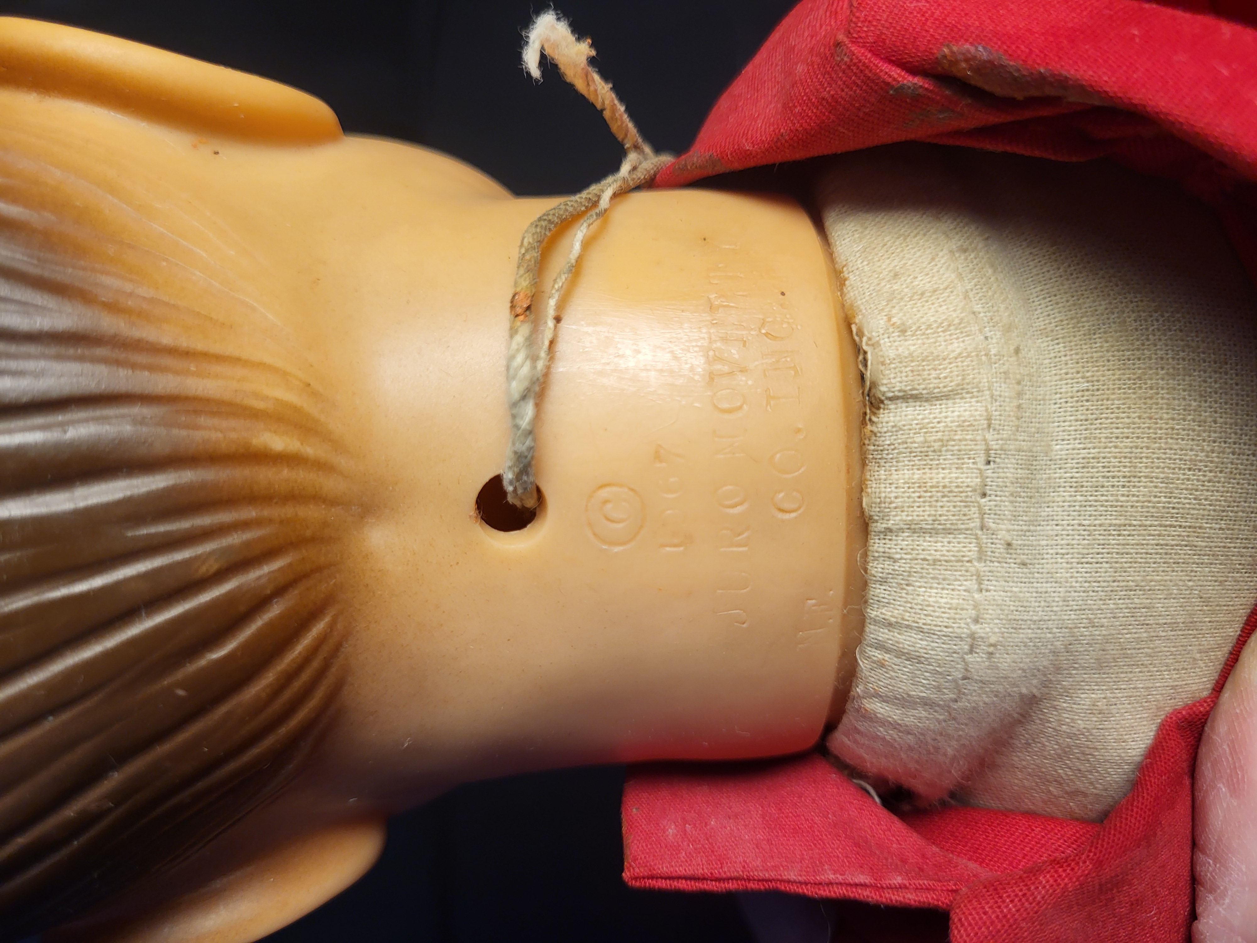 The item is in fair vintage condition, showing age-appropriate wear including minor paint loss on the head, surface staining and discoloration on the fabric clothing, and fraying to the pull-string.