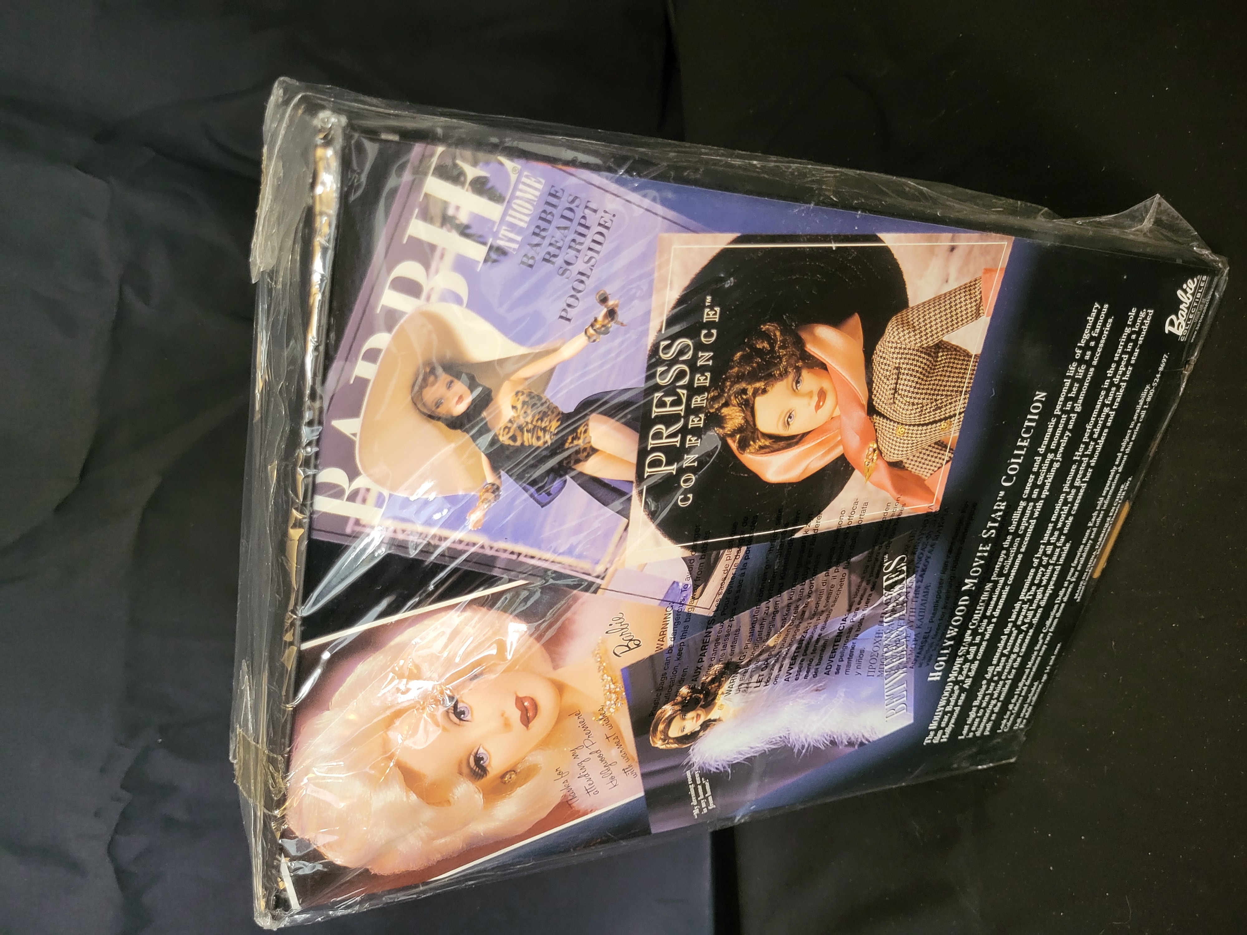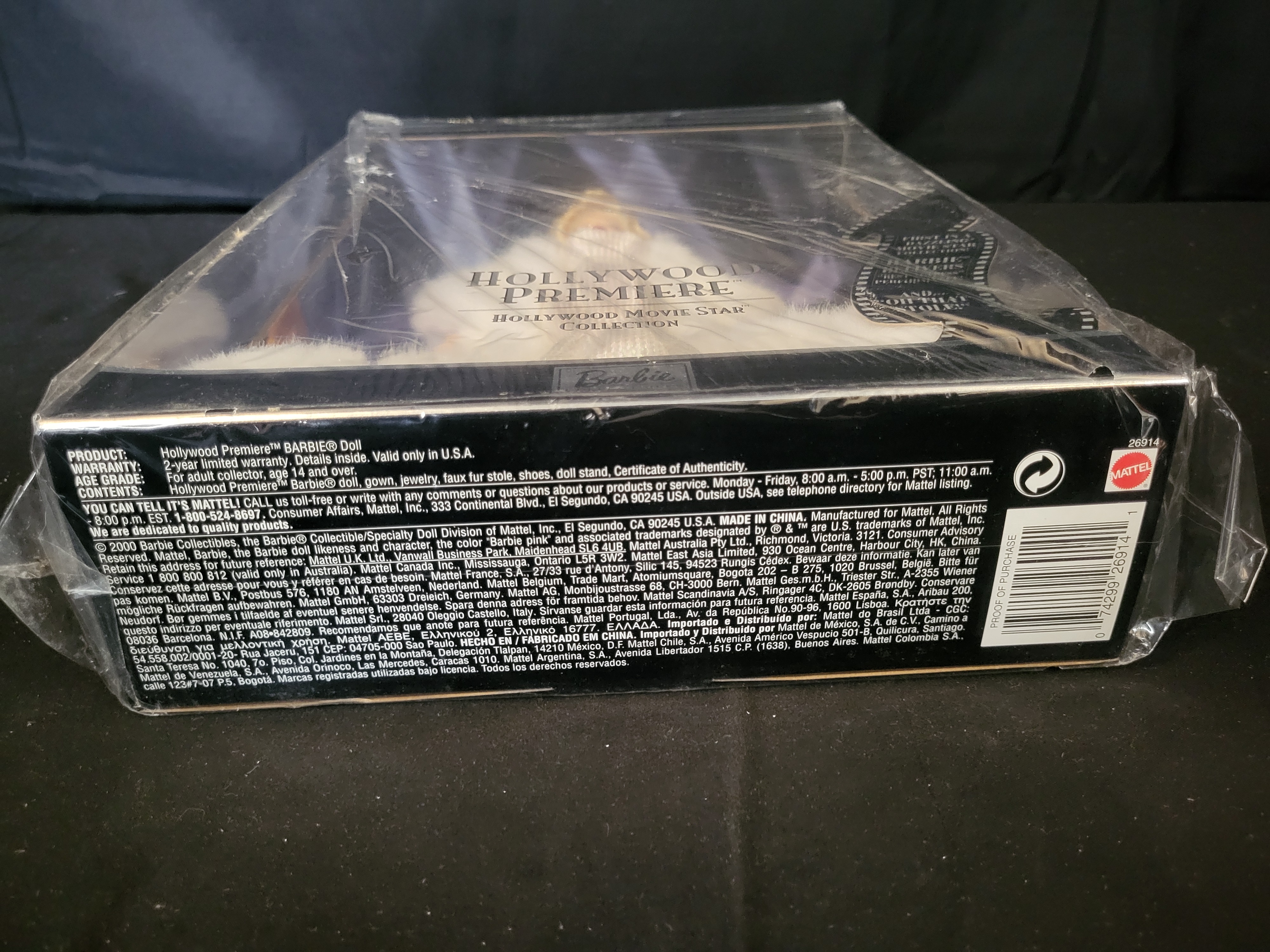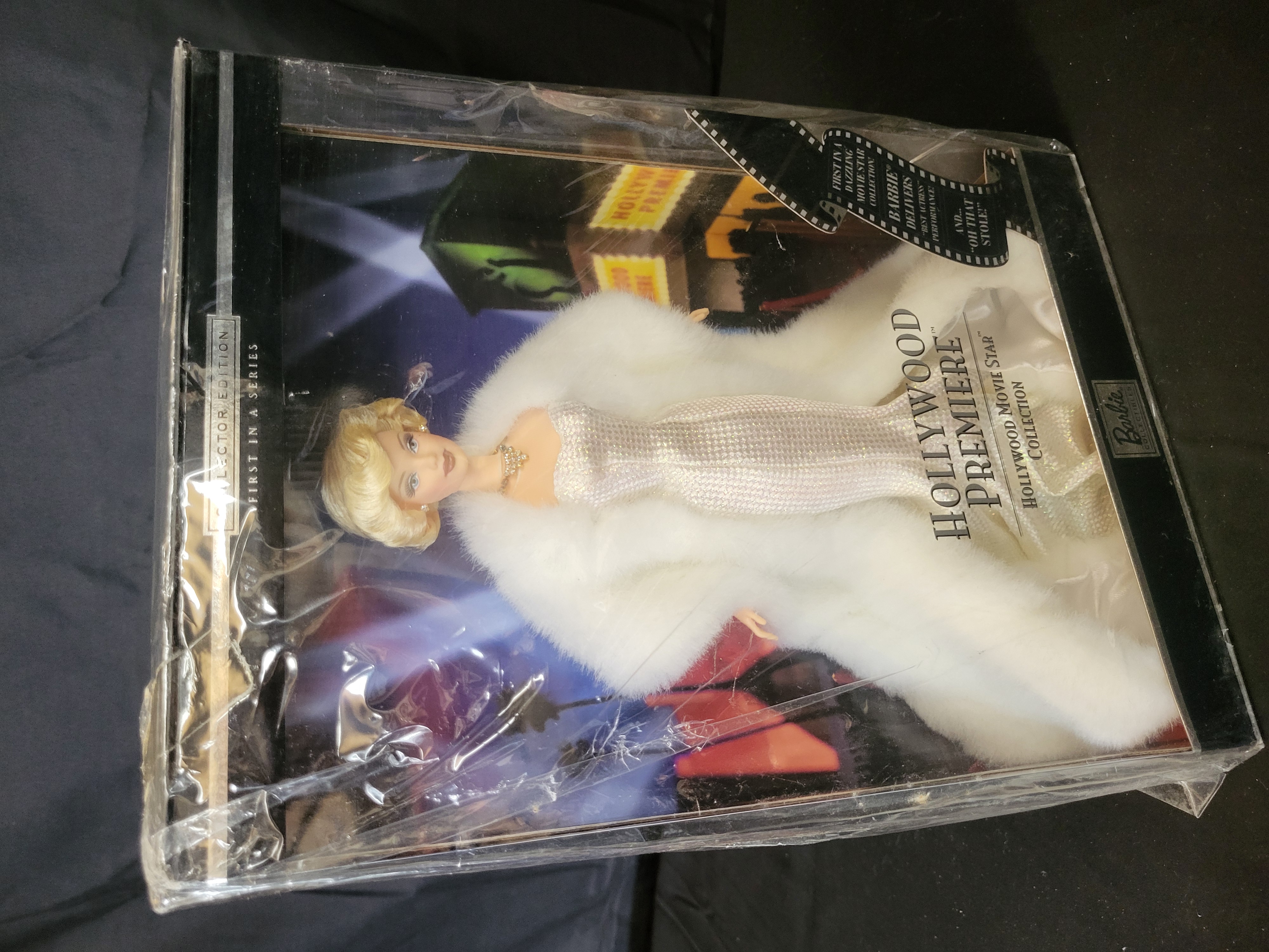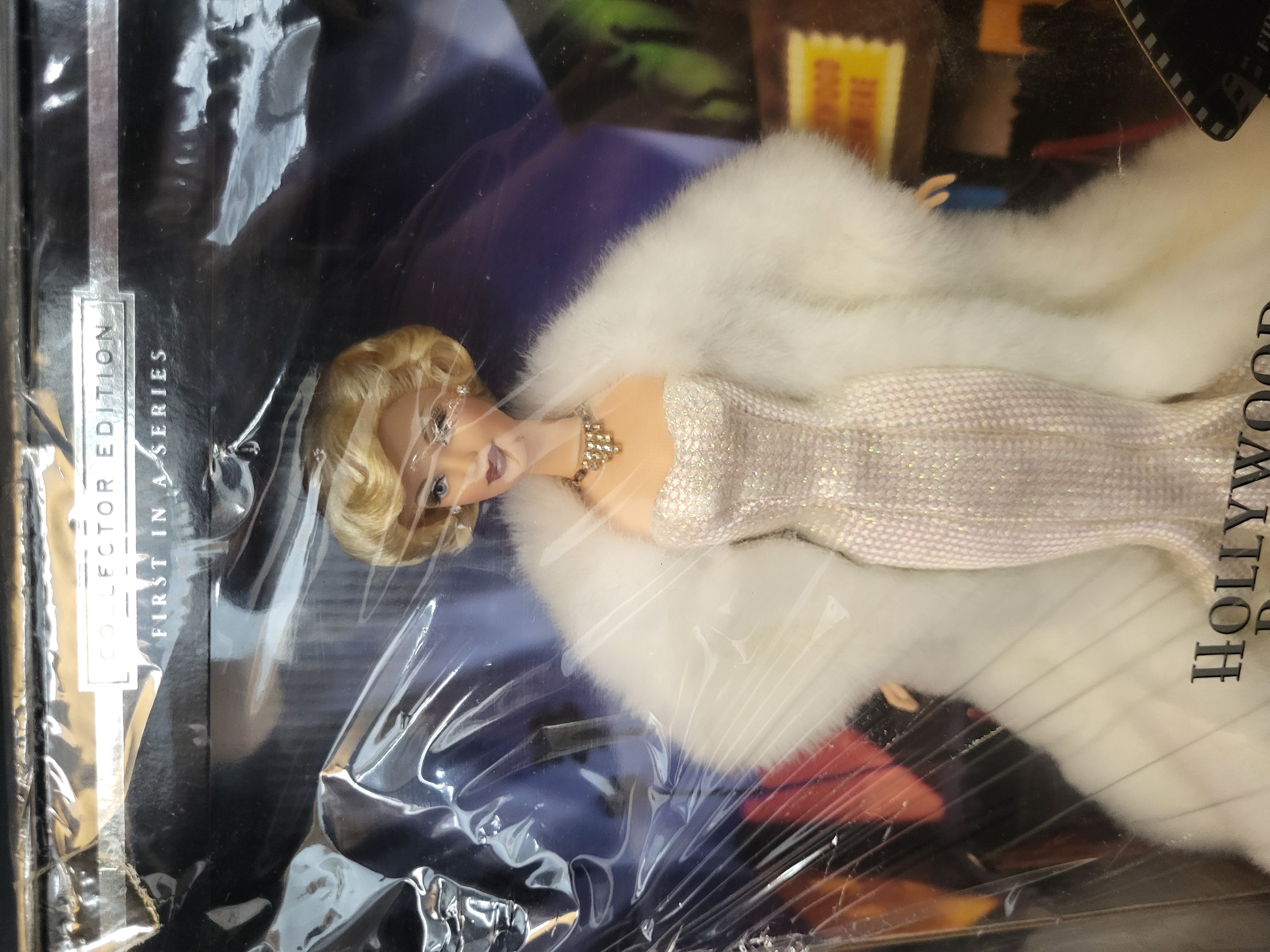BID PER WHAT YOU SEE IN THE PHOTO, NOT THE AI GENERATED TITLES AND DESCRIPTIONS! A Mattel Year 2000 Hollywood Premiere Barbie doll from the Hollywood Movie Star Collection, identified as the first in a series of Collector Edition dolls. The blonde doll is dressed in a formal white sequined mermaid-style gown paired with a voluminous white faux fur stole and gold-tone jewelry. The item is housed in its original manufacturer window box packaging, which features a decorative red carpet backdrop. The reverse of the box displays promotional text and images for other dolls in the series including Barbie at Home, Press Conference, and Between Takes. According to the manufacturer packaging, the set includes the doll, gown, jewelry, faux fur stole, shoes, doll stand, and a Certificate of Authenticity. Product number 26914. Made in China.