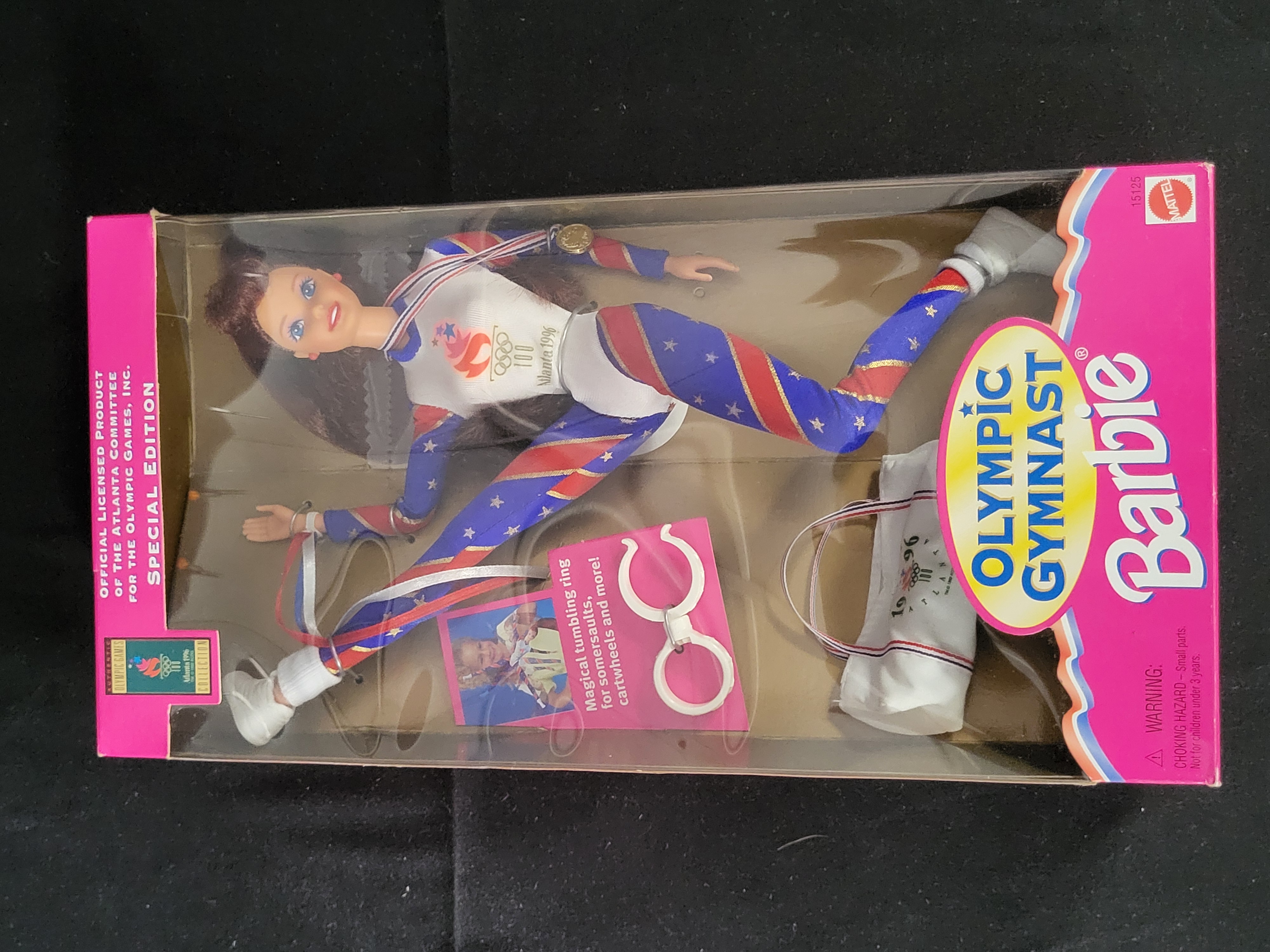 BID PER WHAT YOU SEE IN THE PHOTO, NOT THE AI GENERATED TITLES AND DESCRIPTIONS! A Mattel Olympic Gymnast Barbie, Special Edition produced for the 1996 Atlanta Centennial Olympic Games, model number 15125. The doll is dressed in a red, white, and blue leotard with a star pattern and the Atlanta 1996 logo. The set includes a plastic gold medal accessory, white sneakers, a branded gym bag, and a white plastic magical tumbling ring. The item is contained within its original retail packaging featuring official Olympic Games and Mattel branding.