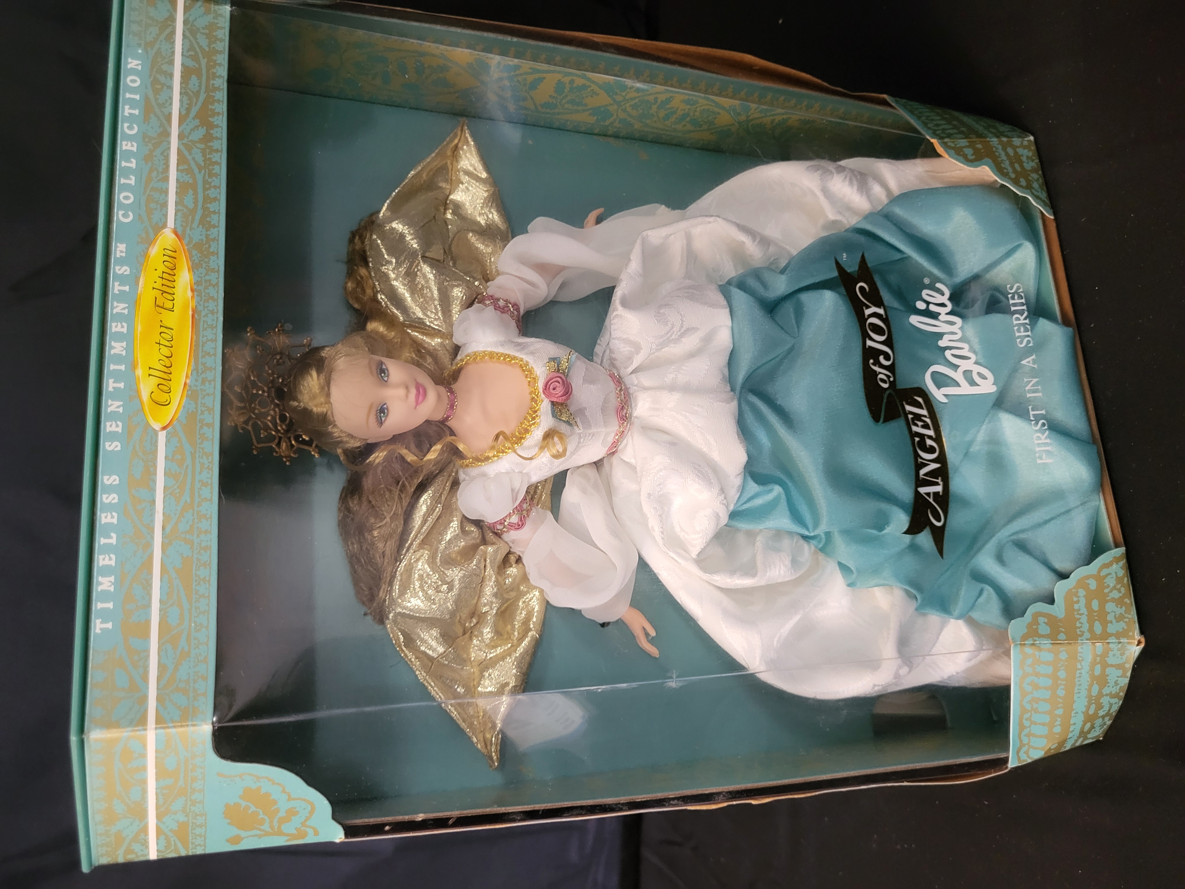 BID PER WHAT YOU SEE IN THE PHOTO, NOT THE AI GENERATED TITLES AND DESCRIPTIONS! A Mattel Collector Edition Barbie doll, identified as the Angel of Joy and the first release in the Timeless Sentiments Collection. The doll features blonde hair, a golden filigree headpiece, and large gold-tone fabric wings. It is dressed in a tiered white and teal gown with gold-tone trim and floral accents. The item is contained within its original teal-colored window box packaging, which features a quote from William Shakespeare’s Merchant of Venice on the reverse. The doll is factory-secured to the interior cardboard insert.