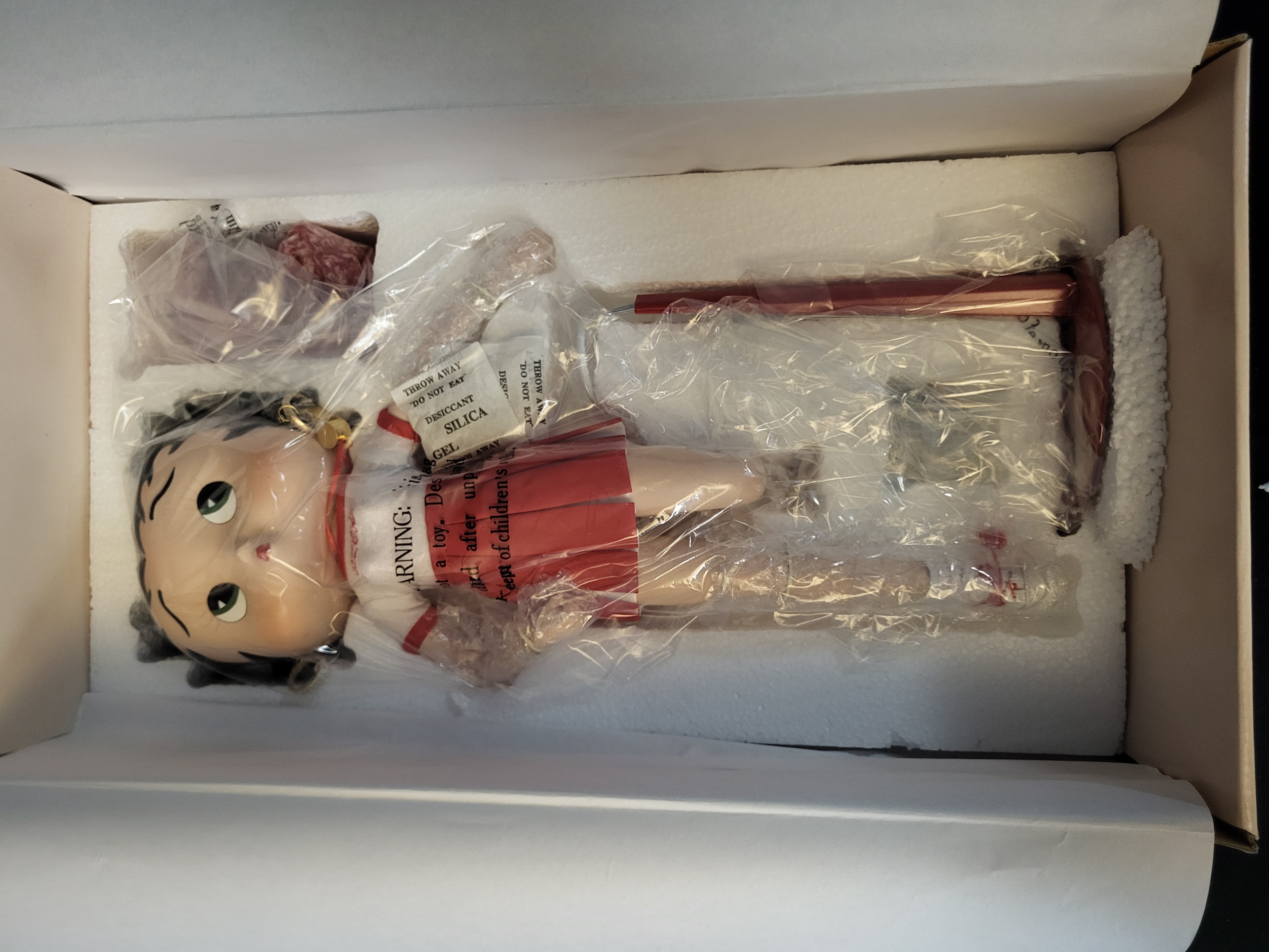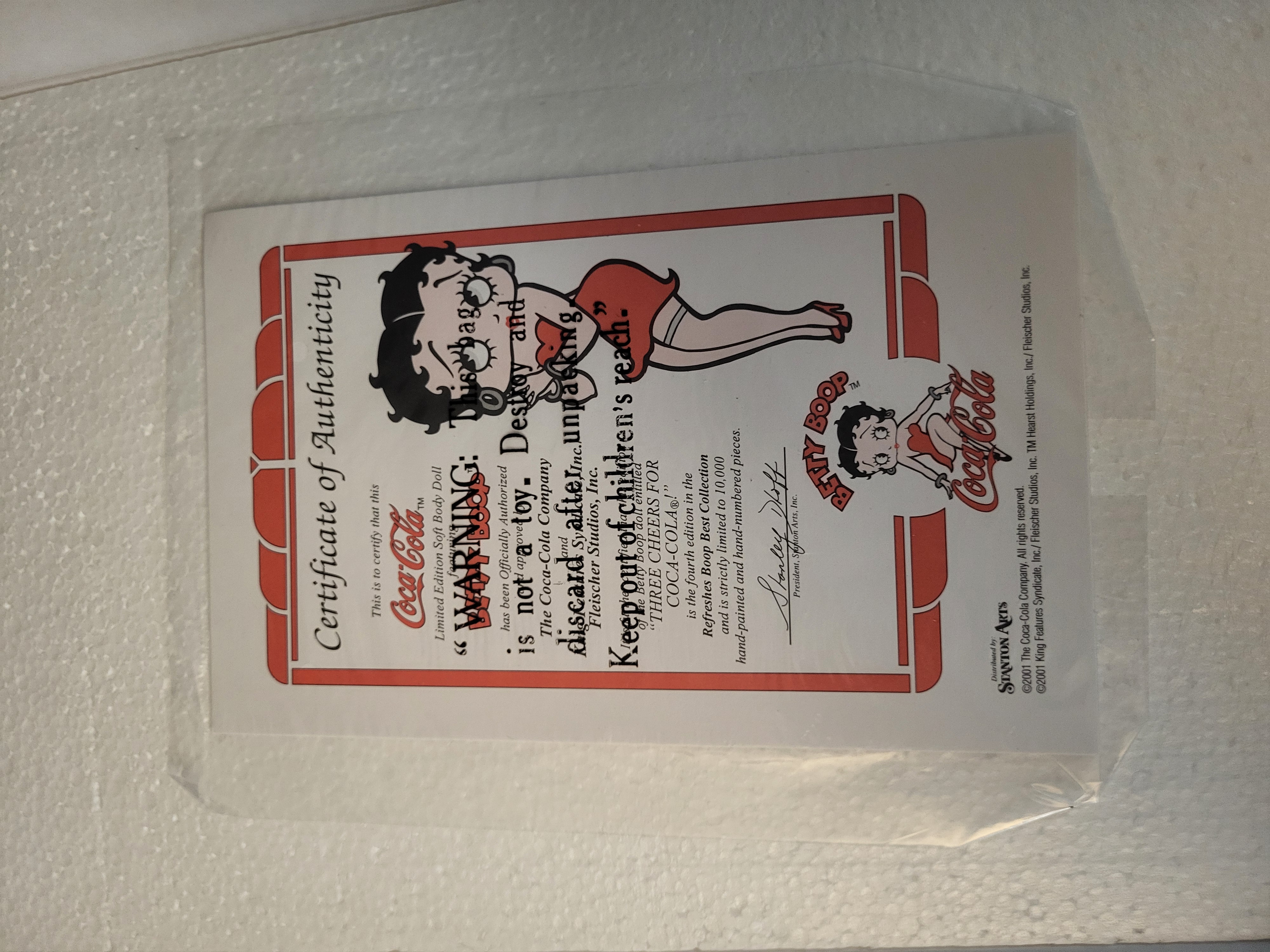 BID PER WHAT YOU SEE IN THE PHOTO, NOT THE AI GENERATED TITLES AND DESCRIPTIONS! Stanton Arts Refreshes Boop Best Collection Three Cheers for Coke! limited edition porcelain doll. This item is the fourth edition in the collection and is part of a hand-numbered series limited to 10,000 pieces. The doll features a hand-painted porcelain head and is dressed in a red and white fabric cheerleader outfit with an embroidered Coca-Cola logo. The lot includes the original retail box, protective styrofoam inserts, a doll stand, and a Certificate of Authenticity. The doll is partially wrapped in original protective plastic.