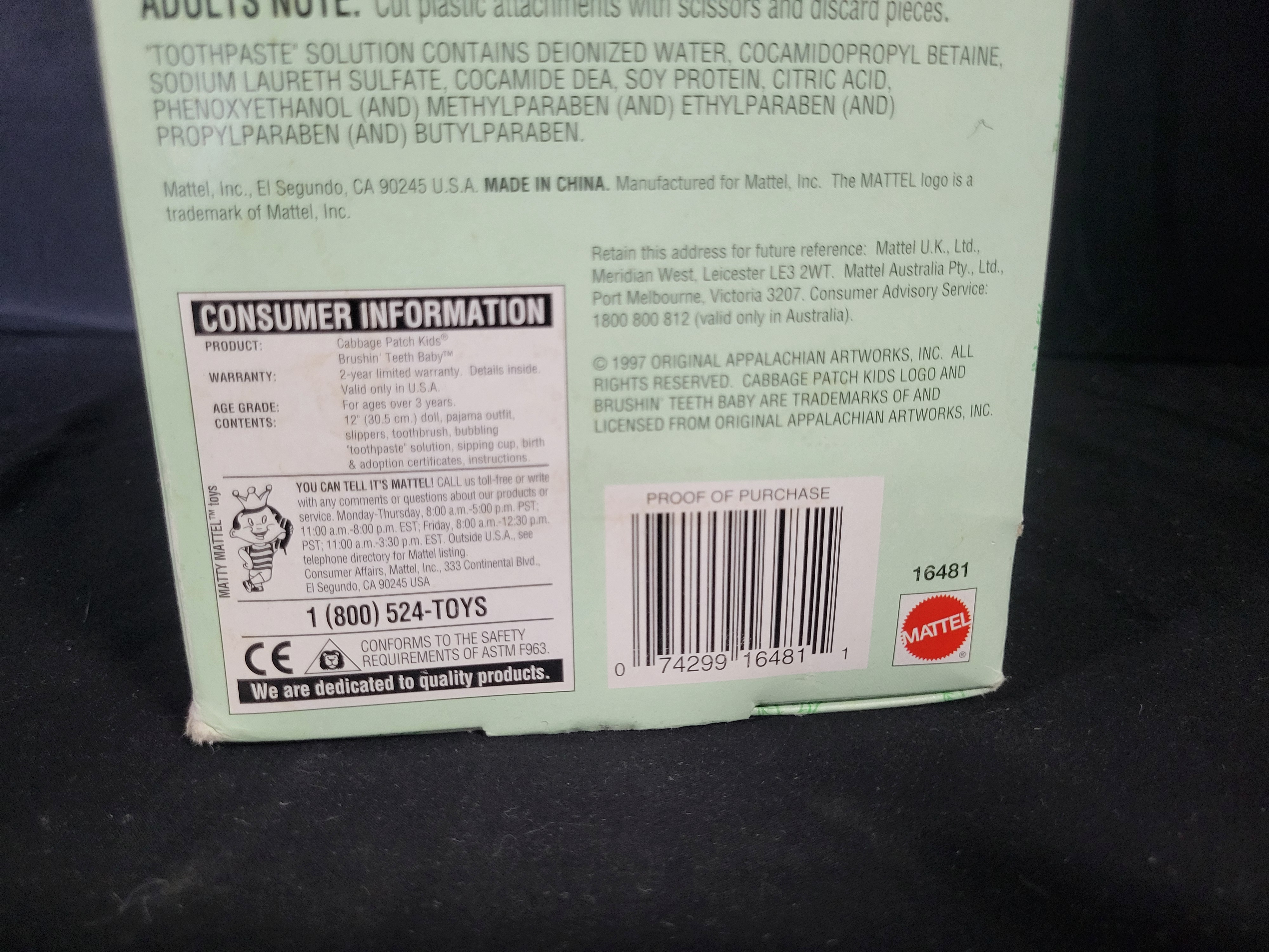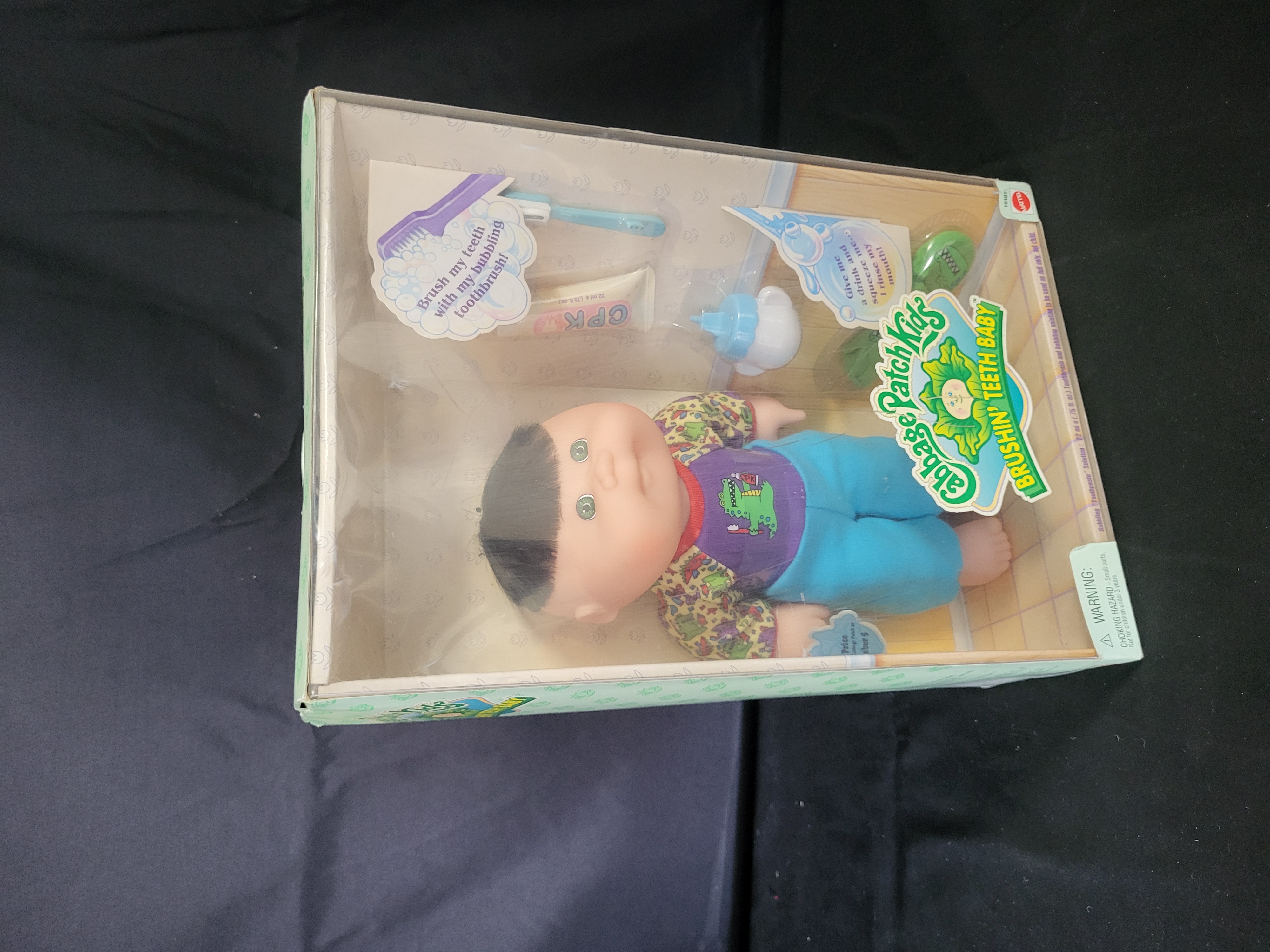 BID PER WHAT YOU SEE IN THE PHOTO, NOT THE AI GENERATED TITLES AND DESCRIPTIONS! This 1997 Mattel Cabbage Patch Kids Brushin’ Teeth Baby doll is presented in its original factory packaging. The 12-inch vinyl doll features dark hair and green eyes. The figure is dressed in a patterned shirt, a purple bib with a dinosaur motif, and blue pants. The set includes its original accessories: a bubbling toothbrush, a tube of CPK toothpaste solution, and a sipping cup. The packaging bears item number 16481 and a copyright notice for Original Appalachian Artworks, Inc. The doll remains secured to the original interior packaging.