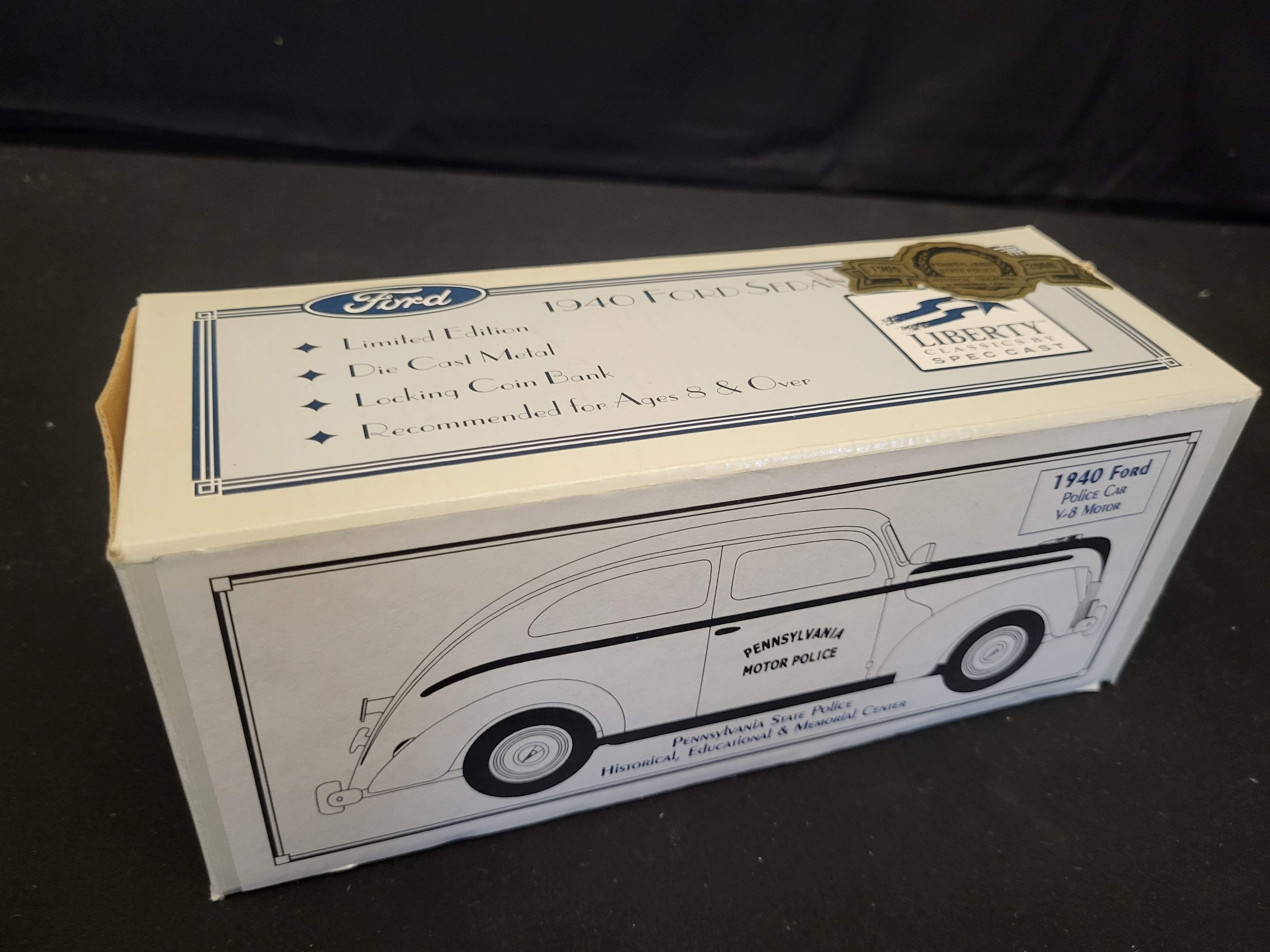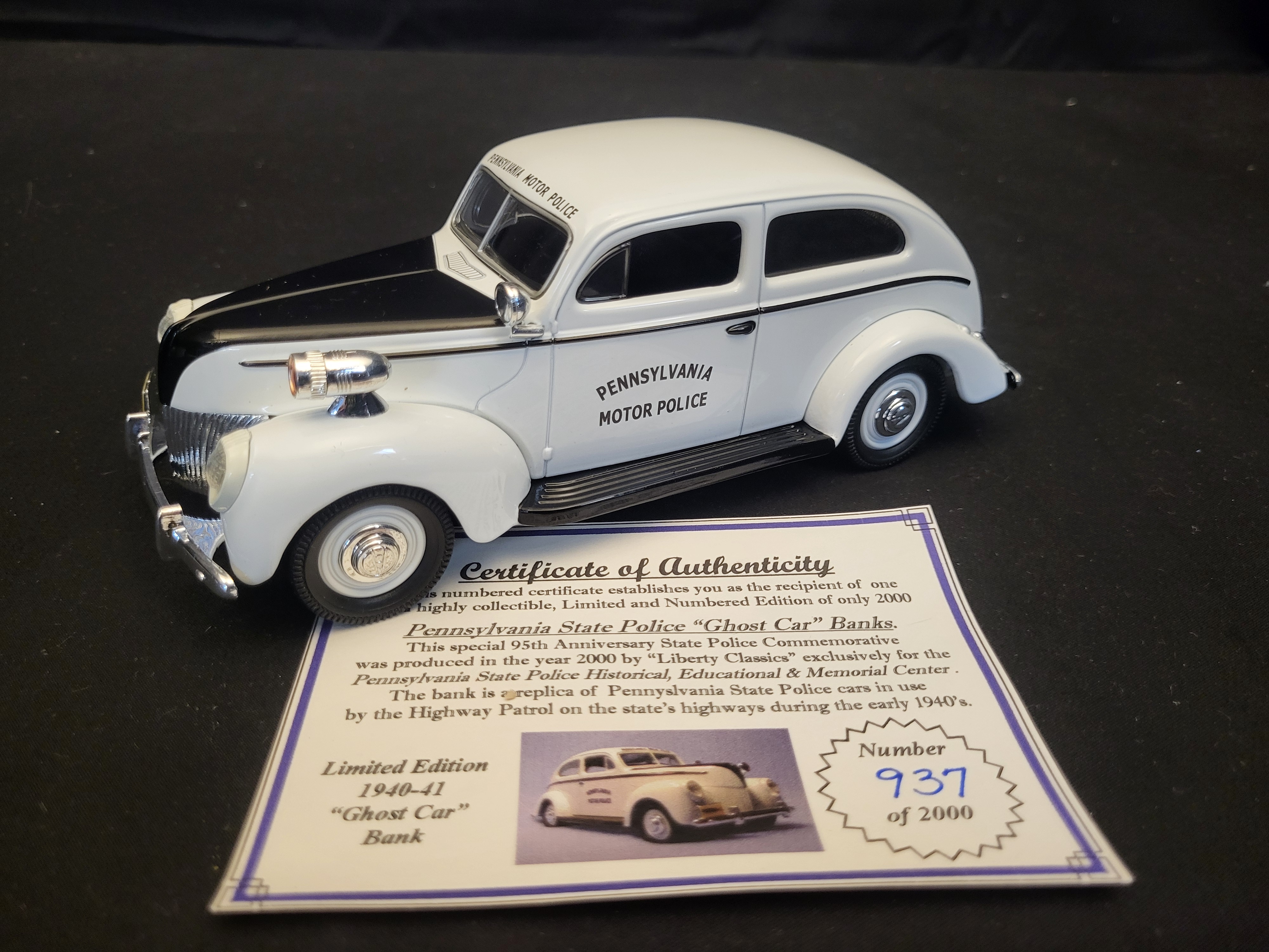 BID PER WHAT YOU SEE IN THE PHOTO, NOT THE AI GENERATED TITLES AND DESCRIPTIONS! A Liberty Classics die-cast metal locking coin bank replicating a 1940-41 Ford Sedan Ghost Car utilized by the Pennsylvania Motor Police. This model was commissioned as a 95th-anniversary commemorative piece for the Pennsylvania State Police Historical, Educational & Memorial Center in 2000. The vehicle features a white body with a black hood and side trim, detailed with PENNSYLVANIA MOTOR POLICE markings on the doors and above the windshield. The chassis is embossed with Liberty Classics, Dist. by Spec Cast, and 1940 FORD. It is identified as number 937 of a limited edition of 2,000, as stamped on the undercarriage and noted on the included Certificate of Authenticity. The lot includes the original decorative packaging and the original brass-tone locking key secured to the chassis.
