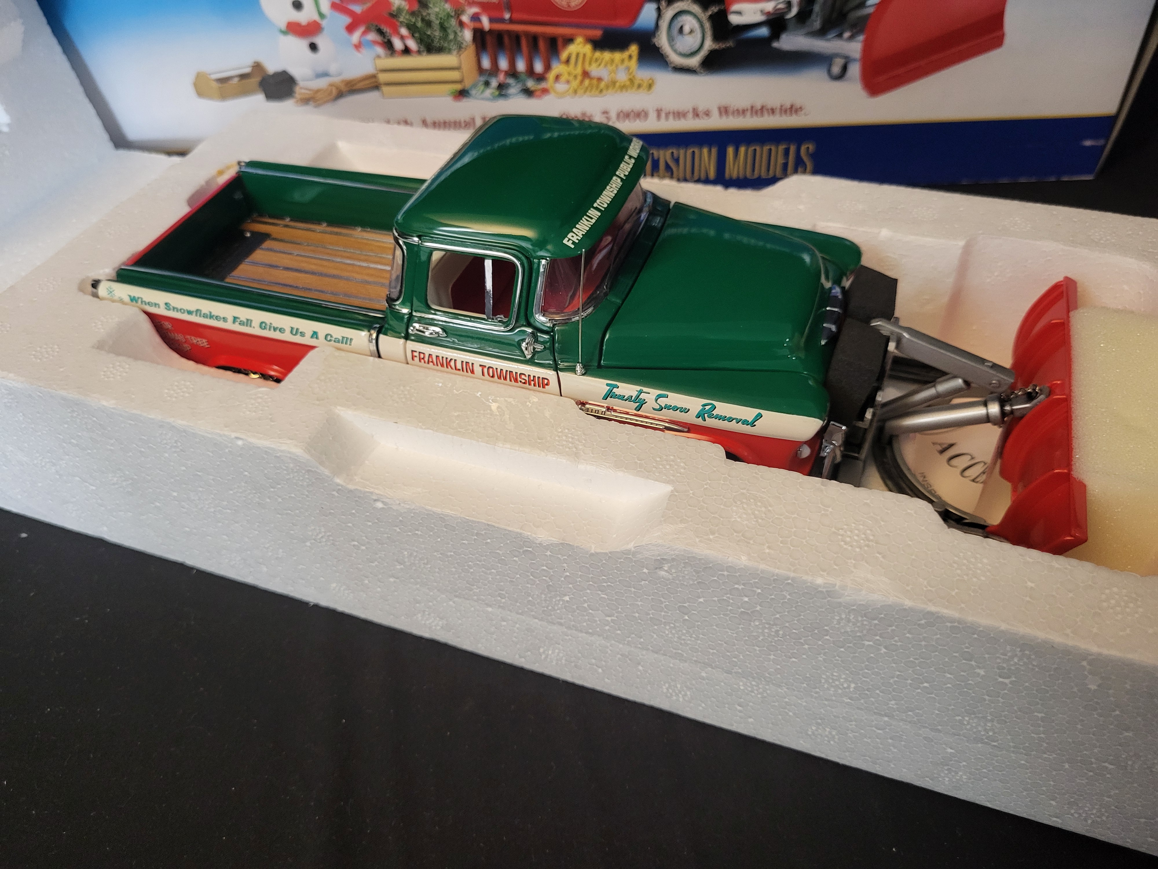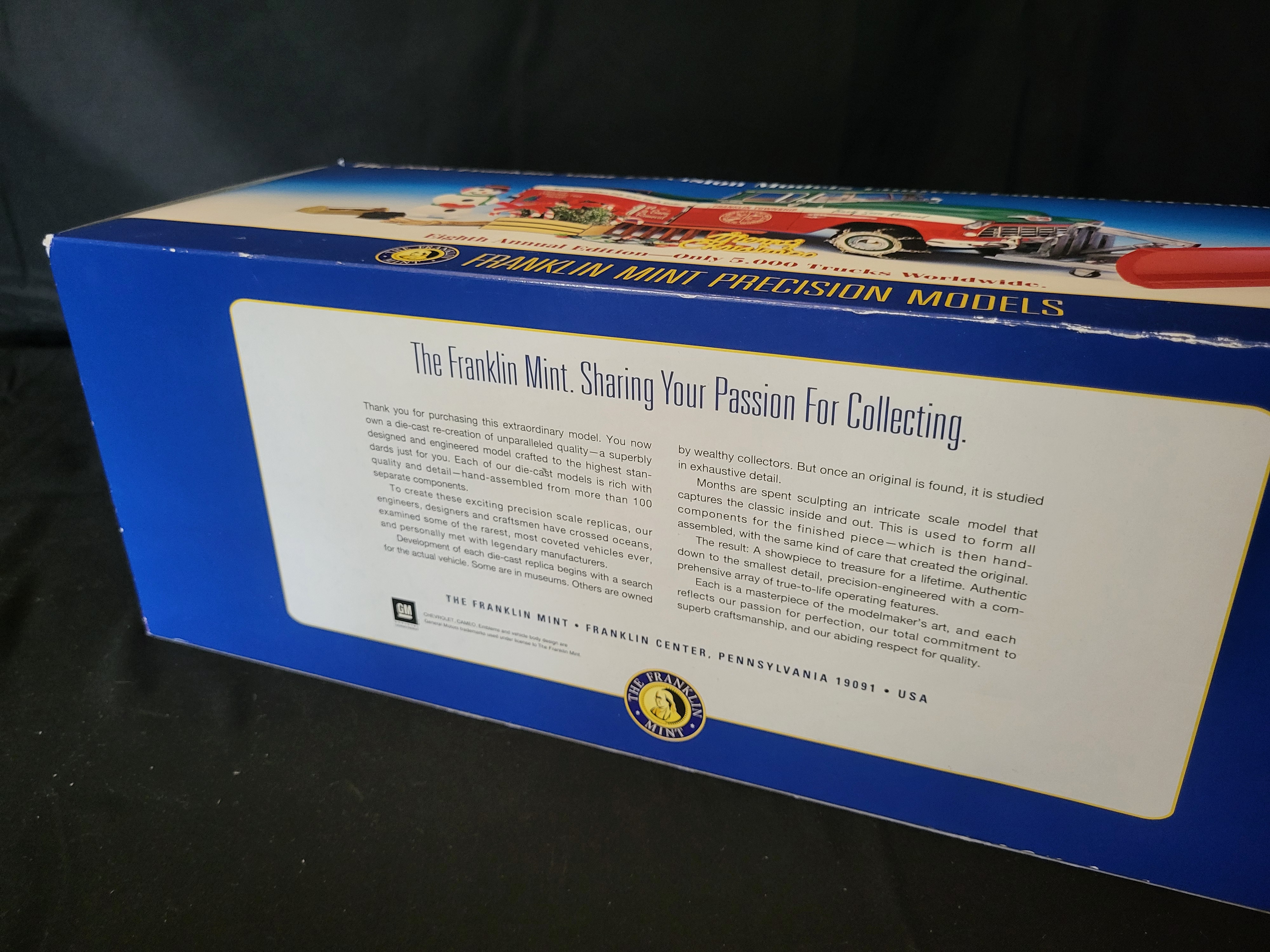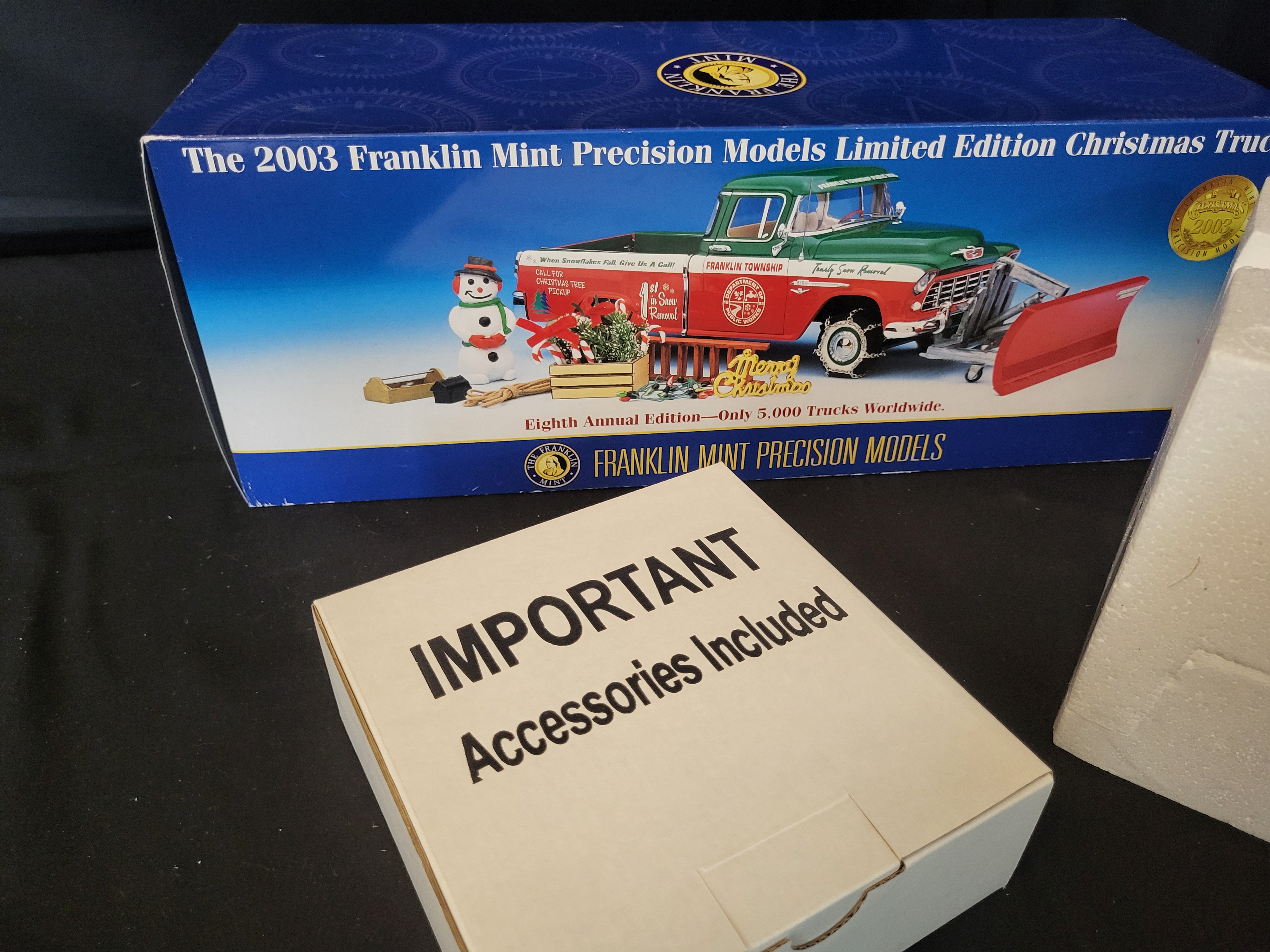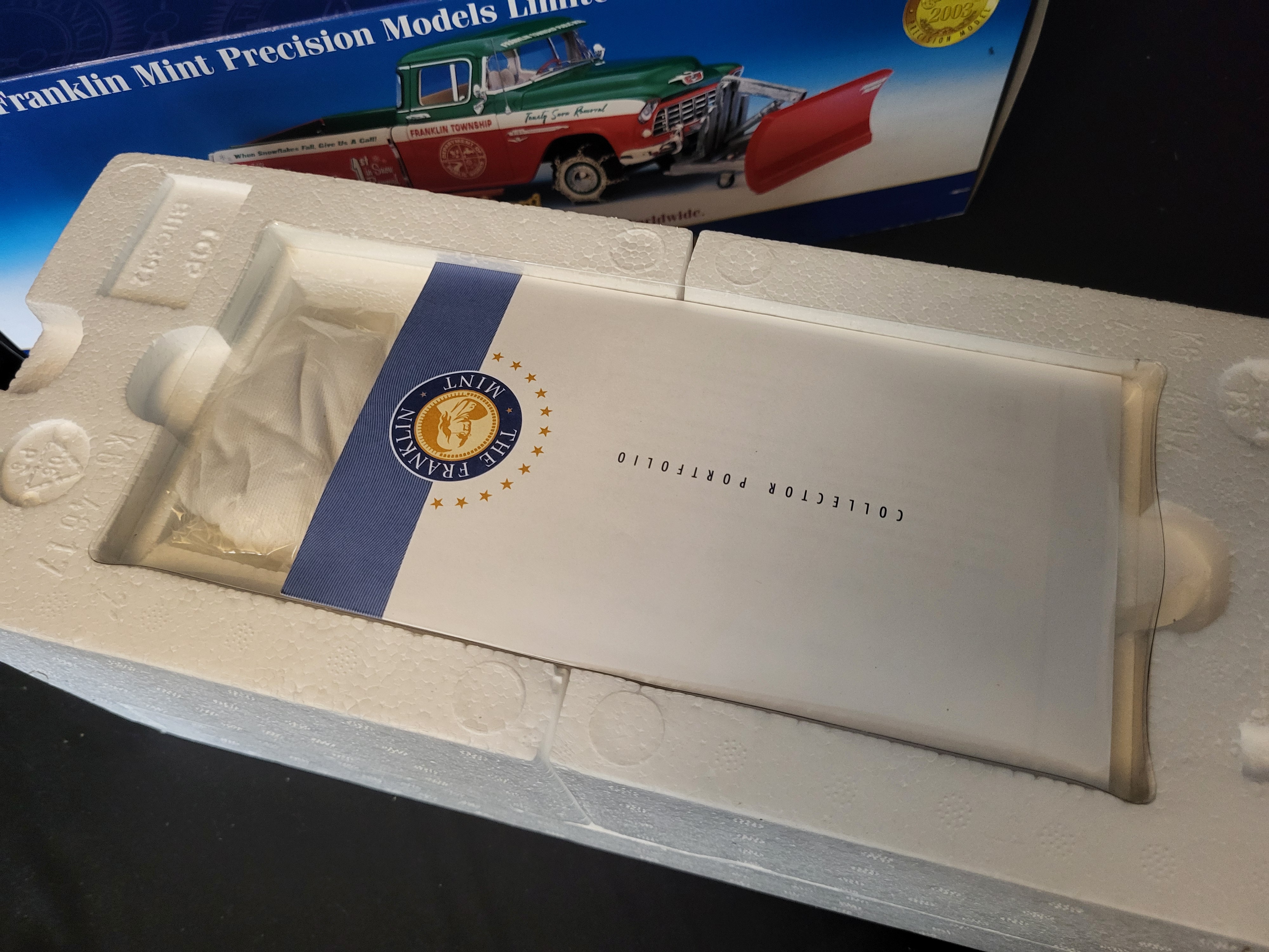 BID PER WHAT YOU SEE IN THE PHOTO, NOT THE AI GENERATED TITLES AND DESCRIPTIONS! This Franklin Mint Precision Models 1:24 scale die-cast model represents the 2003 Limited Edition Christmas Truck, identified as the Eighth Annual Edition. The model is a mid-1950s Chevrolet Cameo pickup truck featuring a green, red, and cream livery. Exterior details include Franklin Township Public Works door seals and Trusty Snow Removal decals on the hood. The vehicle is equipped with a front-mounted red snowplow and features a truck bed with simulated wood grain and metal dividers. This item is a limited edition with a total production of 5,000 units worldwide. The lot includes the original blue manufacturer box, internal styrofoam protective casing, a Collector Portfolio containing documentation, and a separate white box of accessories.