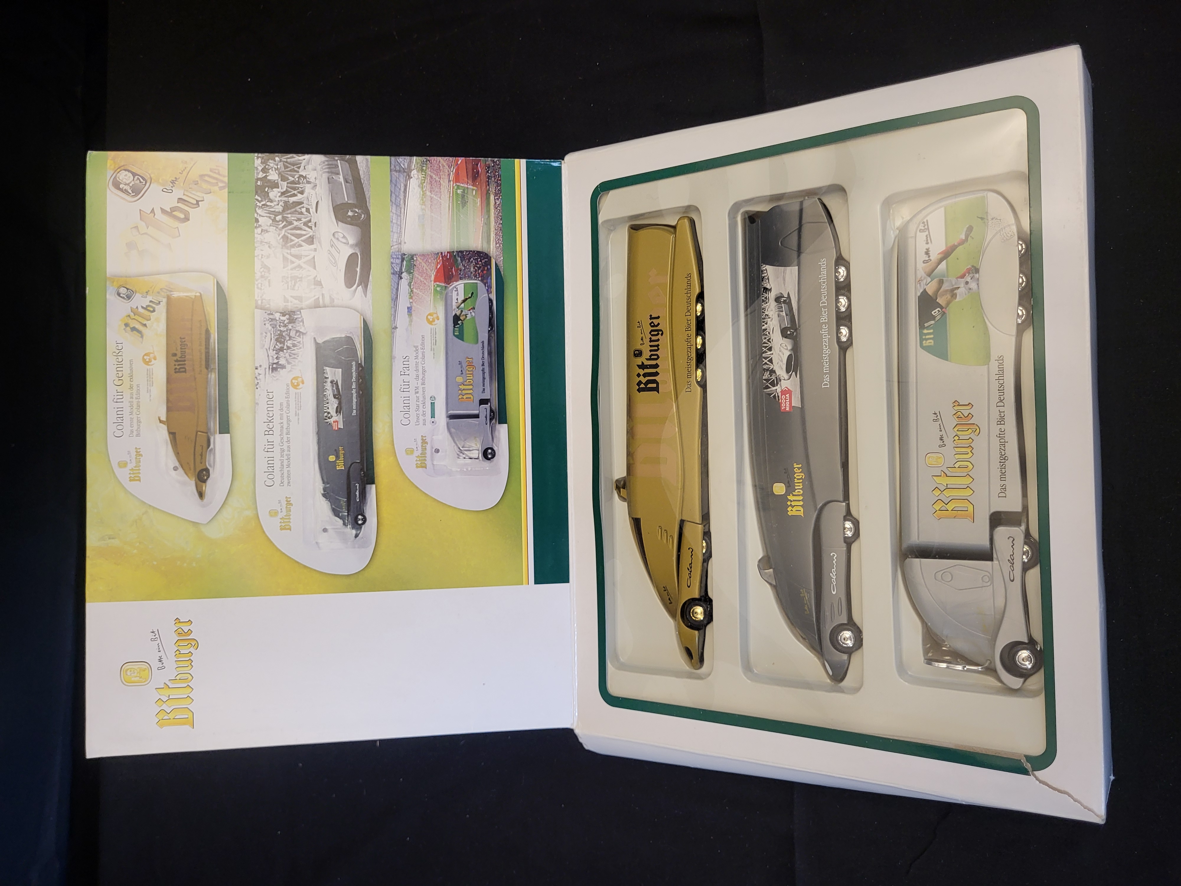 BID PER WHAT YOU SEE IN THE PHOTO, NOT THE AI GENERATED TITLES AND DESCRIPTIONS! A trio of promotional die-cast model tractor-trailers designed by Luigi Colani for the Bitburger brewery. The set includes three distinct futuristic aerodynamic designs in metallic gold, charcoal, and silver finishes. Each model features Bitburger branding and the German slogan Das meistgezapfte Bier Deutschlands. The charcoal model includes 1000 Miglia racing graphics, and the silver model features soccer-themed imagery. Each tractor unit bears the Colani signature mark. The collection is housed in the original Colani für Fans illustrated presentation box with a custom plastic inlay.
