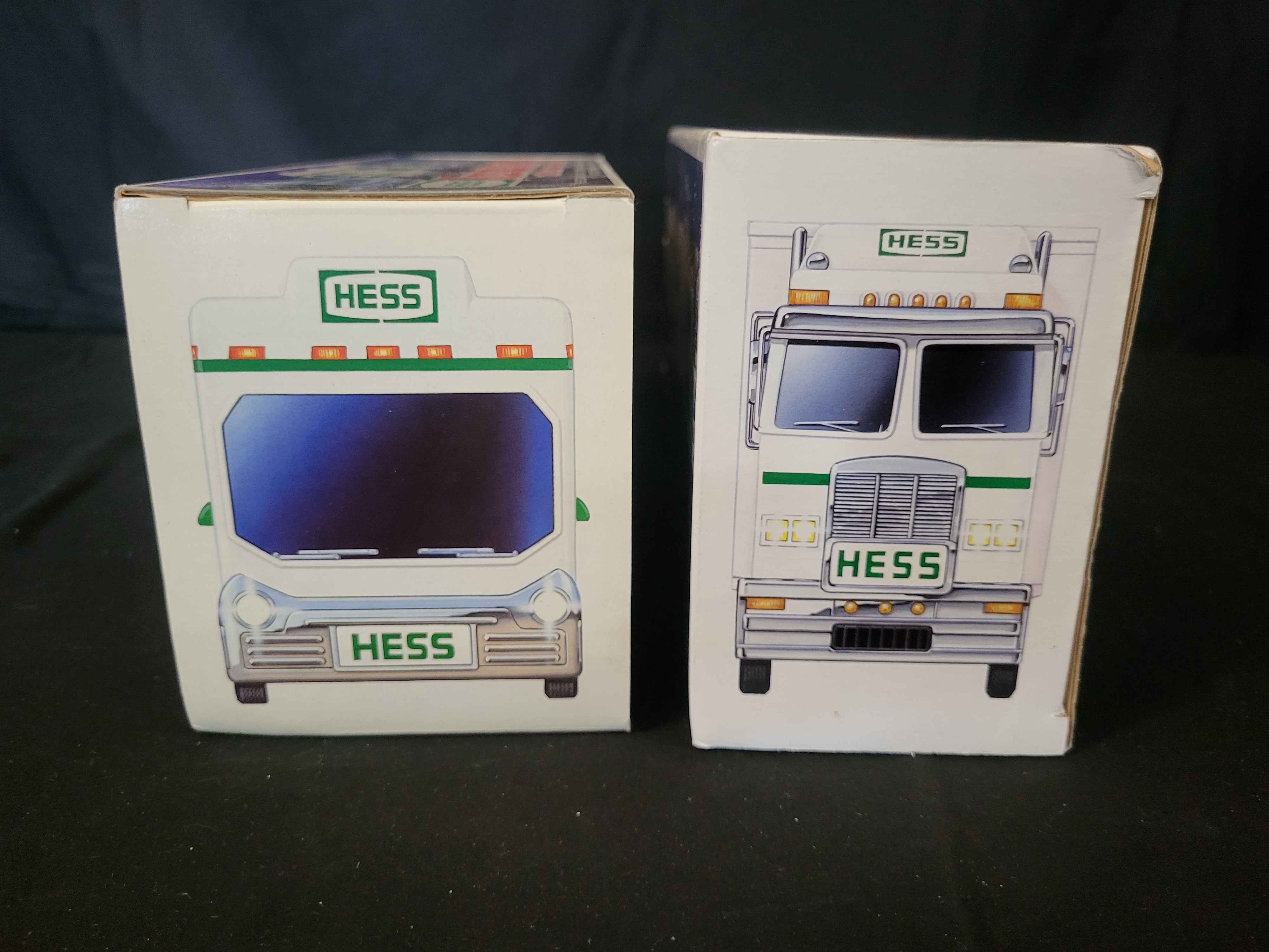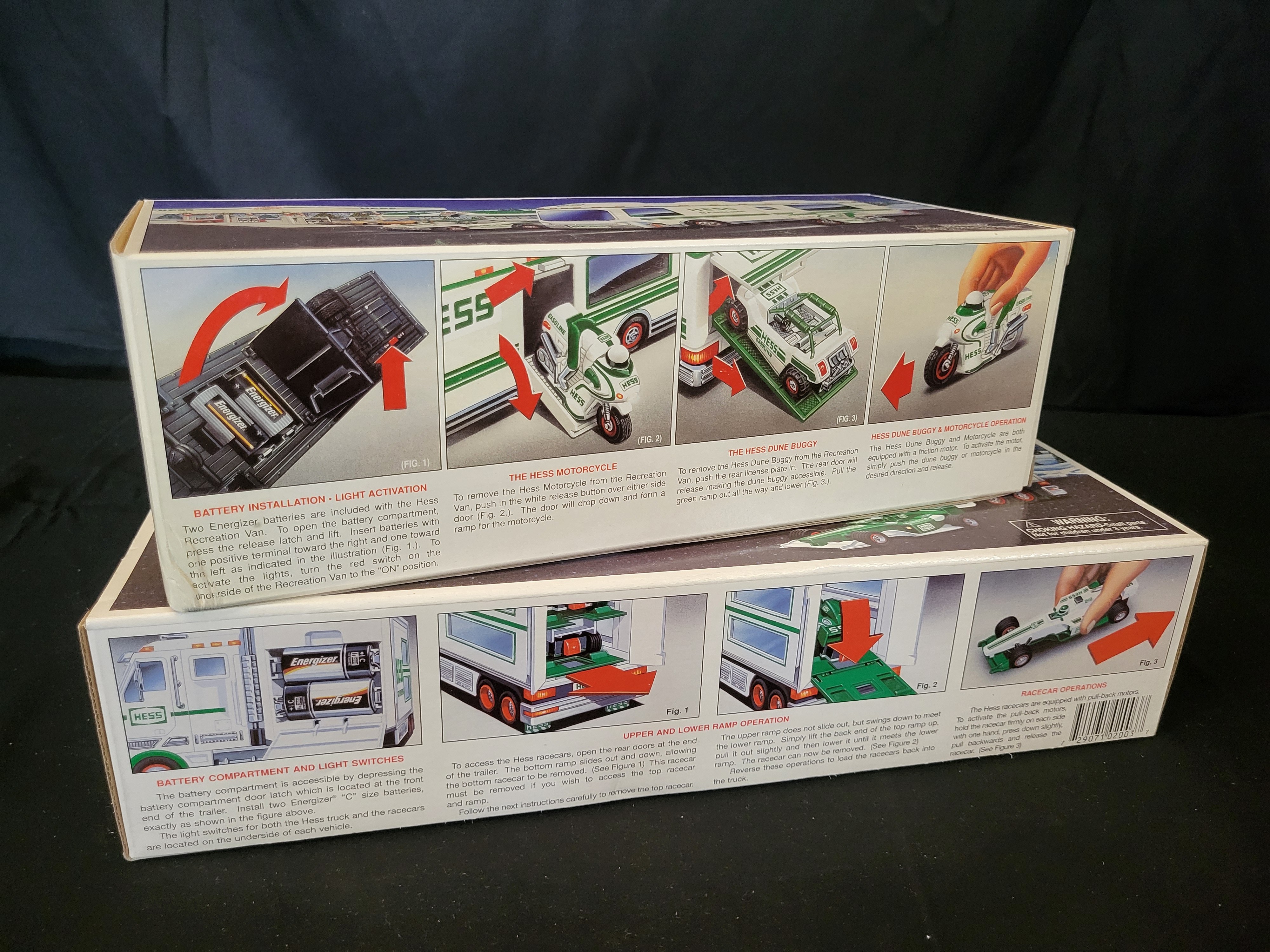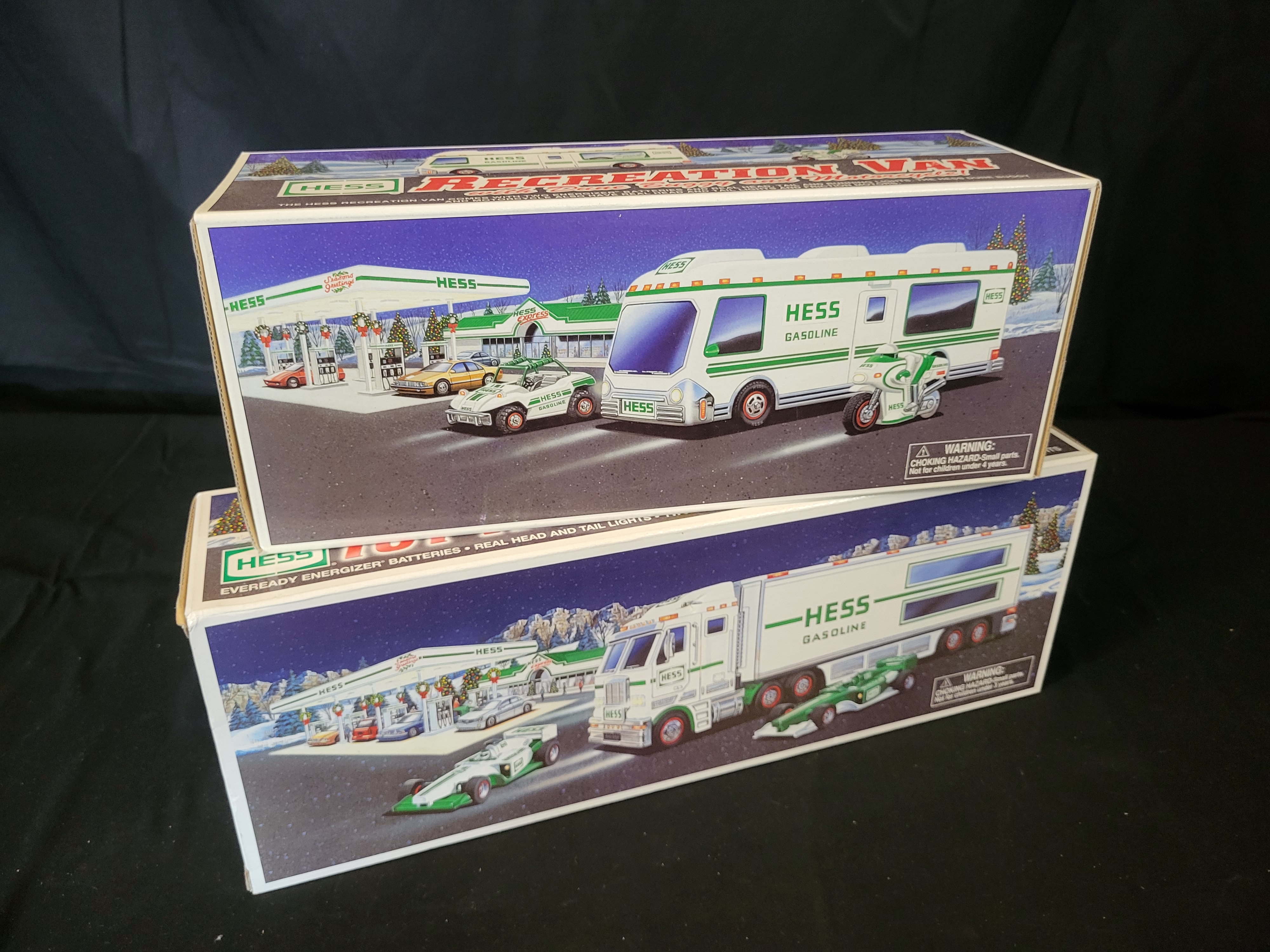 BID PER WHAT YOU SEE IN THE PHOTO, NOT THE AI GENERATED TITLES AND DESCRIPTIONS! A group of two Hess toy vehicle sets in their original retail packaging, featuring a 1998 Hess Recreation Van with Dune Buggy and Motorcycle and a 2003 Hess Toy Truck and Racecars. Both sets are finished in the traditional green and white Hess Gasoline livery. The 1998 Recreation Van set includes a van with internal storage for a friction-powered motorcycle and a pull-back dune buggy, accessible via side and rear ramps. The 2003 Toy Truck and Racecars set consists of a tractor-trailer designed to carry two pull-back racecars on dual internal ramps. Both sets are equipped with functional headlights and taillights. The packaging for each set includes detailed illustrations and operating instructions on the reverse side.