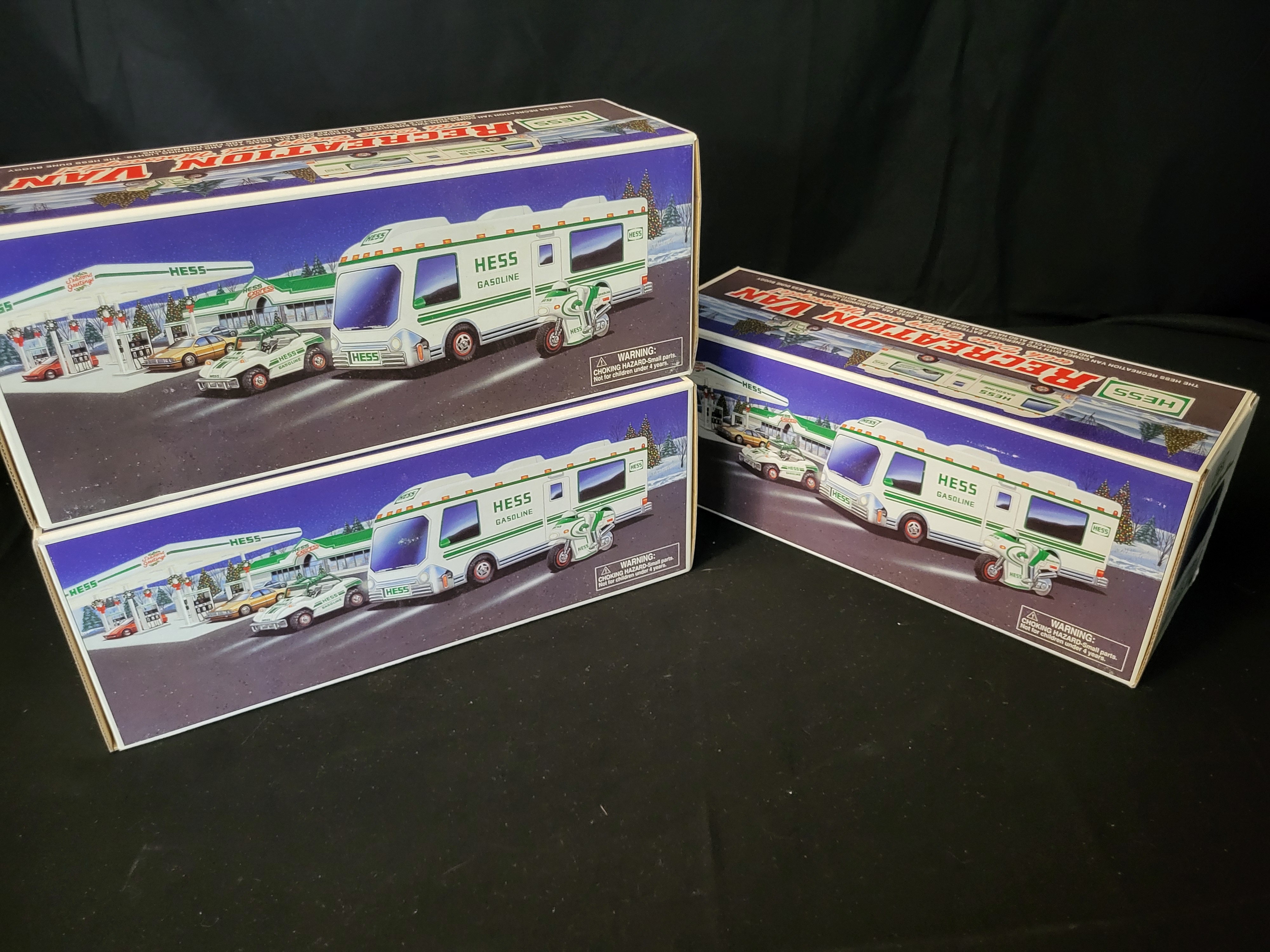 BID PER WHAT YOU SEE IN THE PHOTO, NOT THE AI GENERATED TITLES AND DESCRIPTIONS! A trio of 1998 Hess Recreation Van toy vehicle sets, each contained within its original retail packaging. Each set features a large recreation van accompanied by a smaller dune buggy and a motorcycle. The vehicles are finished in the signature Hess Gasoline color palette of white, green, and red. The recreation van is constructed with battery-operated head and tail lights, while the smaller dune buggy and motorcycle units are equipped with friction motors for manual operation. The cardboard packaging displays vibrant color illustrations of the vehicles at a decorated Hess service station. The underside of each box includes detailed technical diagrams and operating instructions for battery installation and the deployment of the smaller vehicles.