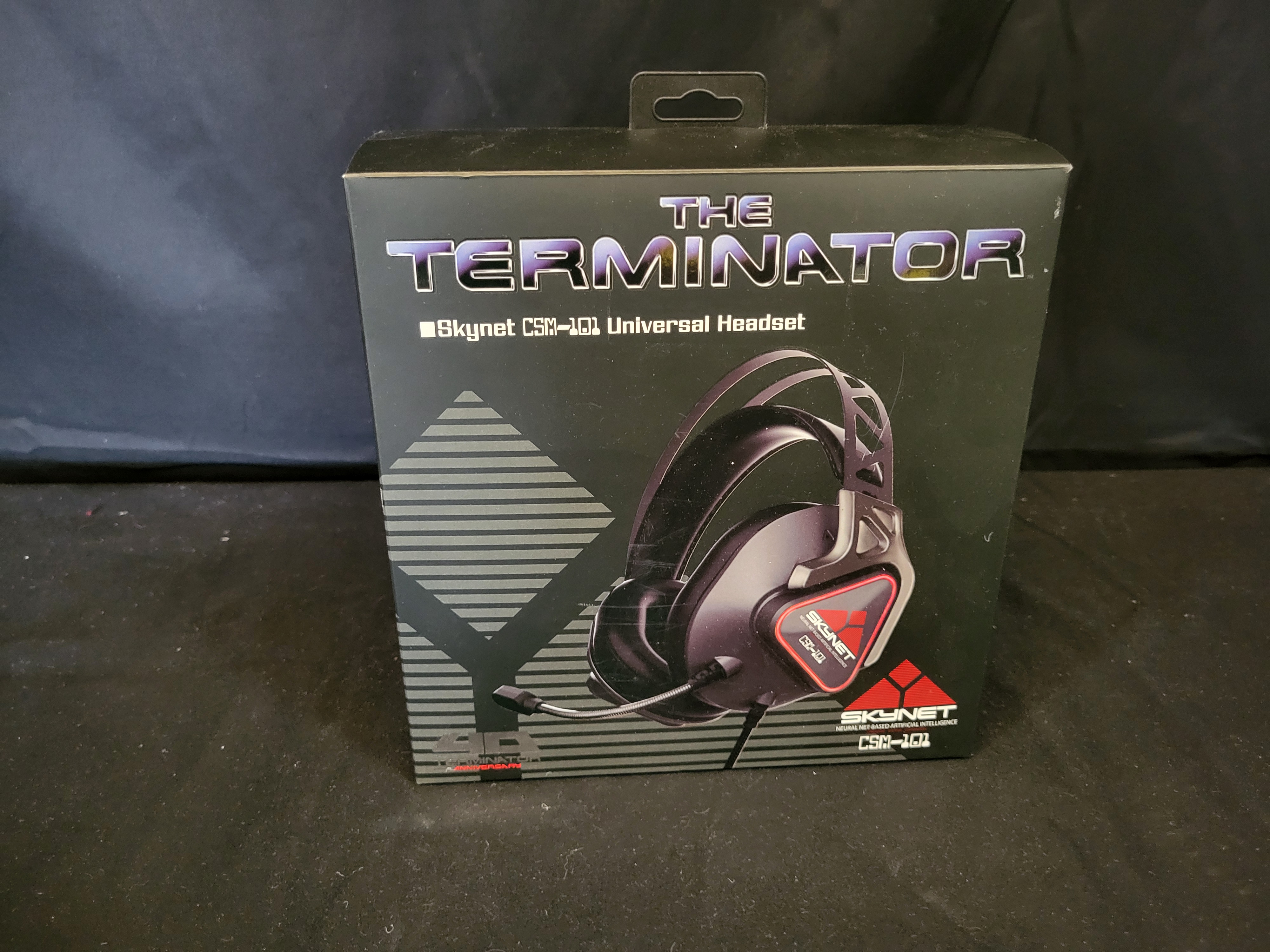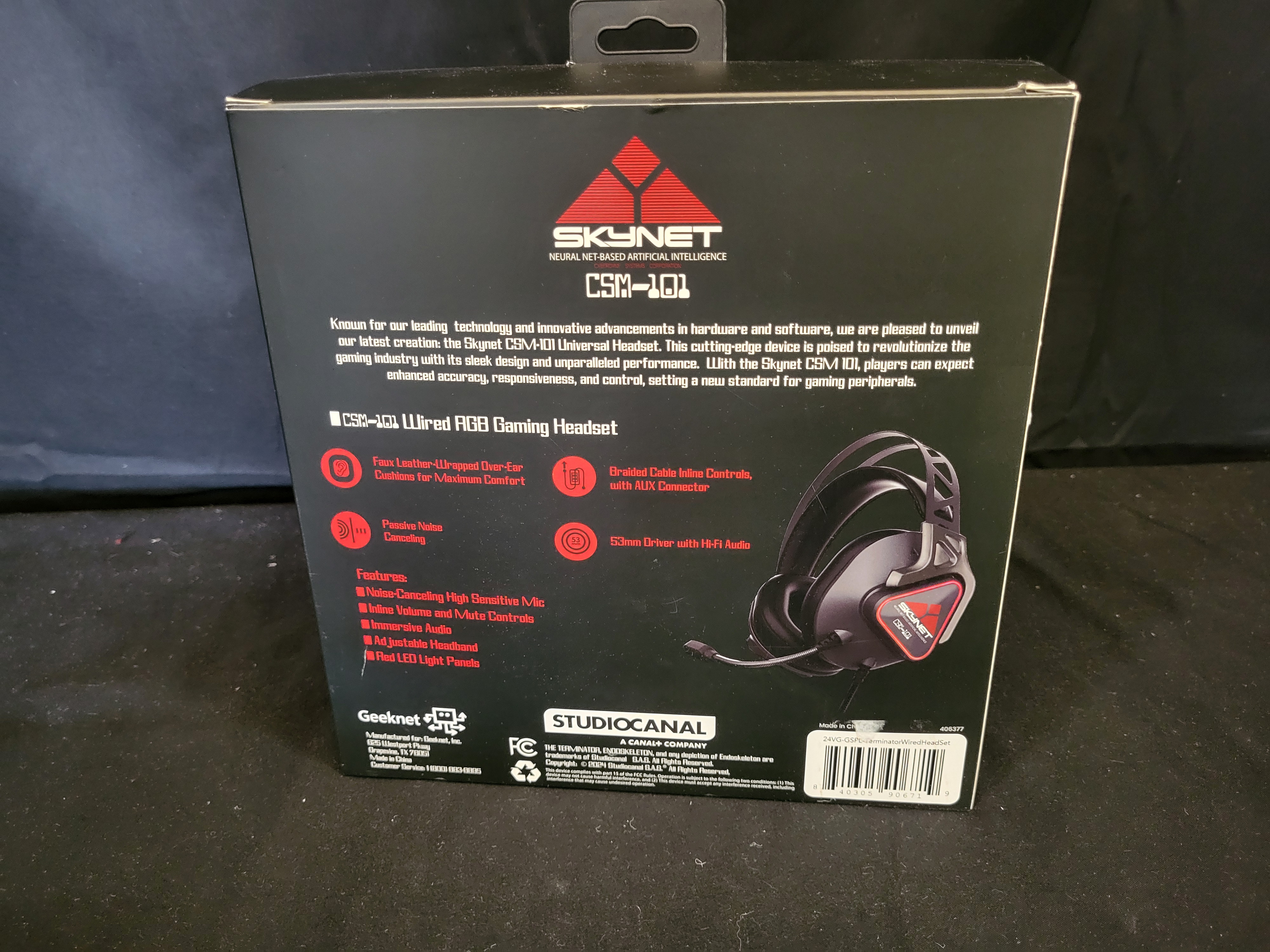 BID PER WHAT YOU SEE IN THE PHOTO, NOT THE AI GENERATED TITLES AND DESCRIPTIONS! A Geeknet Terminator 40th Anniversary SKYNET LED Gaming Headset, produced as a GameStop exclusive. This wired RGB gaming peripheral features a black and red color scheme and is equipped with faux leather-wrapped over-ear cushions, a 53mm driver for Hi-Fi audio, and a passive noise-canceling microphone. The construction includes an adjustable headband, red LED light panels, and a braided cable with inline volume and mute controls. The original retail packaging displays The Terminator branding, a 40th-anniversary commemorative logo, and Skynet CSM-101 model designations. The reverse of the box provides technical specifications and lists manufacturer information for Geeknet, Inc., with licensing attributed to StudioCanal. The packaging carries a copyright date of 2024.