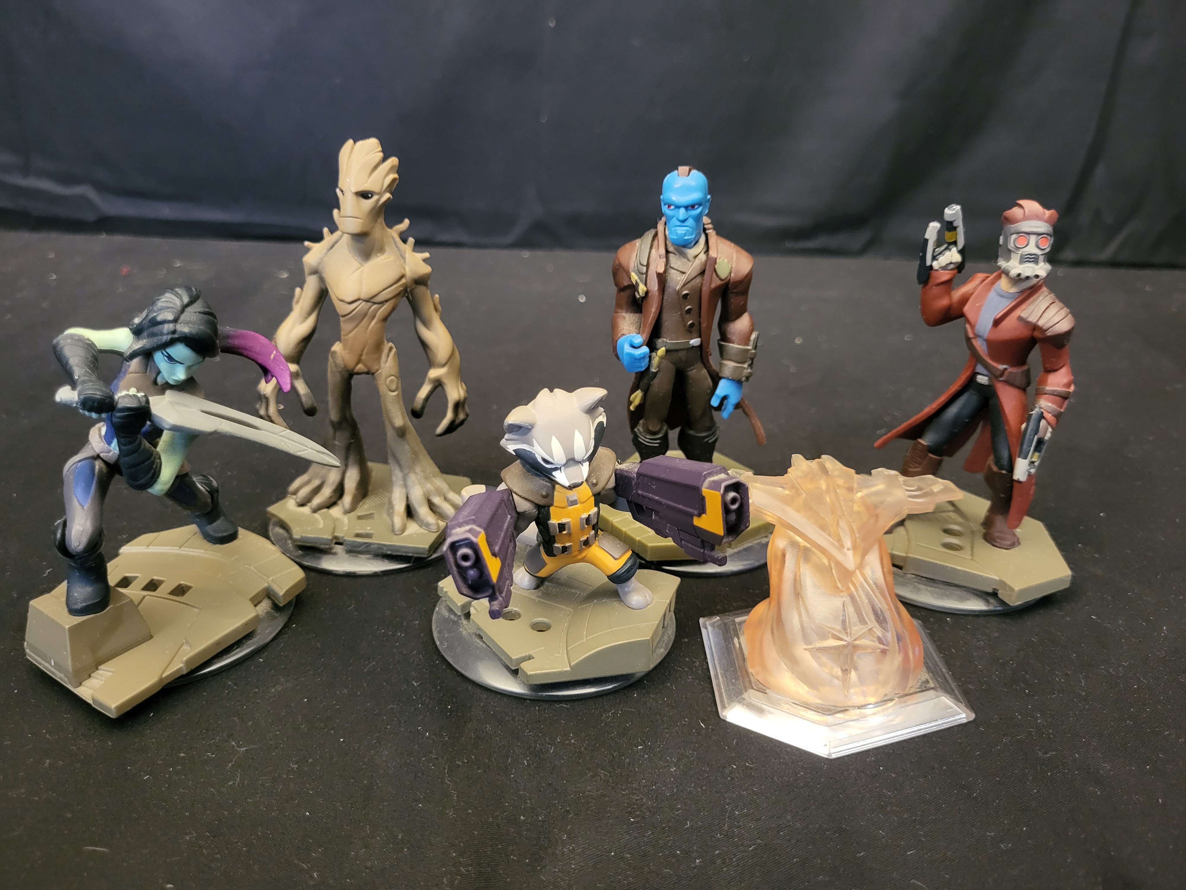 BID PER WHAT YOU SEE IN THE PHOTO, NOT THE AI GENERATED TITLES AND DESCRIPTIONS! A collection of molded plastic figurines and an accessory from the Disney Infinity 2.0 Marvel Super Heroes series, featuring characters from Marvel’s Guardians of the Galaxy. The group includes figures depicting Star-Lord, Rocket Raccoon, Groot, Gamora, and Yondu. Each figure is secured to a circular base with sculpted terrain. The collection also contains a translucent orange hexagonal Play Set piece. The figures are rendered in a distinct, stylized aesthetic consistent with the video game line.