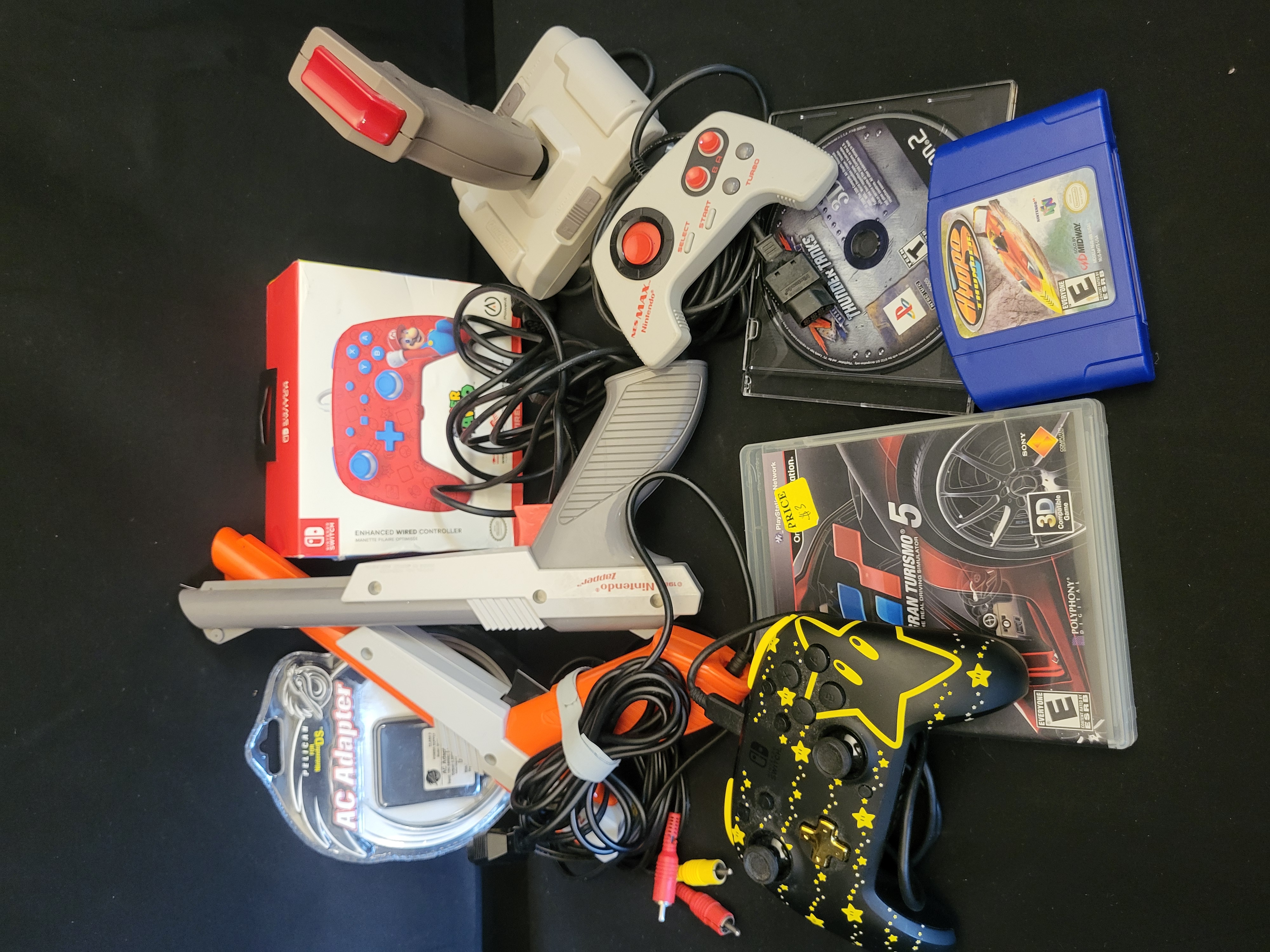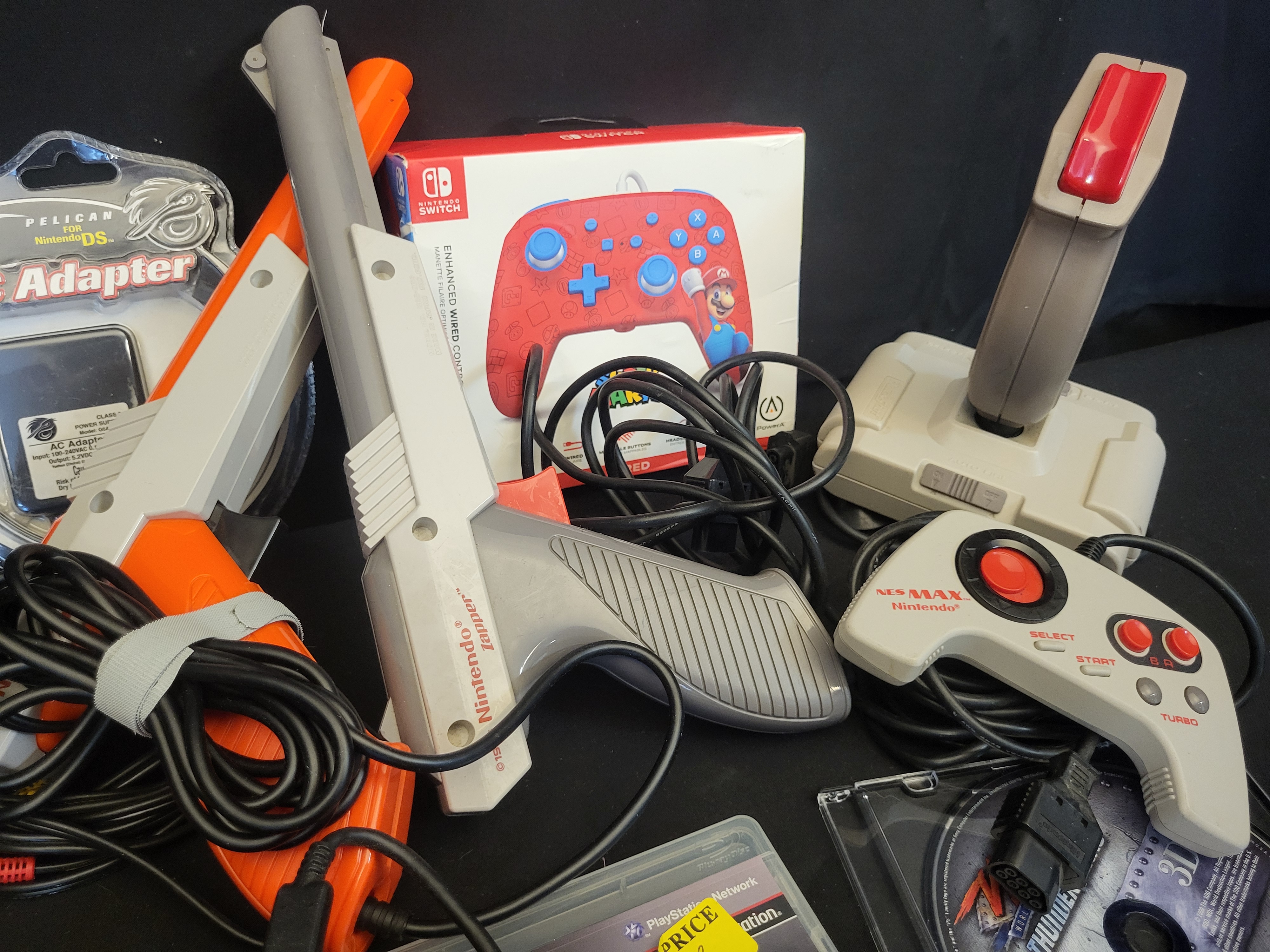 BID PER WHAT YOU SEE IN THE PHOTO, NOT THE AI GENERATED TITLES AND DESCRIPTIONS! A collection of vintage and modern video game hardware, controllers, and software. The assortment includes Nintendo Zapper light guns in grey and orange, an NES Max controller, and an NES Advantage joystick. Modern hardware features a boxed PowerA Mario themed wired controller for Nintendo Switch and an additional unboxed Switch controller with yellow star motifs. Software titles include Gran Turismo 5 for PlayStation 3, a Hydro Thunder cartridge for Nintendo 64 in a blue casing, and a loose Thunder Tanks disc for PlayStation 2. Completing the lot is a Pelican AC adapter for Nintendo DS in its original blister packaging and assorted connection cables.
