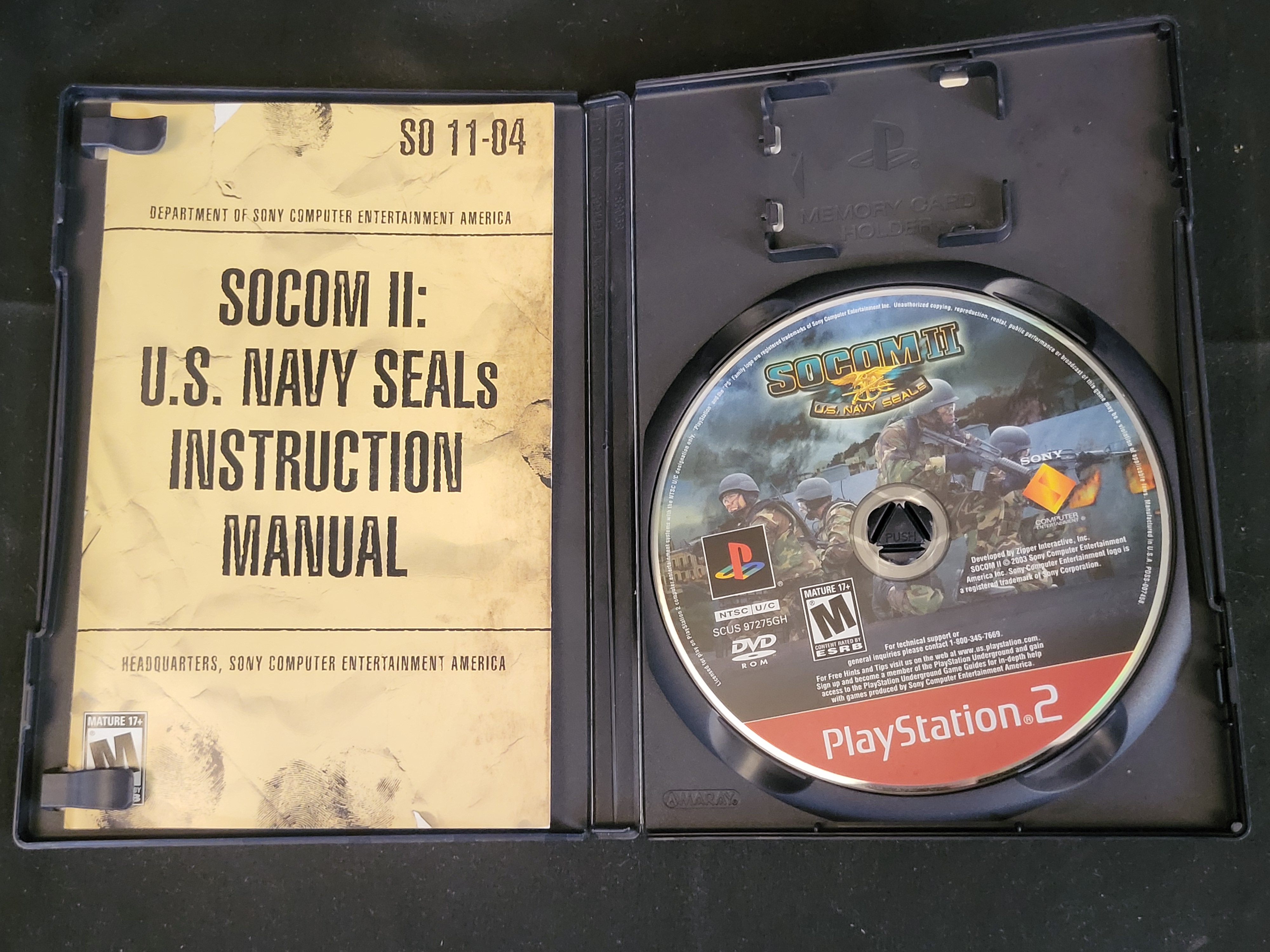 BID PER WHAT YOU SEE IN THE PHOTO, NOT THE AI GENERATED TITLES AND DESCRIPTIONS! SOCOM II: U.S. Navy SEALs for the PlayStation 2 console, developed by Zipper Interactive and published by Sony Computer Entertainment America in 2003. This lot comprises the original plastic case with paper cover art, the printed instruction manual, and the NTSC U/C format DVD-ROM game disc. The cover art features military-themed graphics and an ESRB rating of M for Mature 17+. The disc is labeled with the identifier SCUS 97275GH.