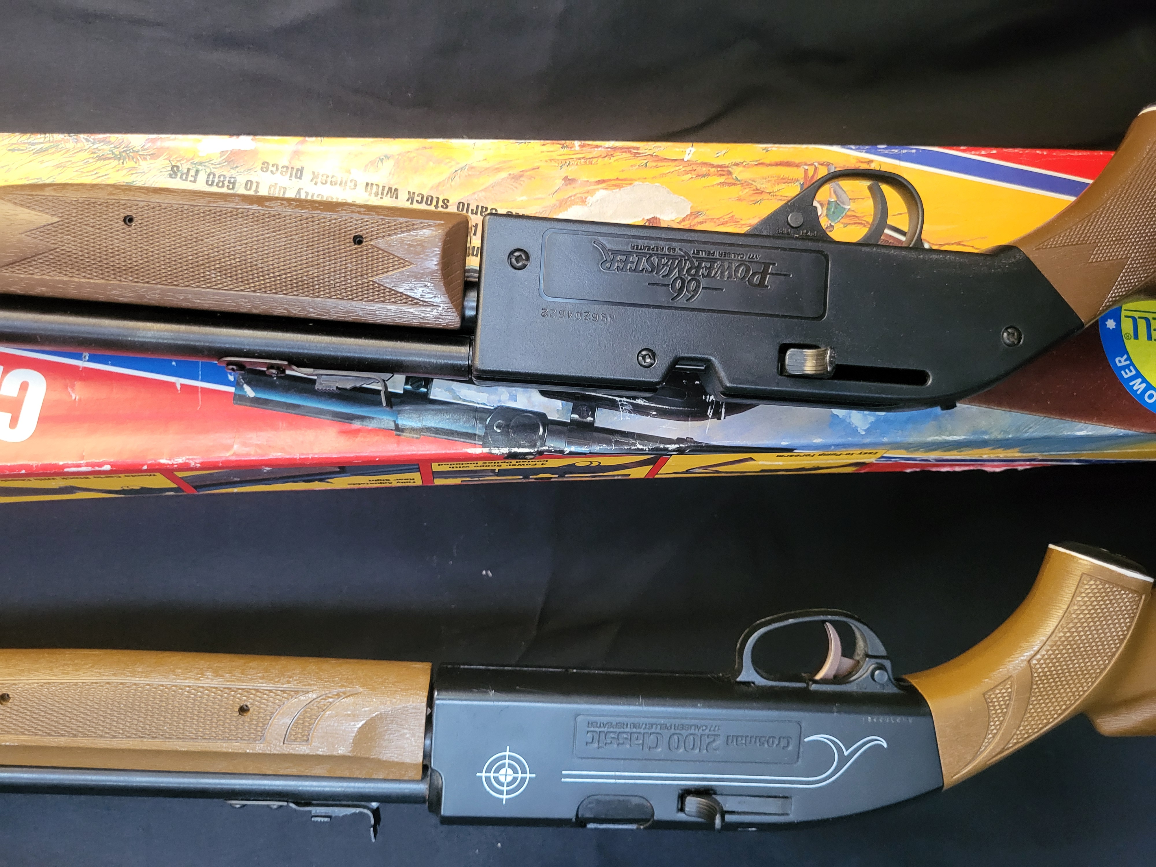 BID PER WHAT YOU SEE IN THE PHOTO, NOT THE AI GENERATED TITLES AND DESCRIPTIONS! A pair of Crosman multi-pump pneumatic air rifles, comprising a Powermaster 66 model and a 2100 Classic model. Both rifles are designed as .177 caliber pellet and BB repeaters. The construction features synthetic stocks and forearms with a molded wood-grain texture, paired with black-finished metal barrels and receivers. The Powermaster 66 receiver is marked with the model name and includes a Monte Carlo style stock. The 2100 Classic receiver features a white target crosshair graphic and decorative scrollwork. The Powermaster 66 is accompanied by its original color-printed retail box, which specifies features such as variable pump power and velocity up to 680 FPS.